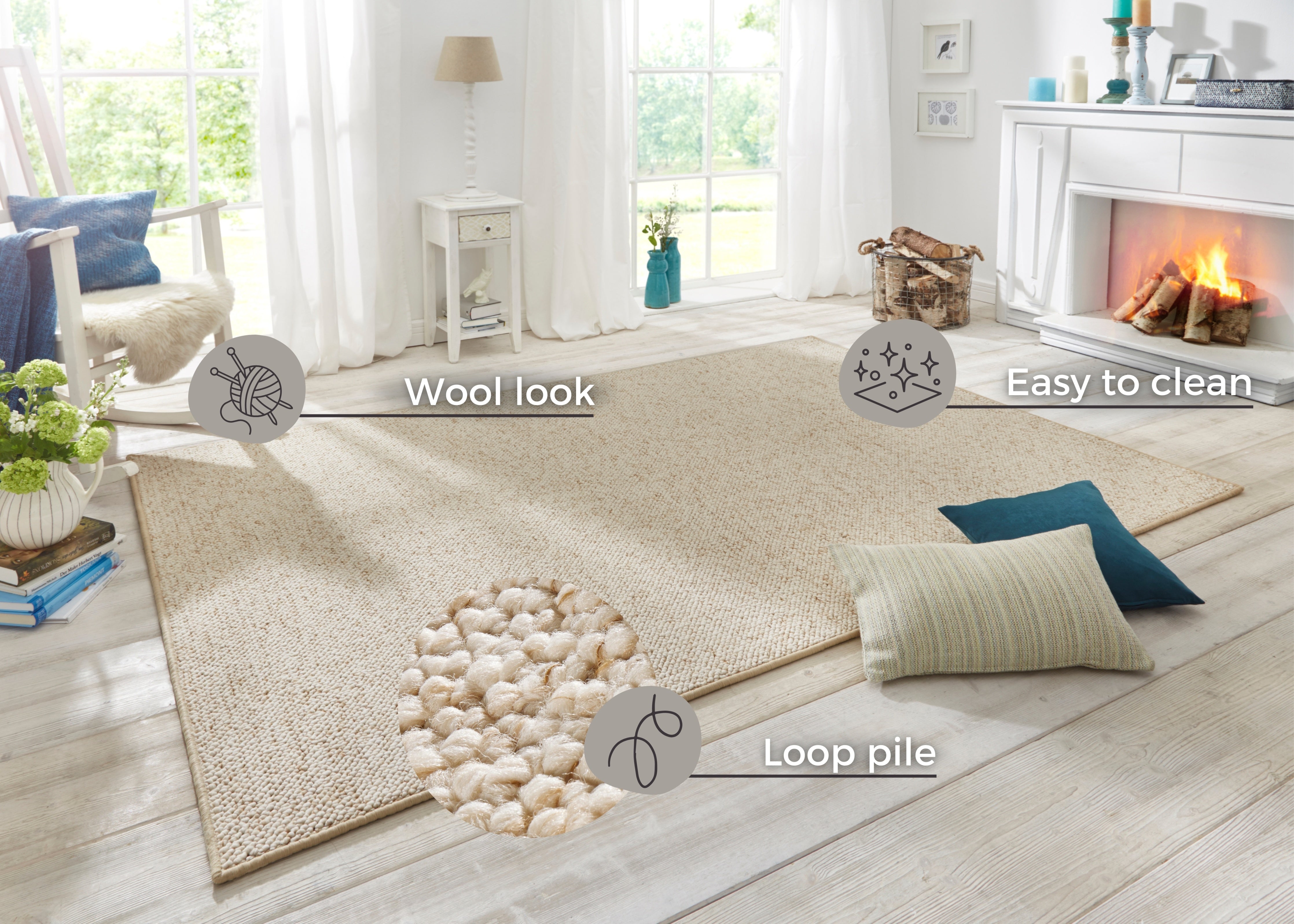 Med en luvhøjde på 1,2 mm tilbyder "Wolly - 102843 Creme" en behagelig og let følelse under fødderne. For at holde tæppet rent og pænt anbefales det at rengøre det med tæpperens eller tæppeshampoo.