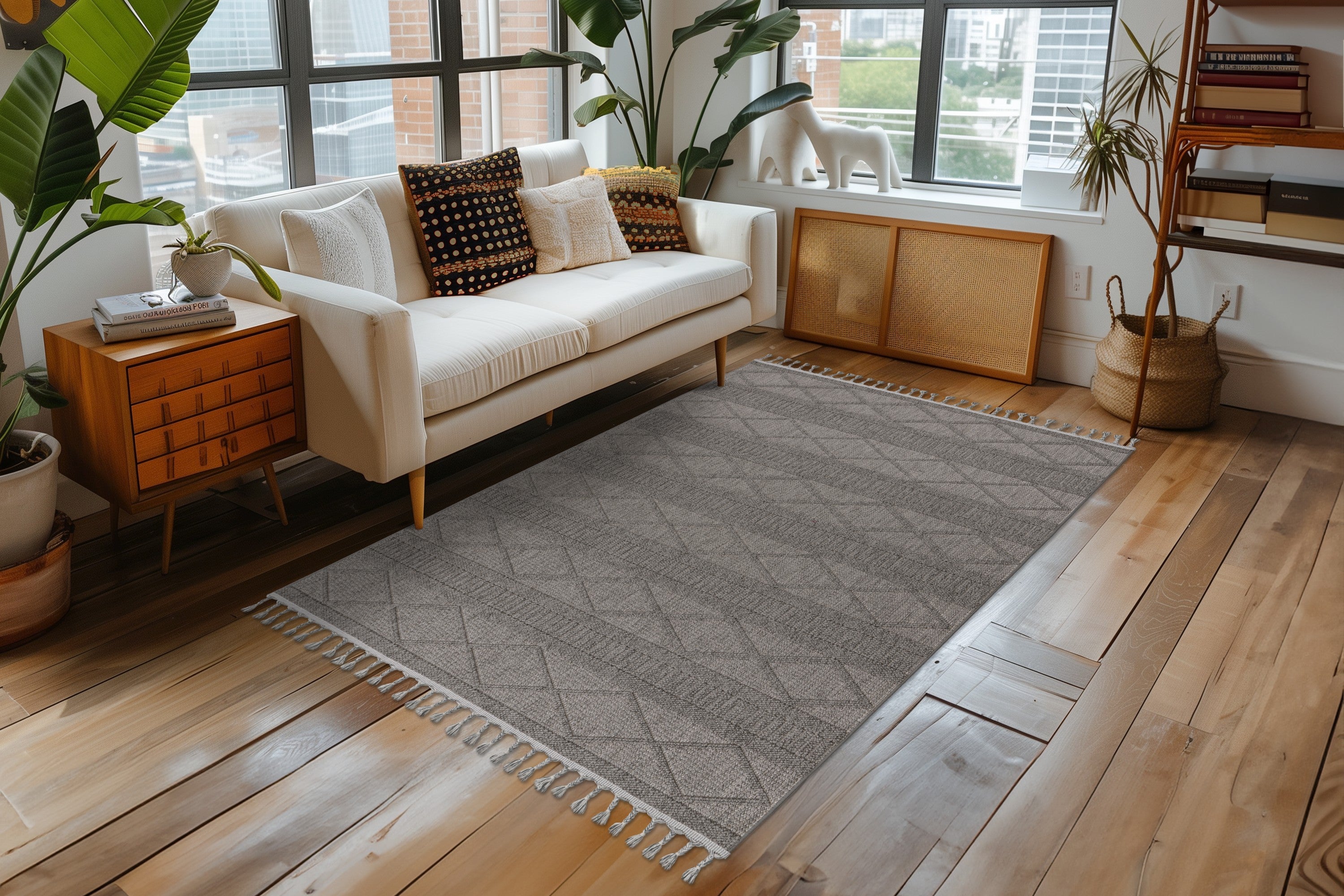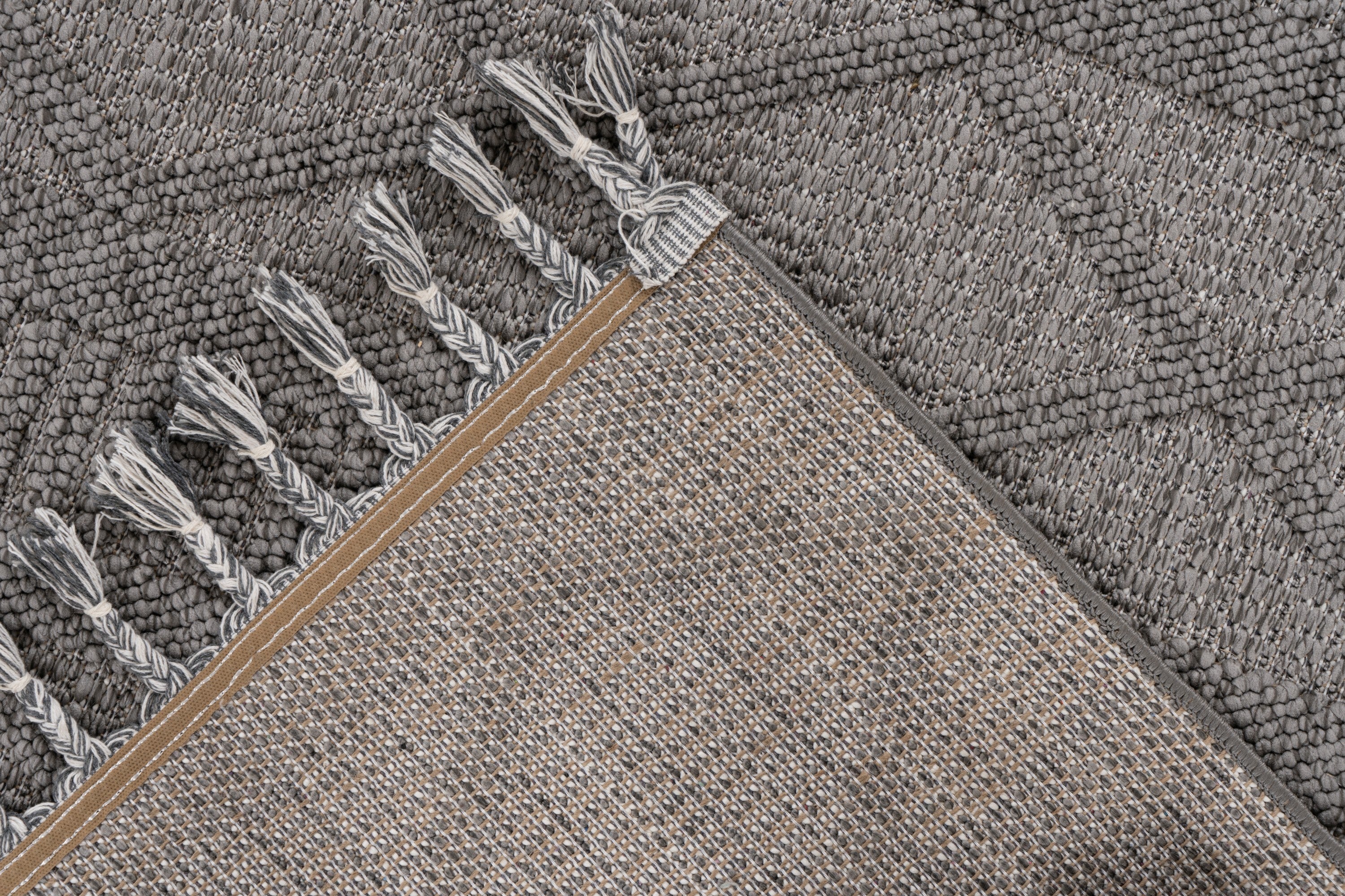 Dette maskinlavede tæppe kombinerer moderne teknologi med klassisk design og er udført i slidstærkt polyester af høj kvalitet. Med håndknyttede frynser får tæppet et elegant finish, der minder om traditionelt håndværk. Tæppet har en luksuriøs 3D-effekt, skabt gennem høj-lav mønster, hvilket giver det et unikt, dynamisk udseende og en visuel dybde, der skiller sig ud i ethvert rum.