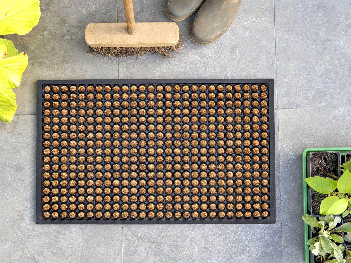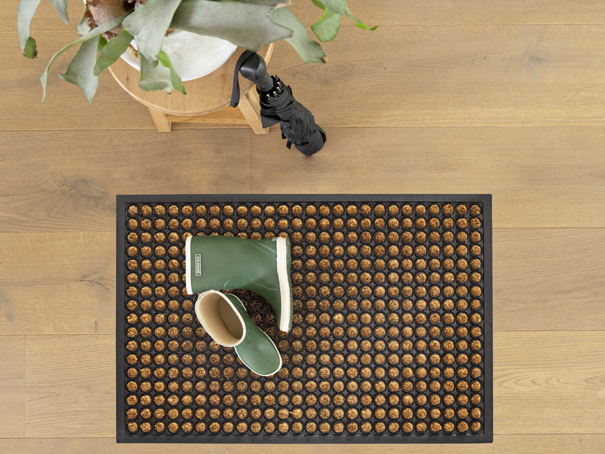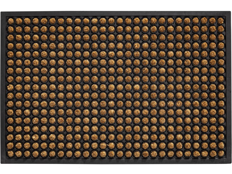 Kombinér kokos og gummi, og få en Rubco måtte til fordøren. Den naturlige kokos står i flot kontrast til det sorte gummi, og du opnår fordelene fra begge materialer. Denne model har en gummibund med kompakte kokoscirkler, der medvirker til en ekstra god skrabeeffekt.