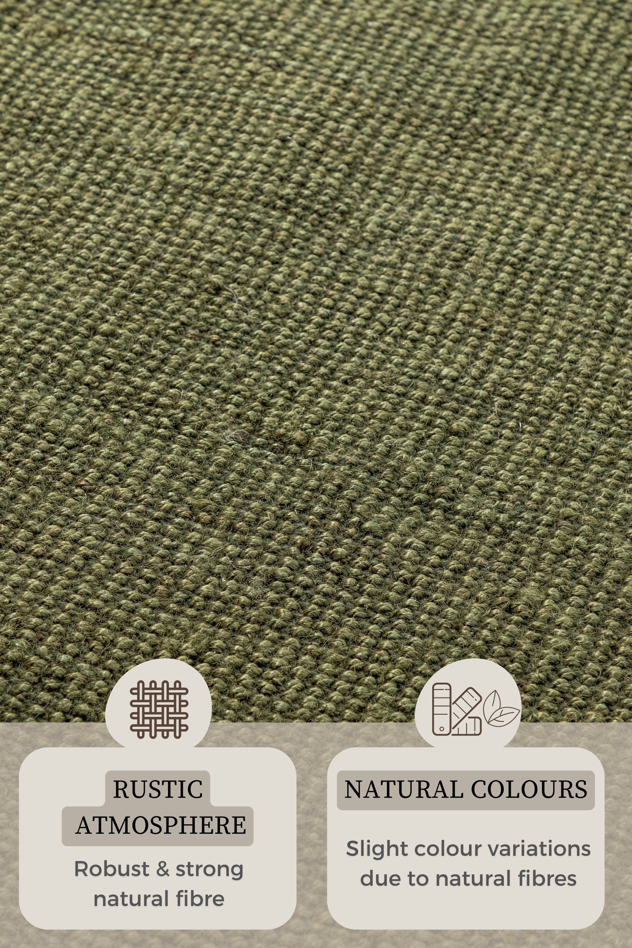 Tæppet er ikke kun æstetisk tiltalende, men også utroligt praktisk. Den robuste jutekonstruktion gør det slidstærkt og modstandsdygtigt over for dagligdagens slid. Både for- og bagside er fremstillet af 100% jute, hvilket sikrer en ensartet kvalitet og følelse. "Bouclé - 105977 Grøn" er desuden velegnet til gulvvarme, så du kan nyde dets naturlige varme og komfort året rundt. Det er nemt at rengøre og afviser snavs effektivt. Hvert tæppe er unikt i sin farvesammensætning på grund af de naturlige materialer, så små farveafvigelser fra billederne kan forekomme.