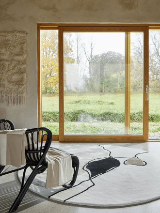 Det runde Abstract-tæppe er et håndtuftet design fremstillet af en blanding af uld og viskose. Det har en hvid bund med sorte uldpartier, suppleret af varme beige og taupe-farvede viskoseområder, der giver en smuk glans. Kontrasten mellem uldens matte tekstur og viskosens blanke blødhed skaber et dynamisk og elegant udtryk.