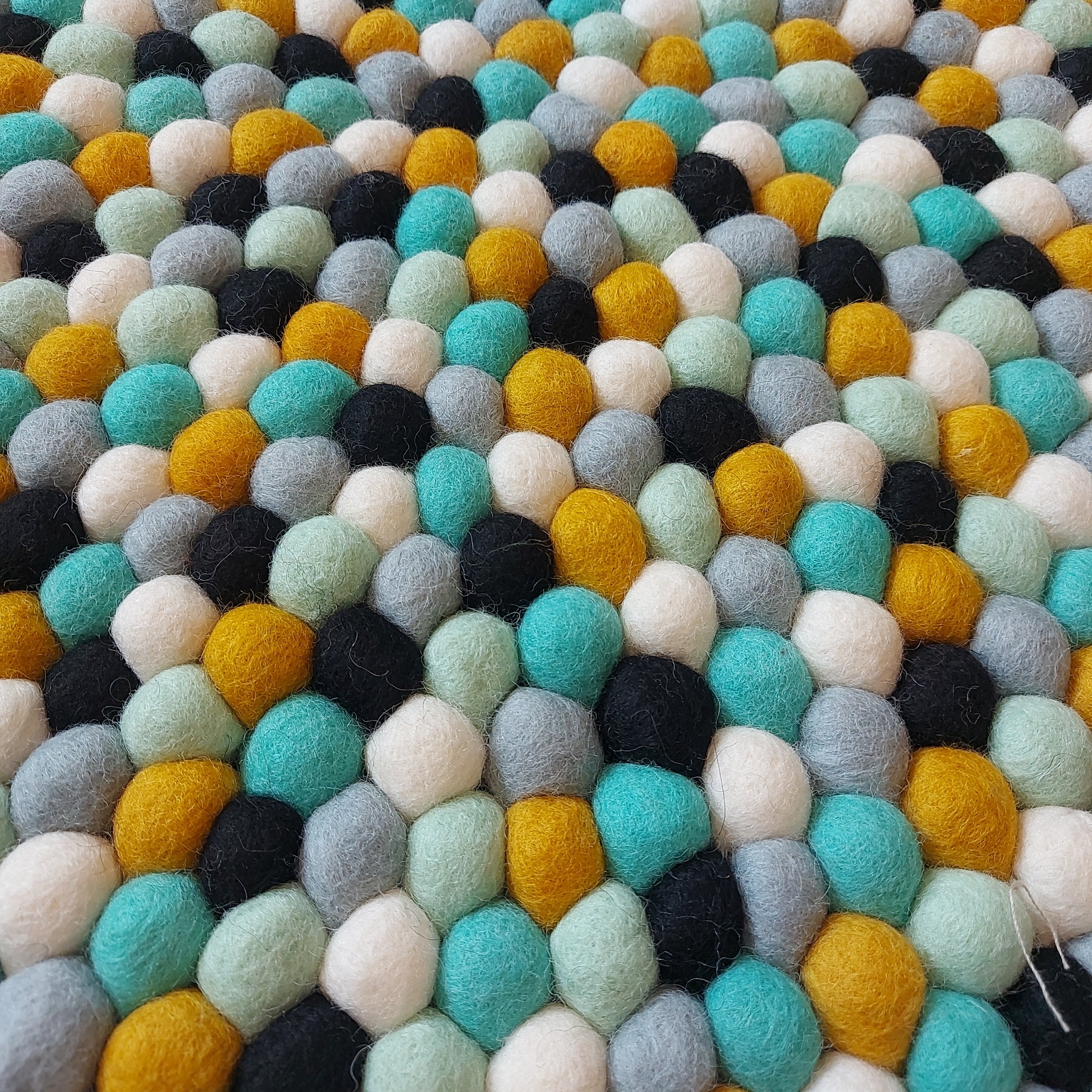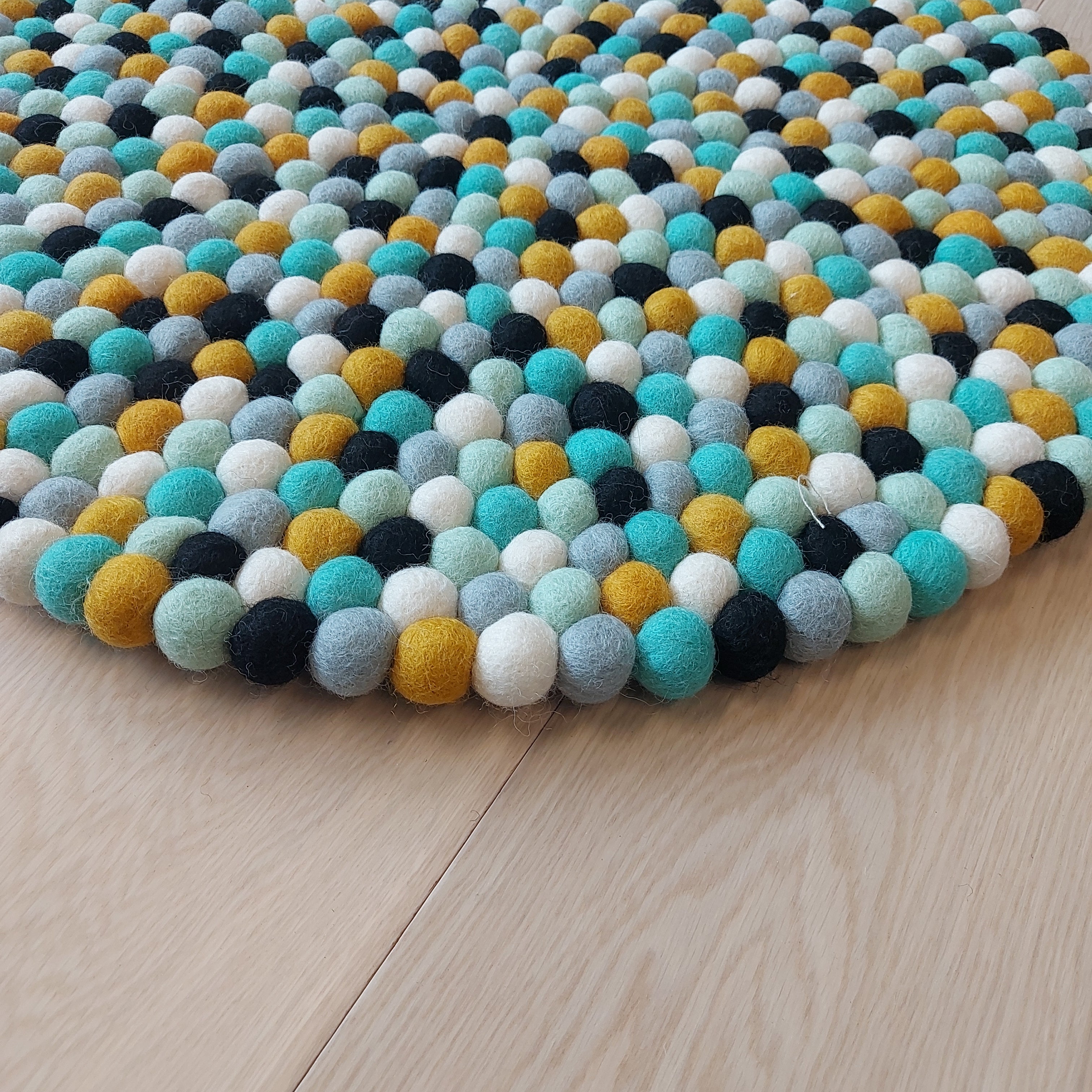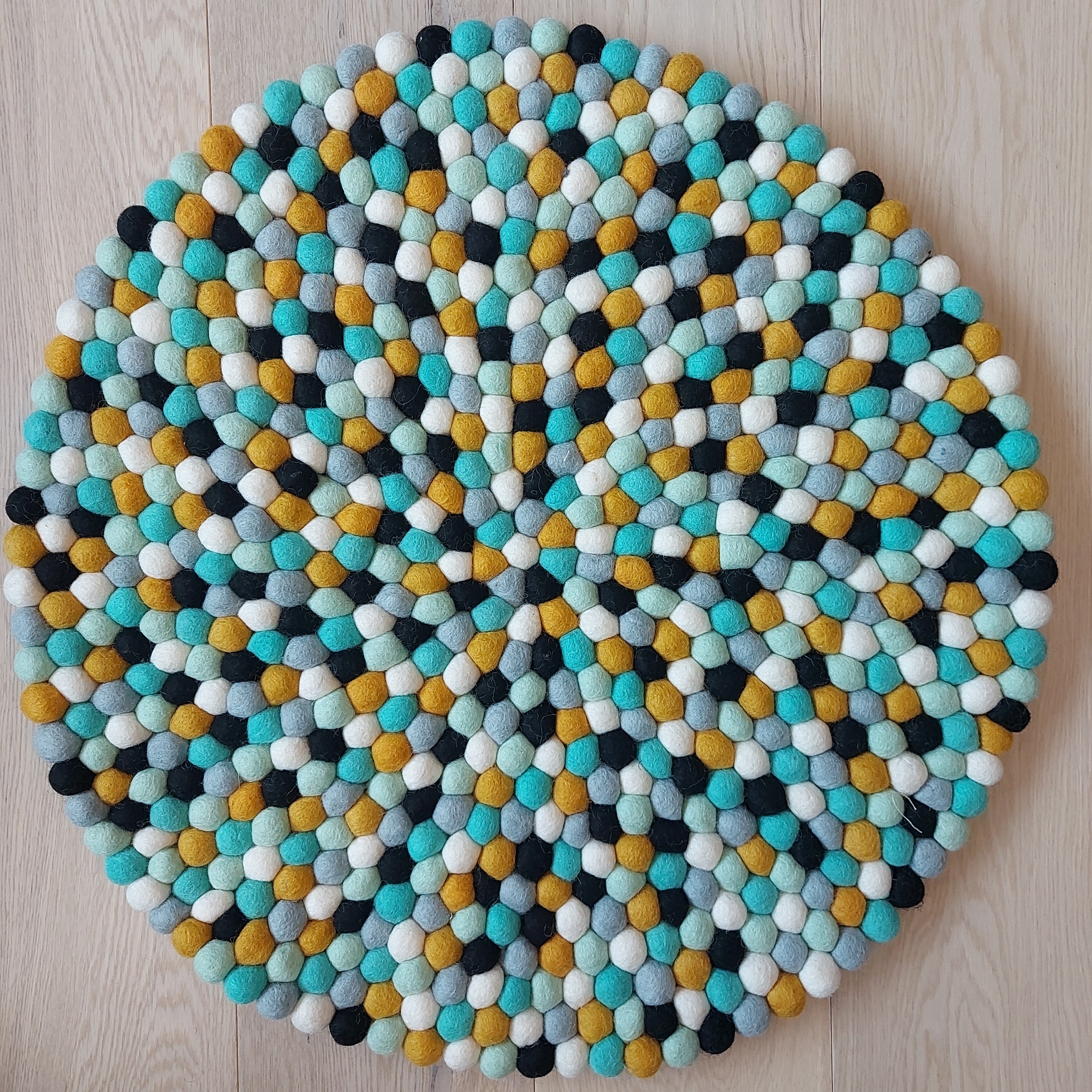 Alle vores smukke kugletæpper er i højeste kvalitet og består af små kulørte filtkugler, der bliver sammensat i hånden. På den måde er der ikke to tæpper der er ens, hvilket er en del af charmen, mindre variationer i størrelser kan forekomme.