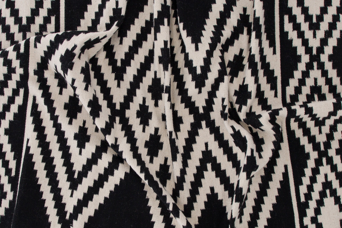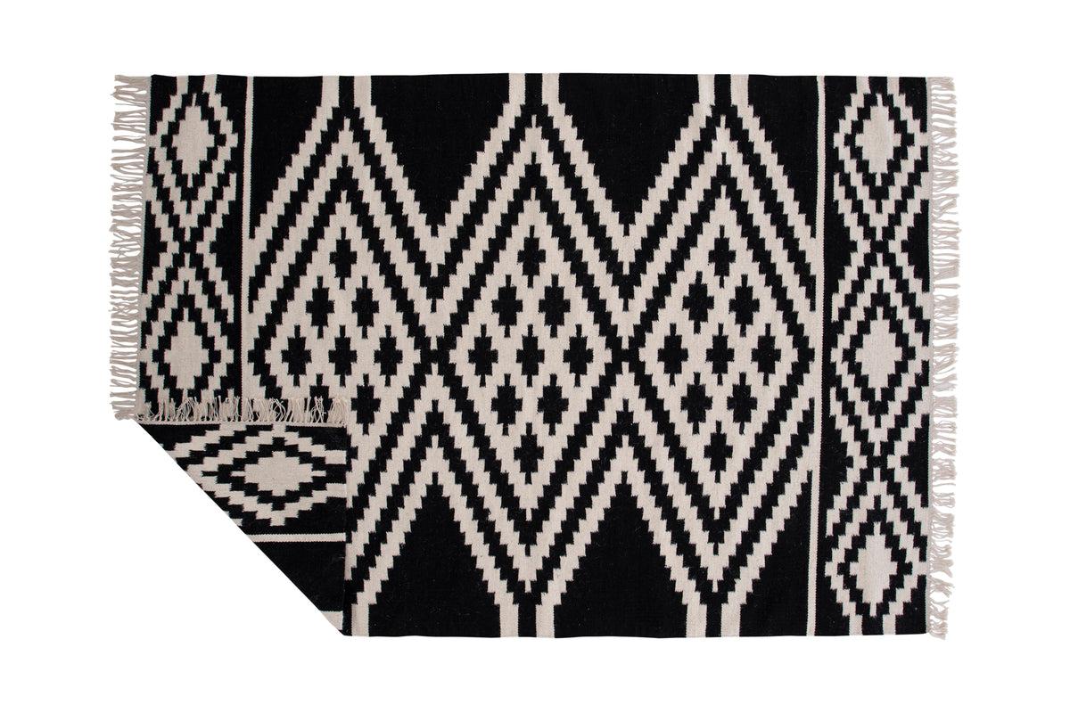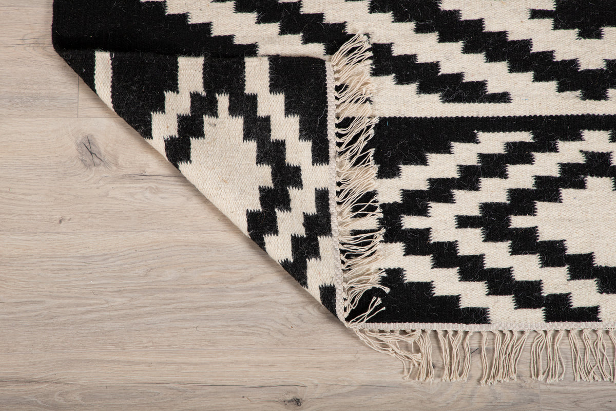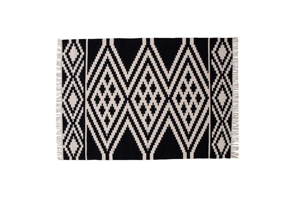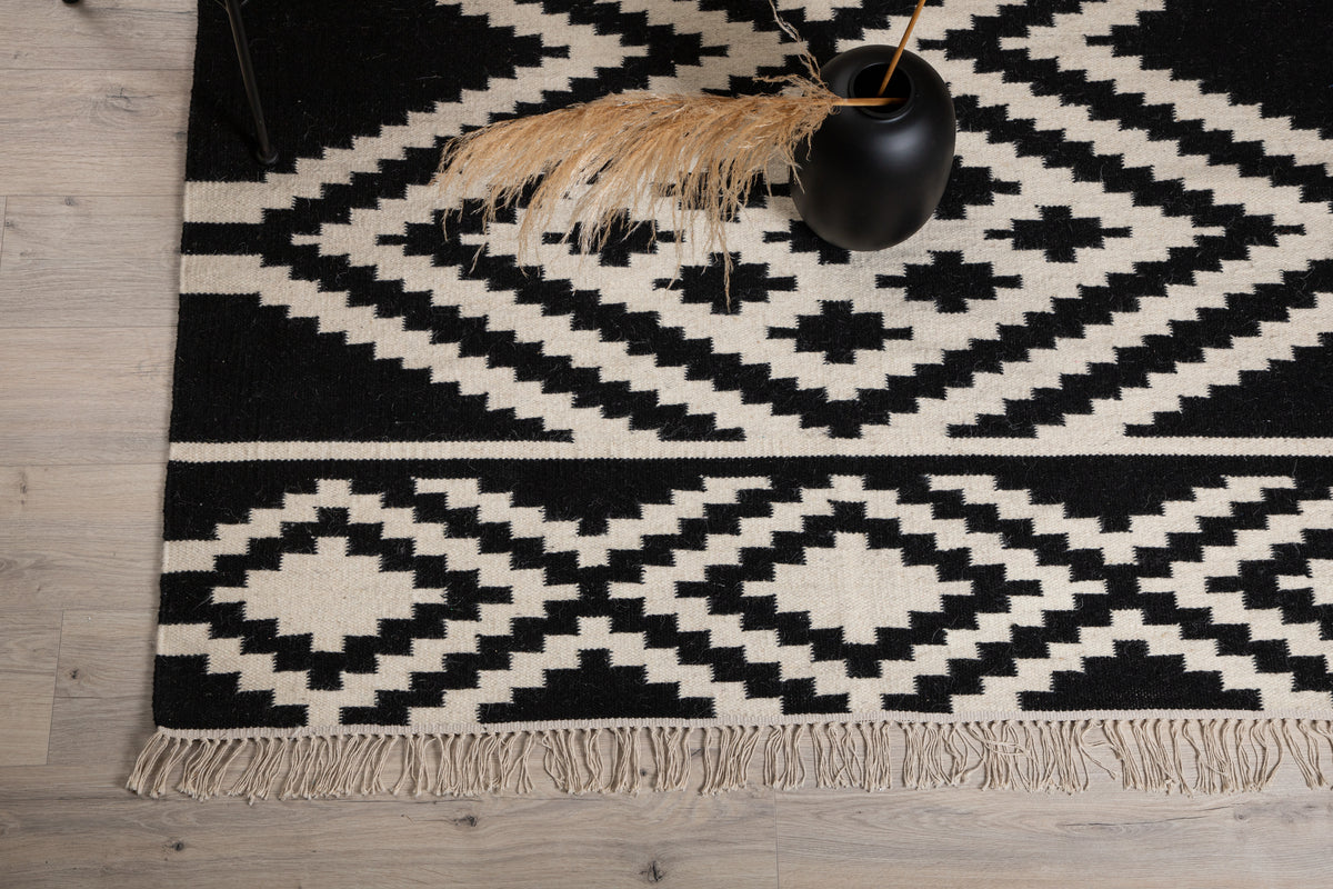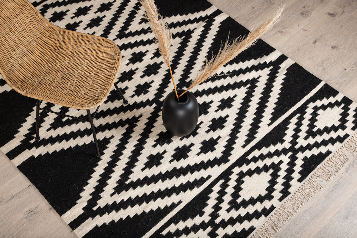 Indret dit hjem med et tæppe, der gør et iøjnefaldende indtryk! Uldtæppet fra Indari-serien er et smukt håndvævet uldtæppe i et dekorativt mønster med farvebund i sort og hvid. Lavet af 90% uld og 10% bomuld er tæppet både praktisk og slidstærkt, så du kan nyde det i lang tid. Design med frynser skaber et komplementært helhedsindtryk til tæppets kraftige udsmykkede mønster og giver et moderne løft til hjemmet. Plejeanvisning: Uld er et naturmateriale, der både er slidstærkt og smudsafvisende. Pletter på uldtæpper skal fjernes med det samme ved at bruge køkkenrulle eller en ren klud for at absorbere hurtigt. Trænger pletten allerede ind i tæppet, kan en klud med varmt vand være en god løsning, hvis kun lunkent vand ikke er nok, kan der tilsættes en lille smule mildt rengøringsmiddel.