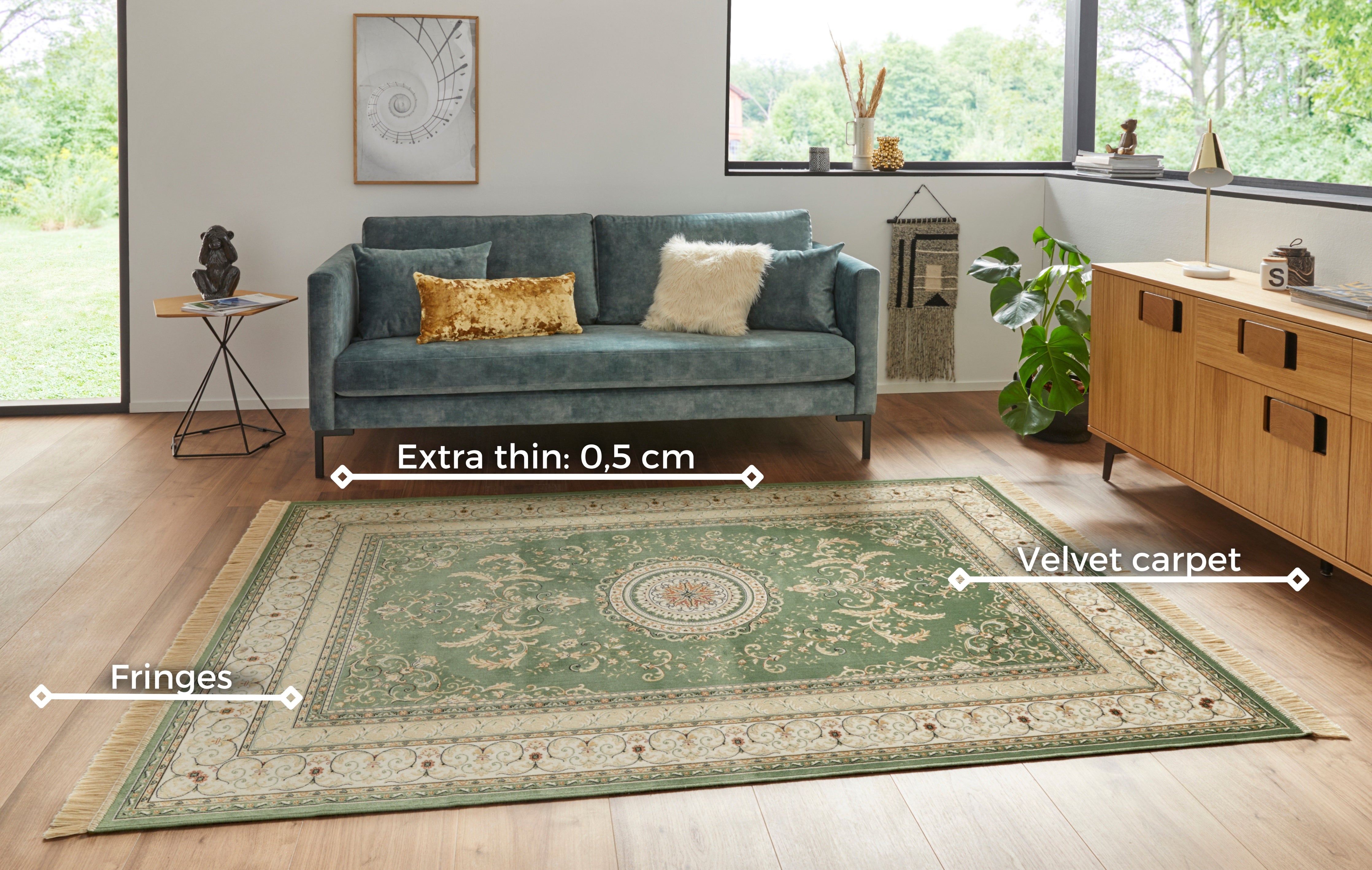 Naveh-tæppet prydes af et klassisk, orientalsk blomstermønster, der skaber et iøjnefaldende blikfang i din stue, soveværelse eller spisestue. Den bløde, korte luv er ekstra tynd og nem at rengøre, hvilket gør tæppet ideelt til travle hjem. Den robuste bomuldsbagside sikrer stabilitet og forhindrer tæppet i at glide, mens det samtidig er velegnet til alle gulvtyper, inklusive gulvvarme. Nyd den behagelige komfort og den tidløse elegance, som Naveh-tæppet tilføjer til din indretning.
