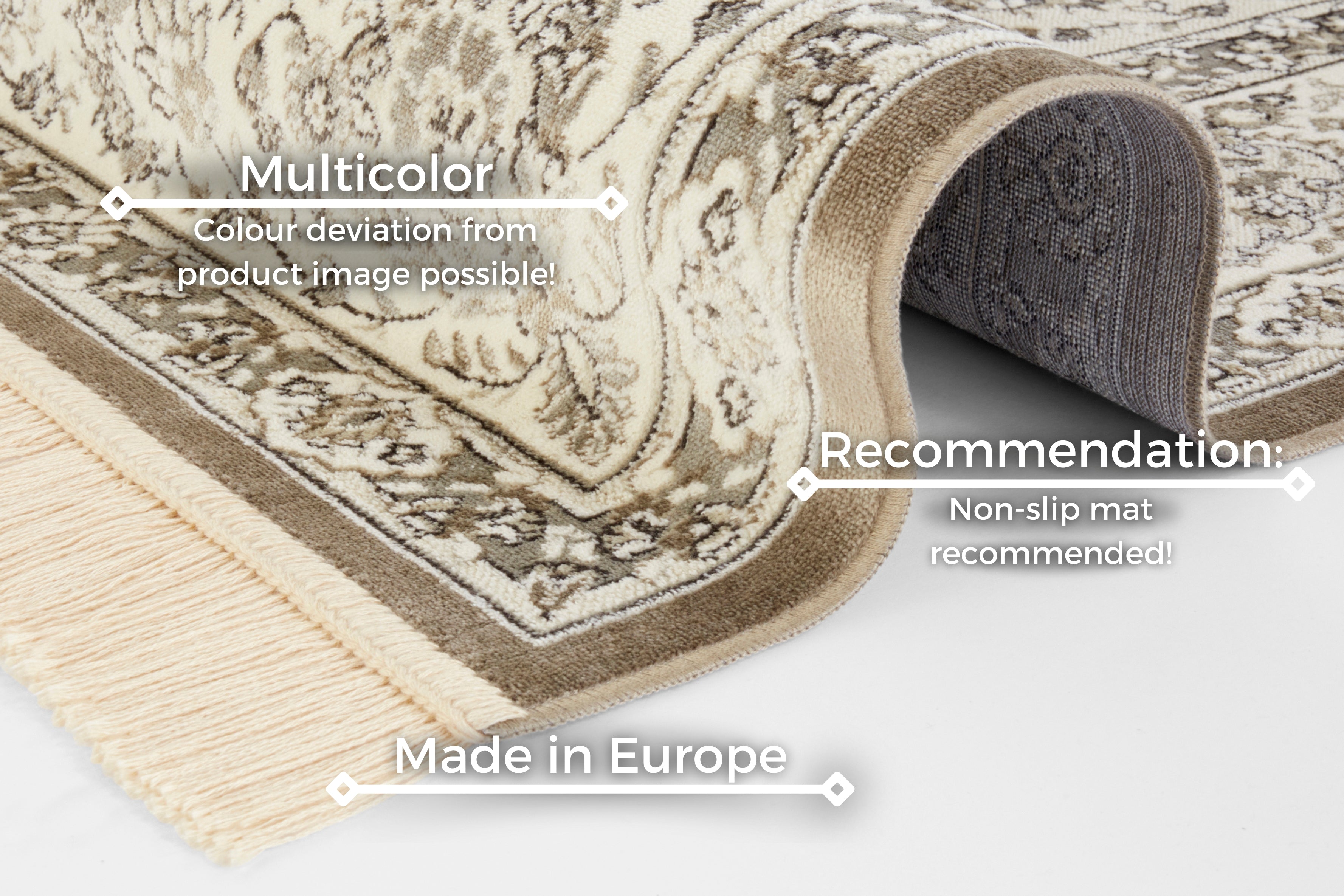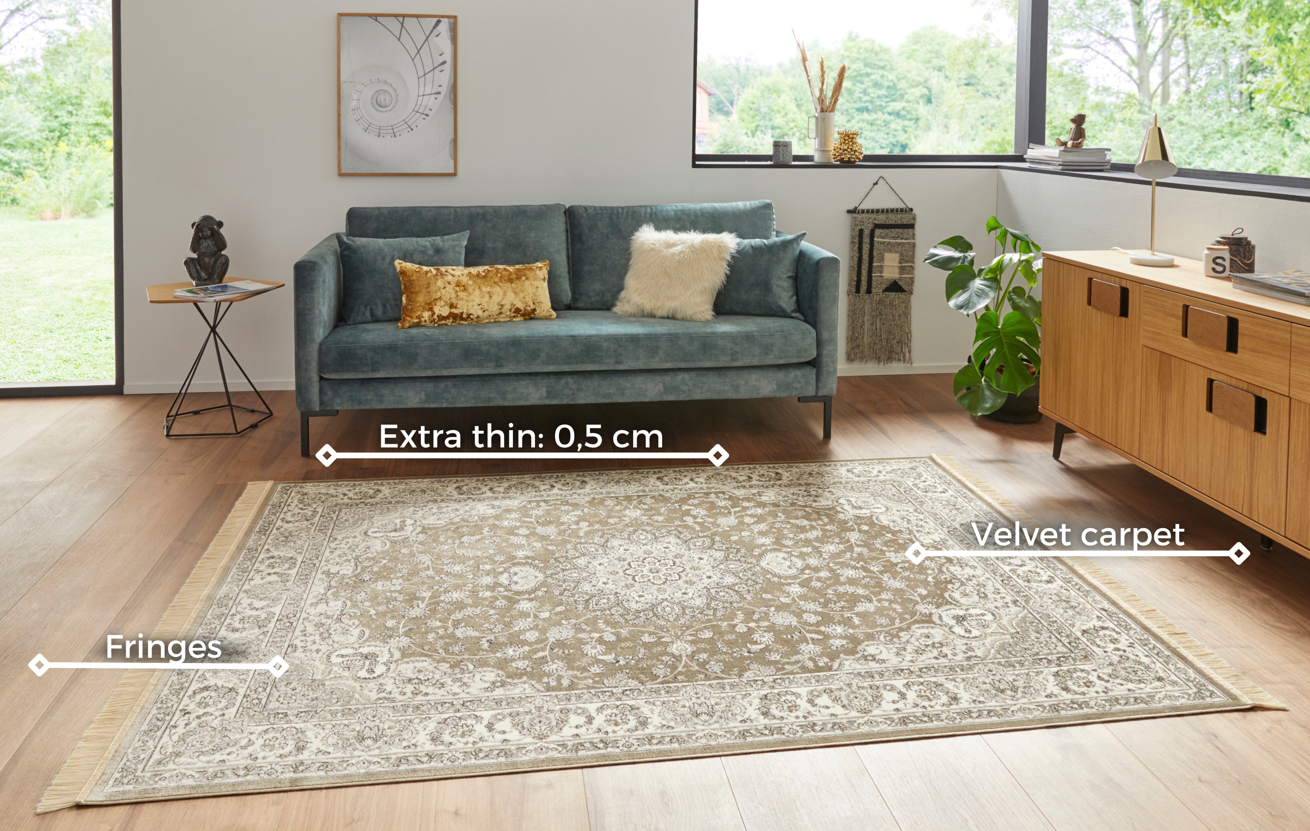 Naveh tæppets klassiske, orientalsk inspirerede blomstermønster er et ægte blikfang, der tilføjer et strejf af elegance til din indretning. Den ekstra tynde, korte luv gør tæppet nemt at rengøre og ideelt til alle gulvtyper, inklusive gulvvarme. Bagsiden i 100% bomuld sikrer stabilitet og forhindrer tæppet i at glide. Nyd den bløde fornemmelse under fødderne med en luvhøjde på kun 0,5 mm.