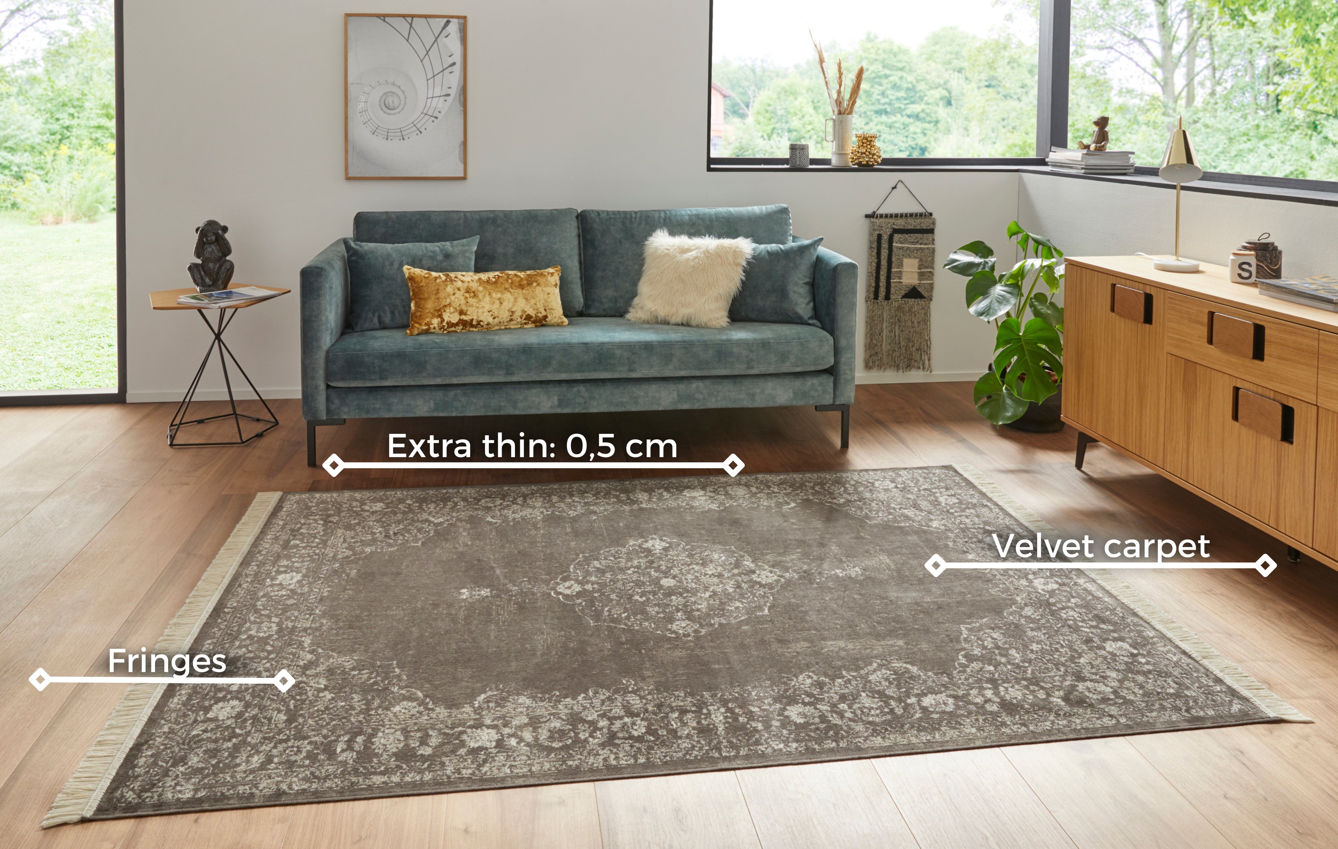 Naveh-tæppets ekstra tynde design med en lav luvhøjde på kun 0.5 mm gør det nemt at placere under møbler og døre. Den bløde, korte luv er behagelig at gå på og giver en luksuriøs følelse under fødderne. Bomuldsbagsiden sikrer stabilitet og beskytter dit gulv mod ridser. Tæppet er desuden velegnet til gulvvarme, så du kan nyde den bløde komfort året rundt. Den robuste konstruktion sikrer lang holdbarhed, så du kan glæde dig over dit Naveh-tæppe i mange år fremover.