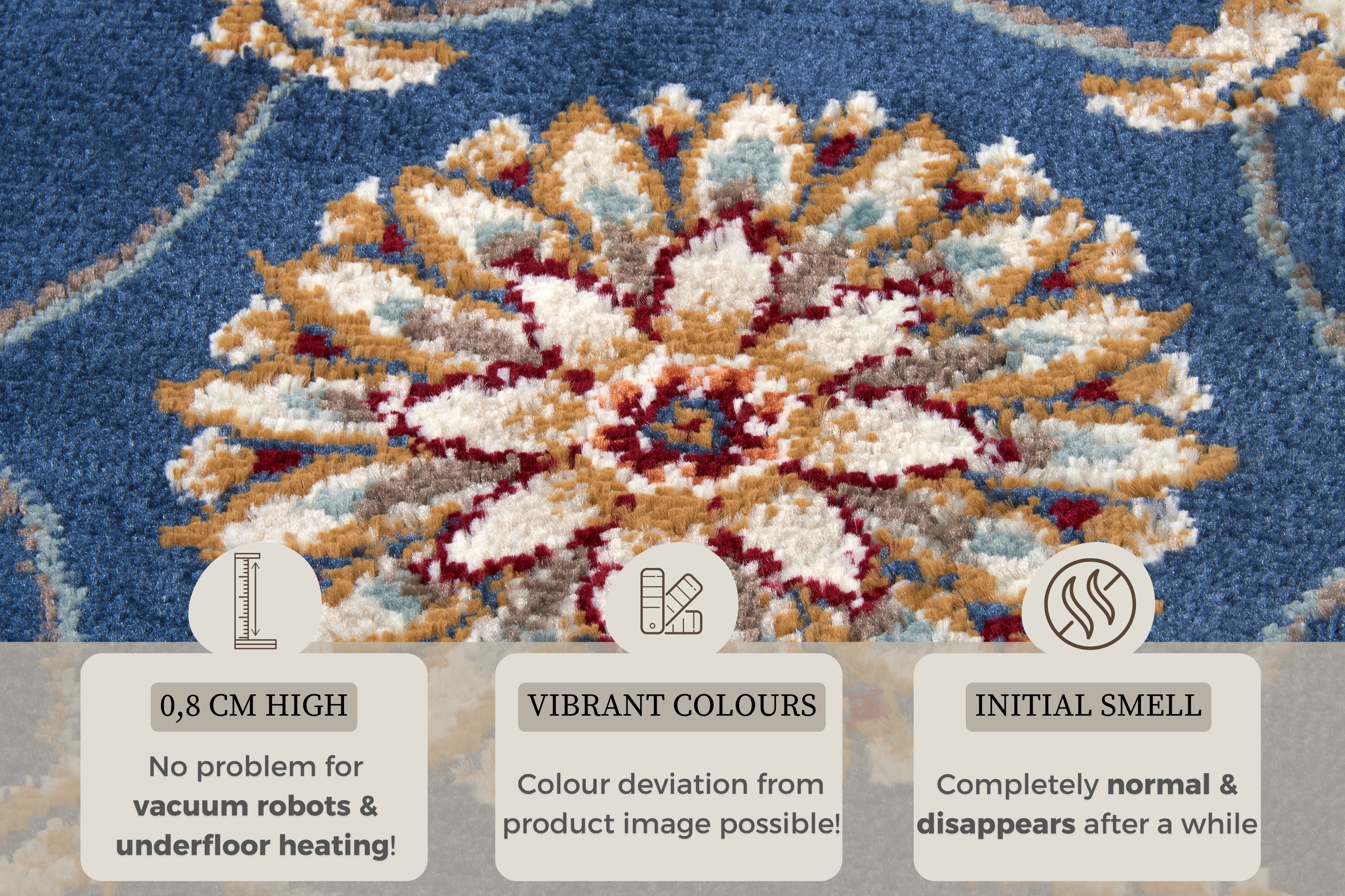 Luxor-tæppet er ikke kun smukt, det er også utroligt slidstærkt og nemt at rengøre takket være de syntetiske fibre. Den robuste kantning (border) sikrer lang holdbarhed og et flot finish, mens bagsiden i en kombination af jute og polypropylen giver tæppet stabilitet og forhindrer det i at glide. De florale designs passer perfekt til alle gulvtyper, inklusive gulvvarme, så du kan nyde tæppets bløde komfort uanset underlaget.