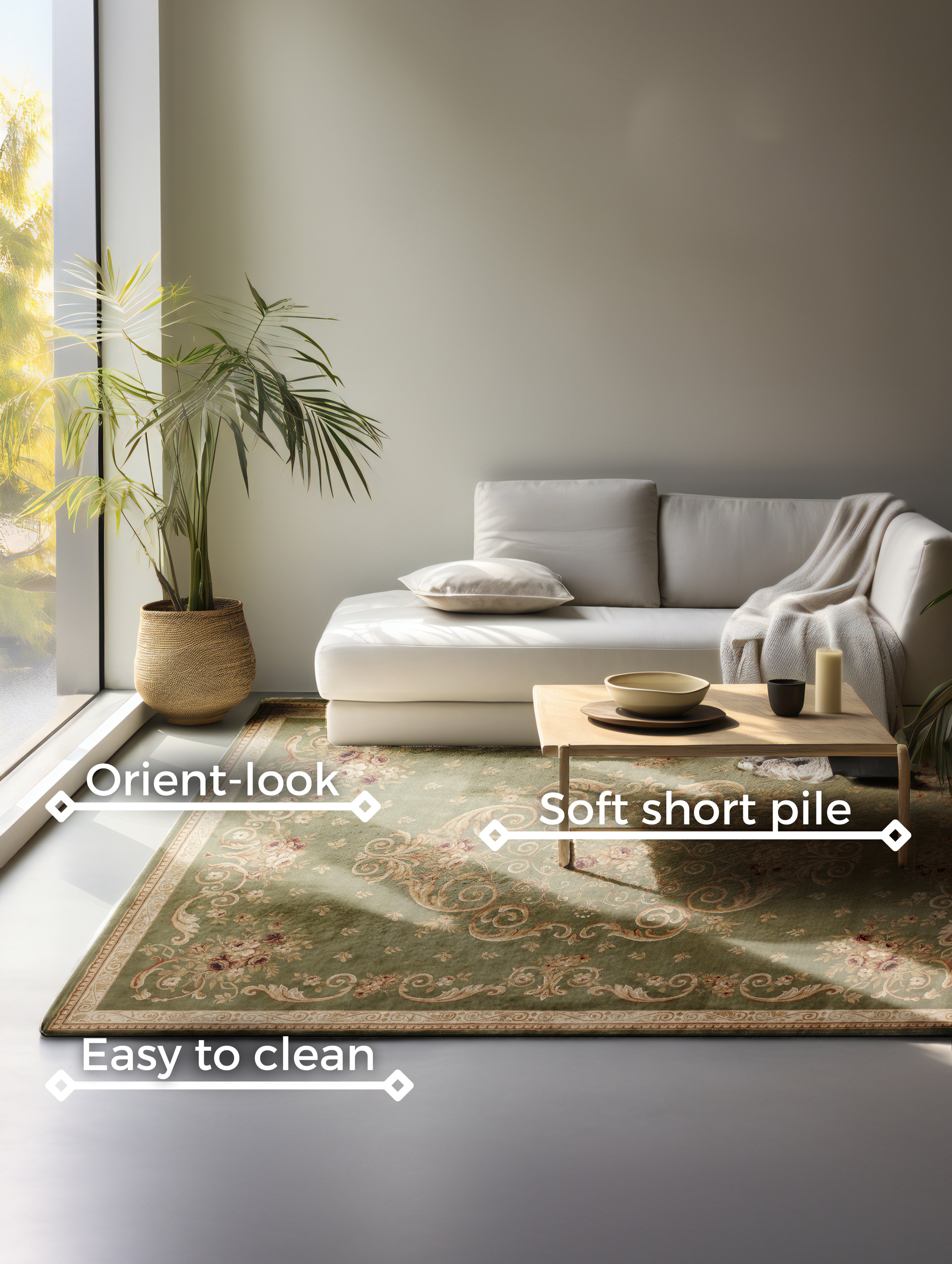 Med en luvhøjde på blot 0.8 mm føles Herat tæppet behageligt blødt og komfortabelt under fødderne. For at holde tæppet rent og pænt anbefales rengøring med tæpperens. Giv dit hjem et strejf af orientalsk elegance med Herat - 105996 Olivengrøn.