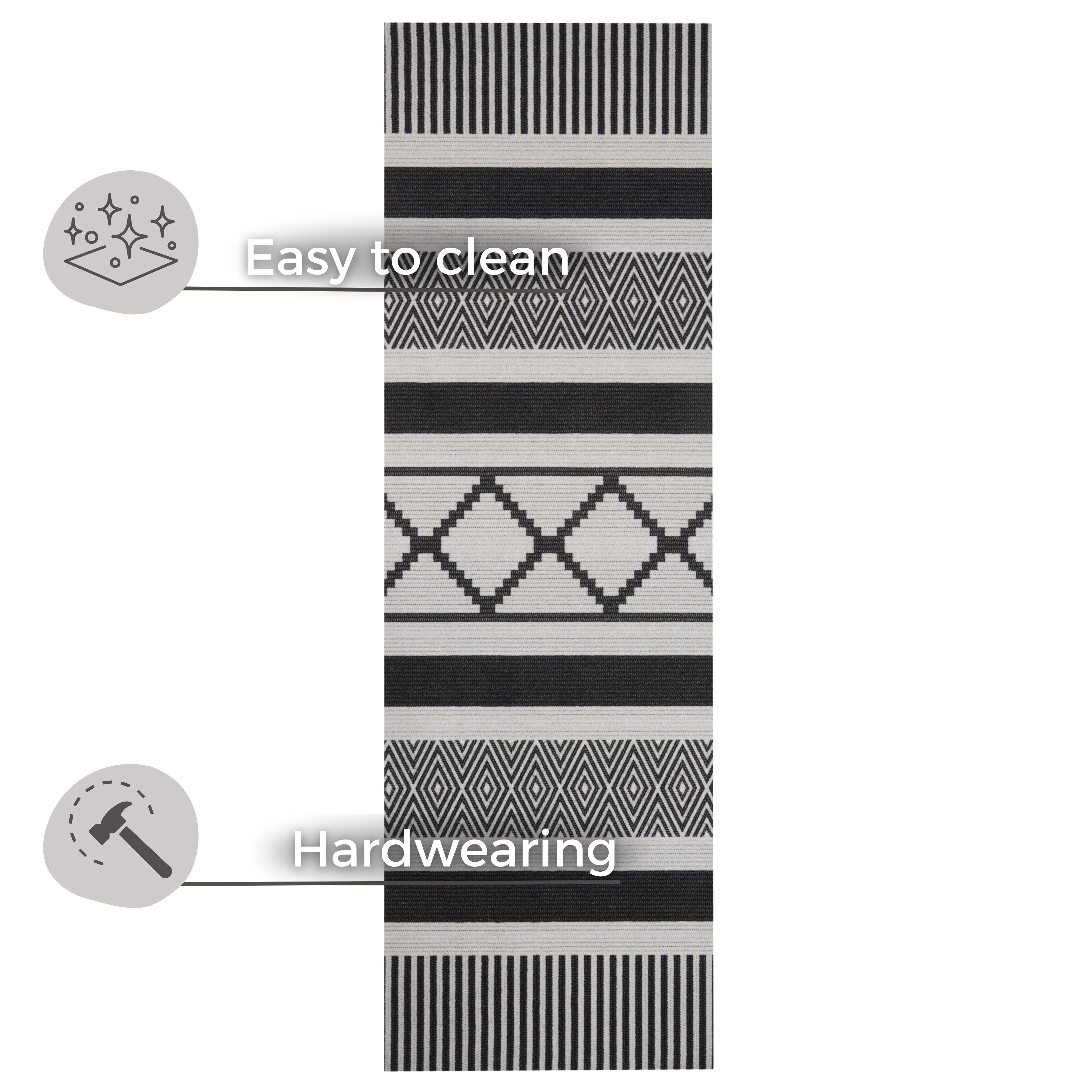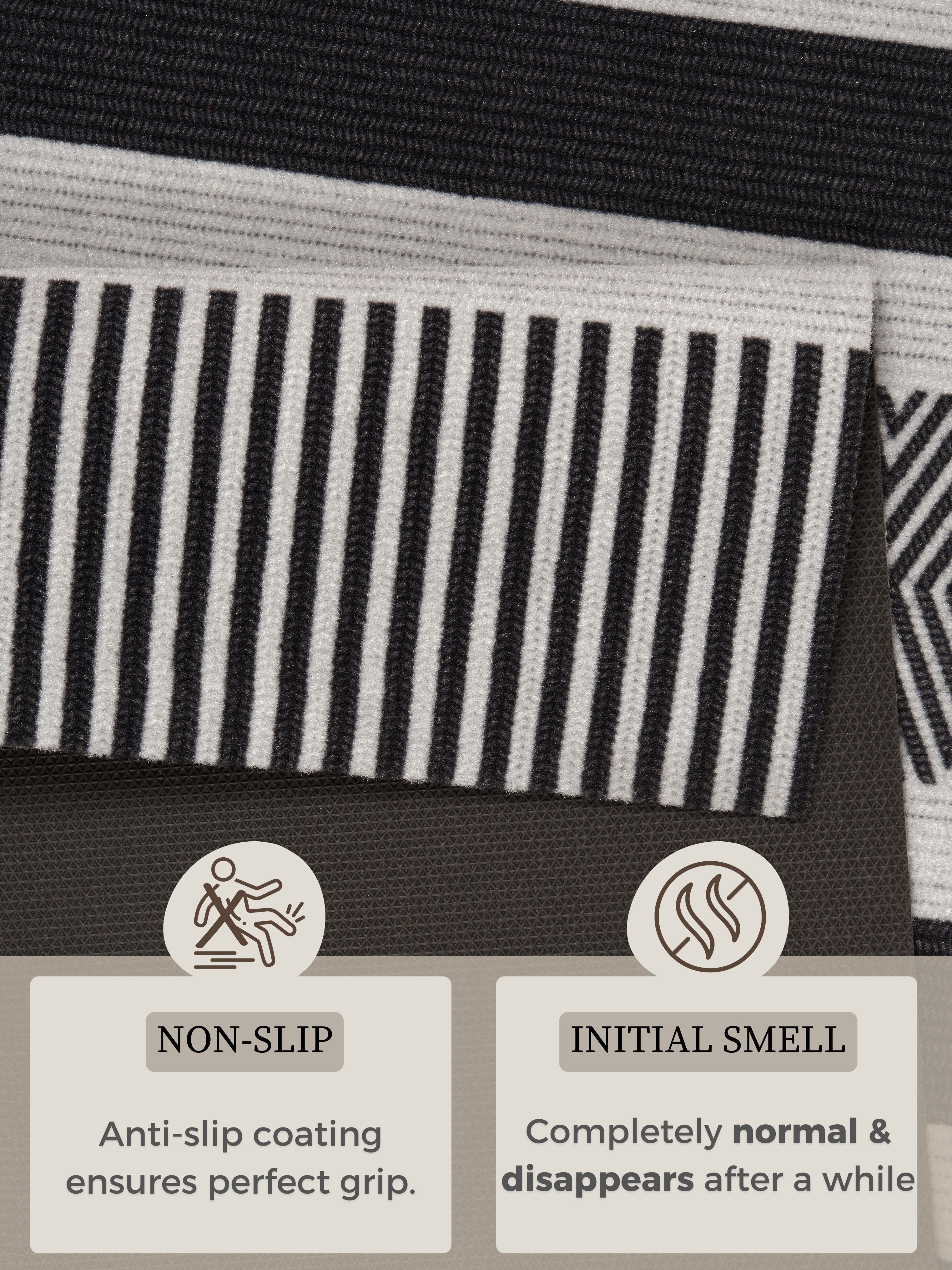 Den skridsikre bagside i nitrilgummi sørger for, at tæppet ligger sikkert på plads, uanset om det er i køkkenet, entréen eller et andet travlt område. Dette gør det ikke kun til et smukt blikfang, men også en sikker løsning for hele familien. Den slidstærke konstruktion i syntetiske fibre gør tæppet utrolig robust og nemt at rengøre, så du kan nyde dets elegante udseende i mange år. Det moderne design passer perfekt til alle gulvtyper, inklusive gulvvarme.