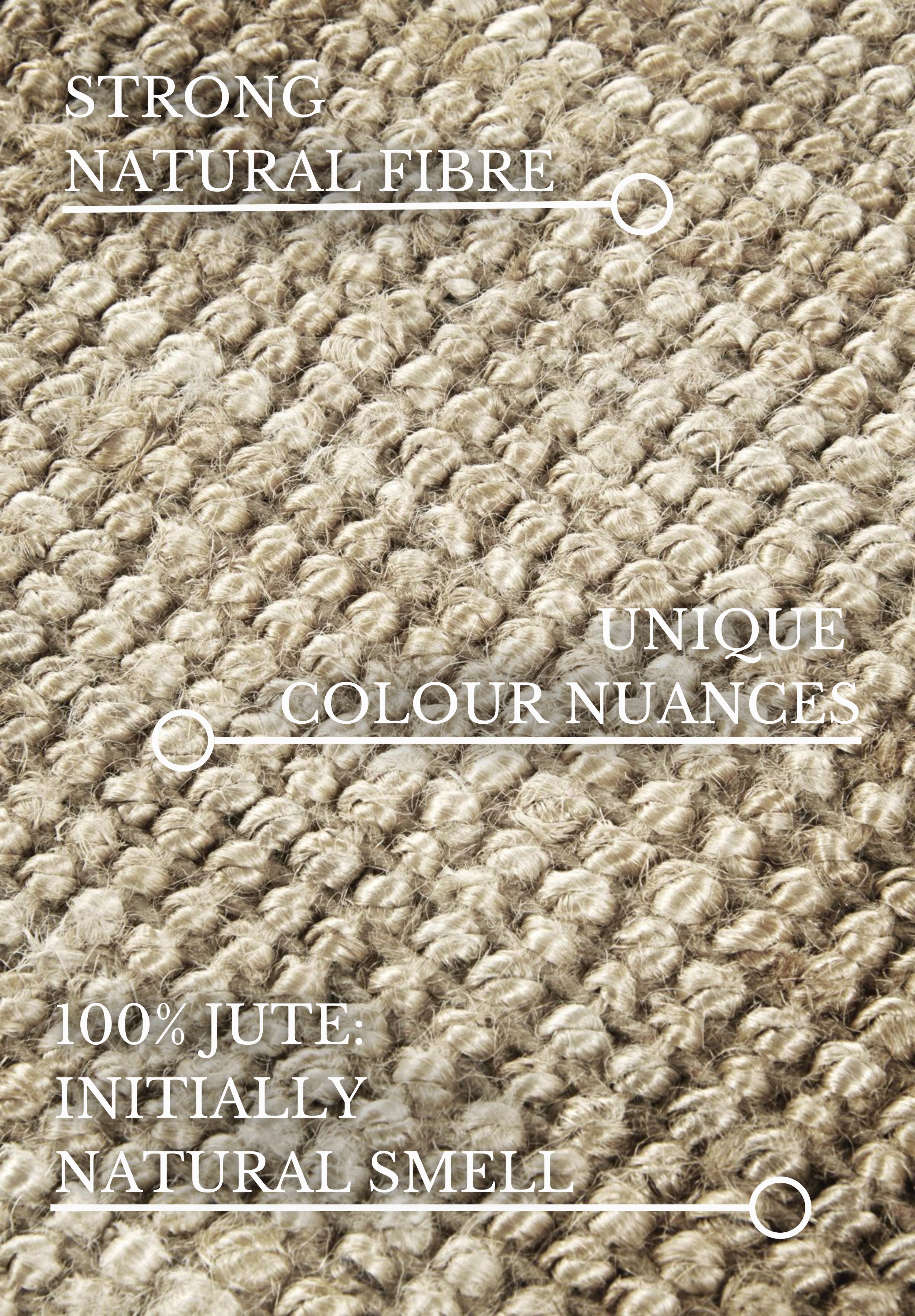Jutens naturlige farver og den tidløse håndvævede struktur giver tæppet et unikt og sofistikeret udtryk. Den robuste jutefiber er utrolig slidstærk og nem at rengøre, hvilket gør tæppet perfekt til hverdagsbrug. Bagsiden er ligeledes fremstillet af 100% jute, hvilket bidrager til tæppets holdbarhed og stabilitet. Den håndvævede kantafslutning (handwoven) tilføjer et autentisk touch og understreger tæppets unikke karakter. Da tæppet er fremstillet af naturmaterialer, er hvert eksemplar unikt i sin farvesammensætning, hvilket giver dig et helt særligt stykke kunsthåndværk til dit hjem.