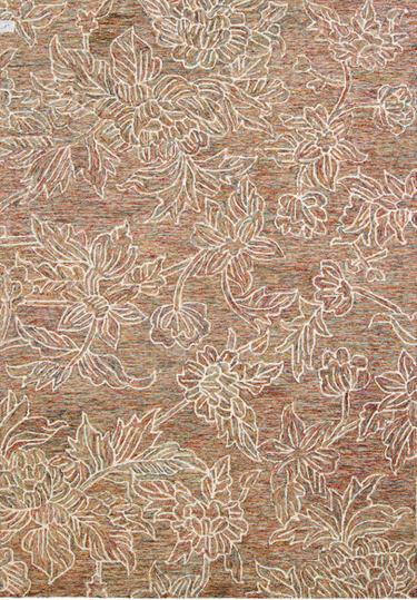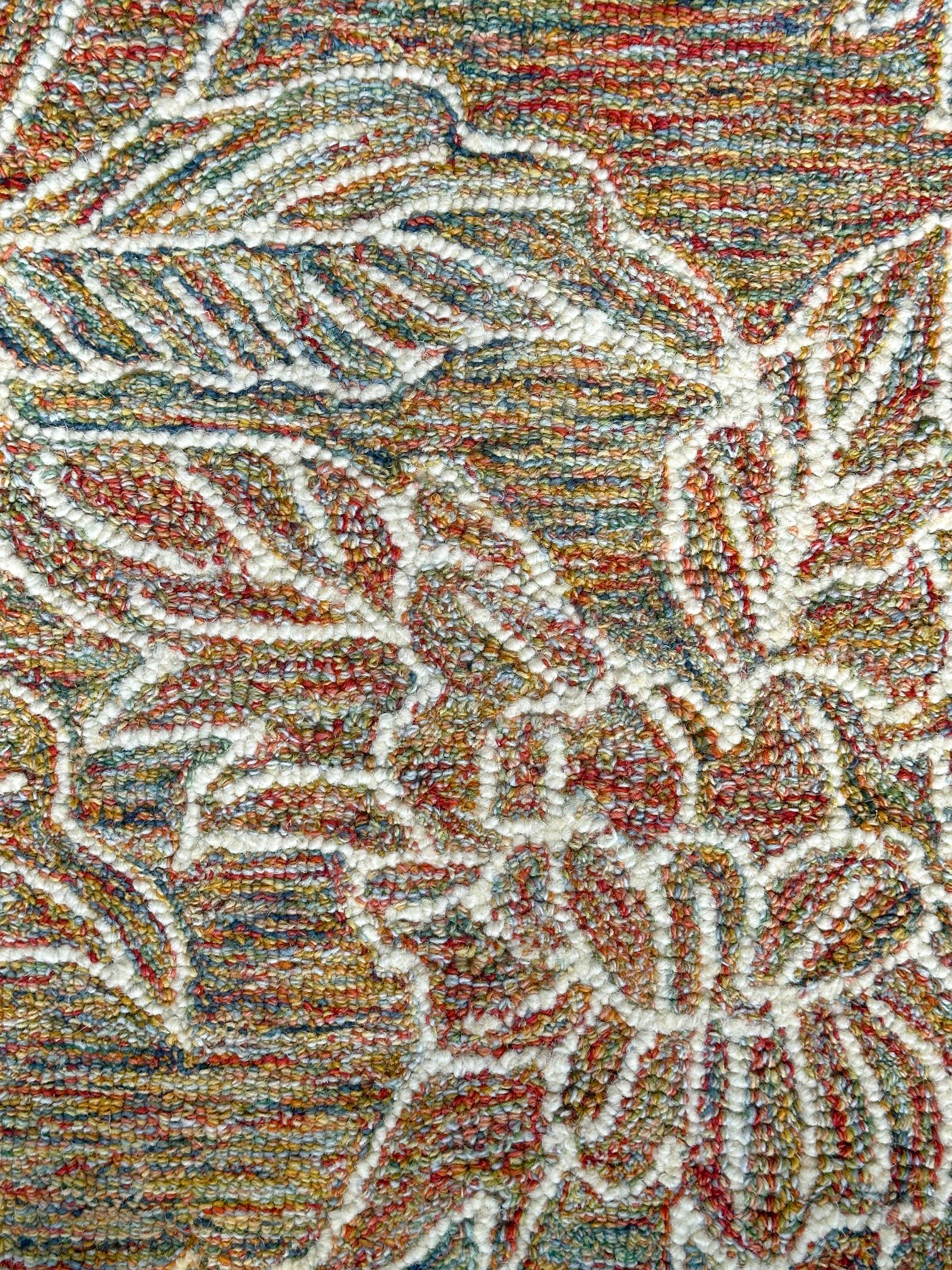 Skab varme og personlighed i dit hjem med dette håndtuftede uldtæppe i et levende og kunstnerisk design. Tæppet er fremstillet af 100% uld og prydet med et detaljeret blomsterbroderi i hævede konturer og flerfarvede tråde, der giver et unikt, tredimensionelt udtryk.