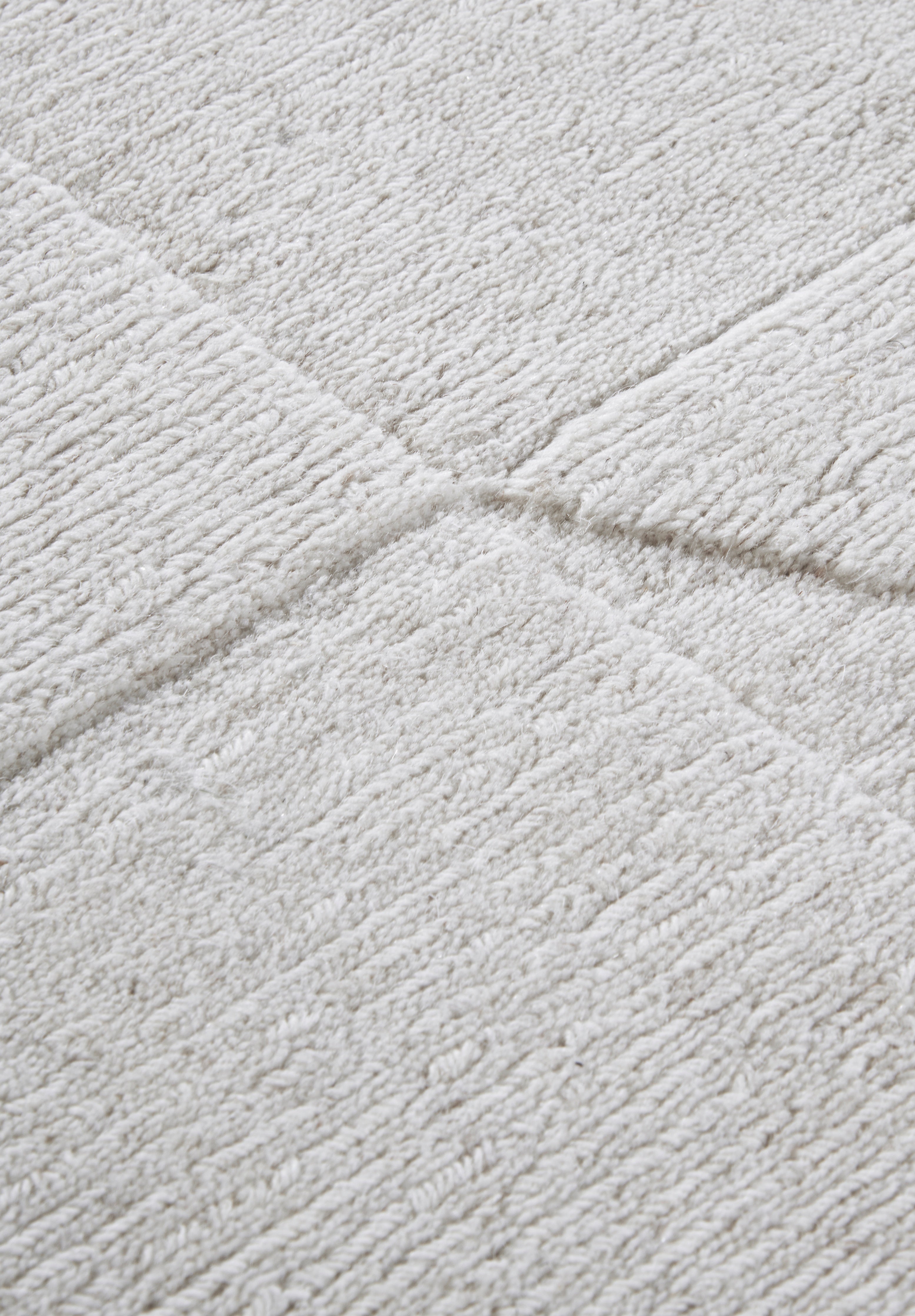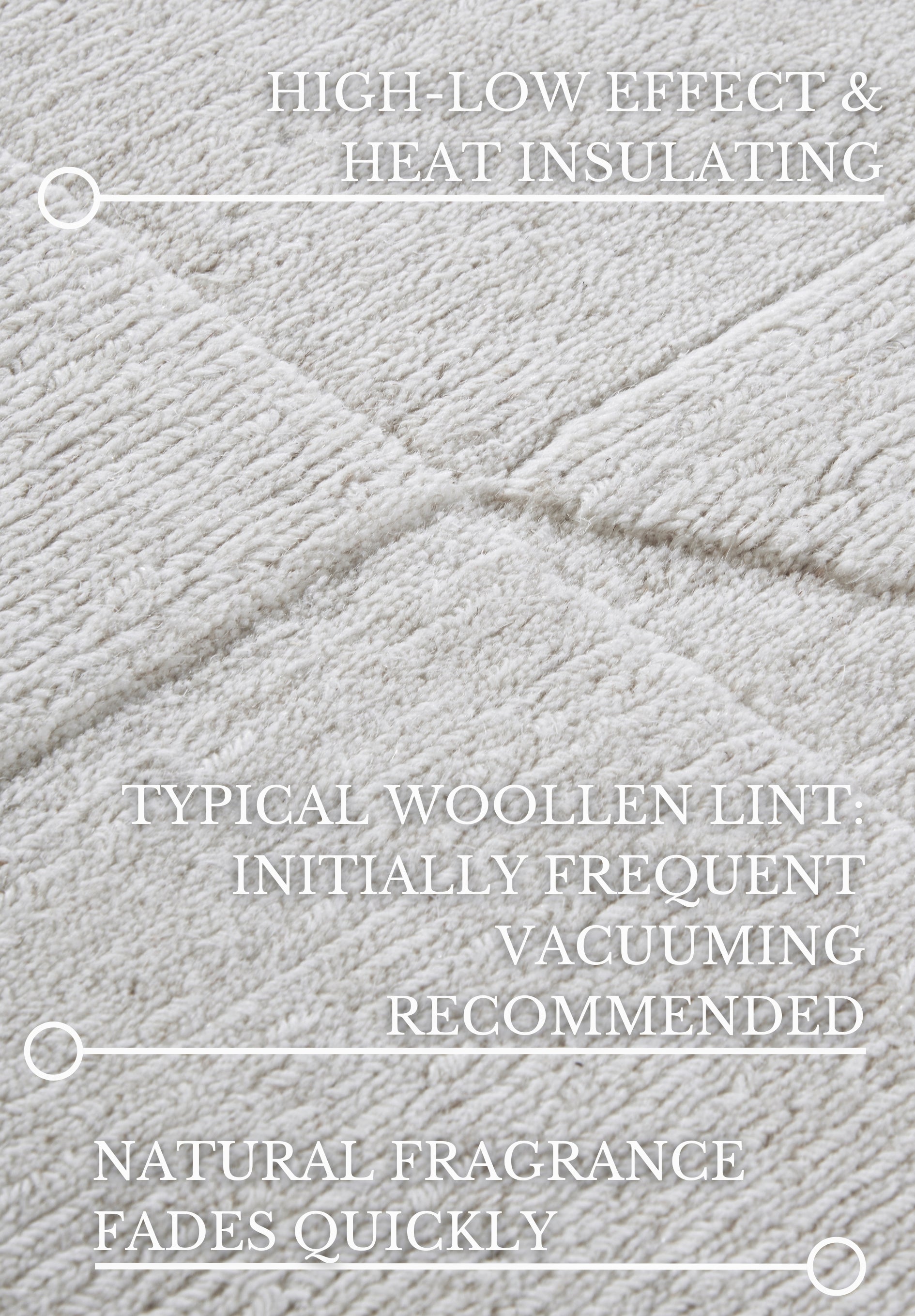 Dette håndvævede uldtæppe imponerer med sin klassiske farve og et tidløst design, der passer til enhver indretningsstil. Den lette high-low struktur giver tæppet et unikt og sofistikeret præg. Den robuste bagside i 100% bomuld sikrer tæppets stabilitet og forlænger dets levetid. Den høje kvalitet og de naturlige fibre gør tæppet slidstærkt og nemt at holde rent, så du kan nyde det i mange år.