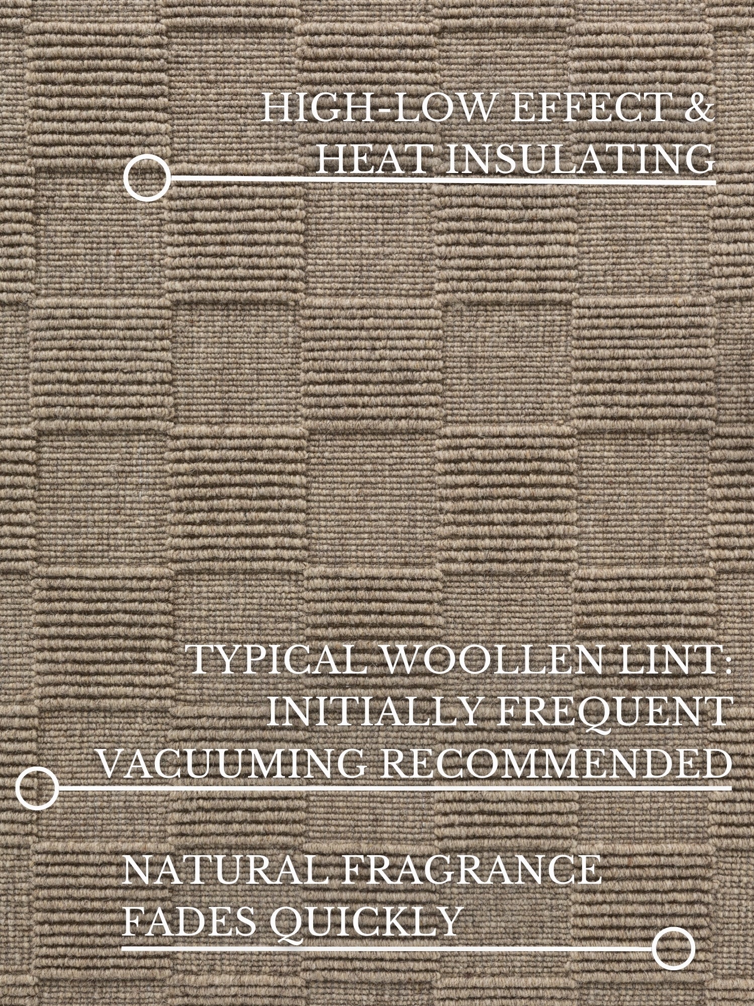 Tæppets unikke, håndvævede tern-mønster giver et sofistikeret touch, der elegant kombinerer klassisk stil med hyggelig komfort. Uldens naturlige egenskaber sikrer en behagelig temperatur og god akustik, idet den absorberer lyd og isolerer mod kulde. Bagsiden i 100% genanvendt bomuld tilføjer et bæredygtigt element og bidrager til tæppets bløde og behagelige underside. Scala tæppet er certificeret med Care & Fair-mærket, der garanterer etiske produktionsforhold. Den lette luvhøjde på 1 mm giver en behagelig følelse under fødderne.