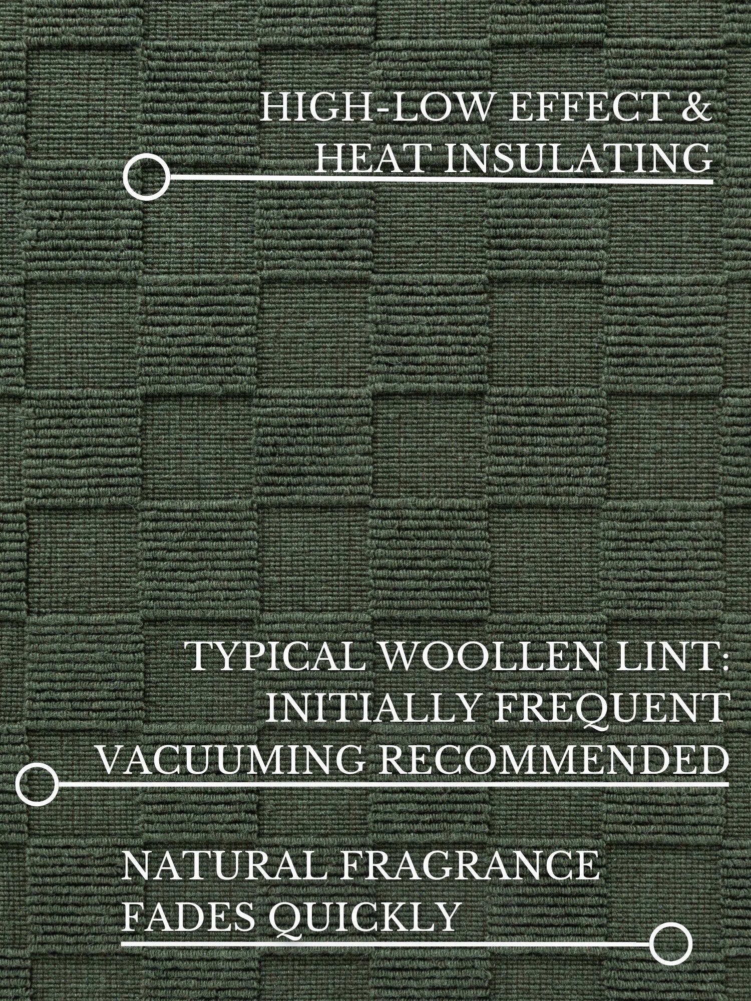 Udover den naturlige varme og lydisolerende effekt fra ulden, byder Scala tæppet på et stilfuldt, håndvævet tern-mønster, der elegant kombinerer klassisk charme med ren hygge. Bagsiden i 100% genanvendt bomuld bidrager til tæppets bæredygtighed og giver et blødt underlag. Tæppet er desuden certificeret med Care & Fair mærket, der garanterer etiske produktionsforhold. Den lave luvhøjde på 1 mm giver en behagelig og tæt følelse under fødderne.