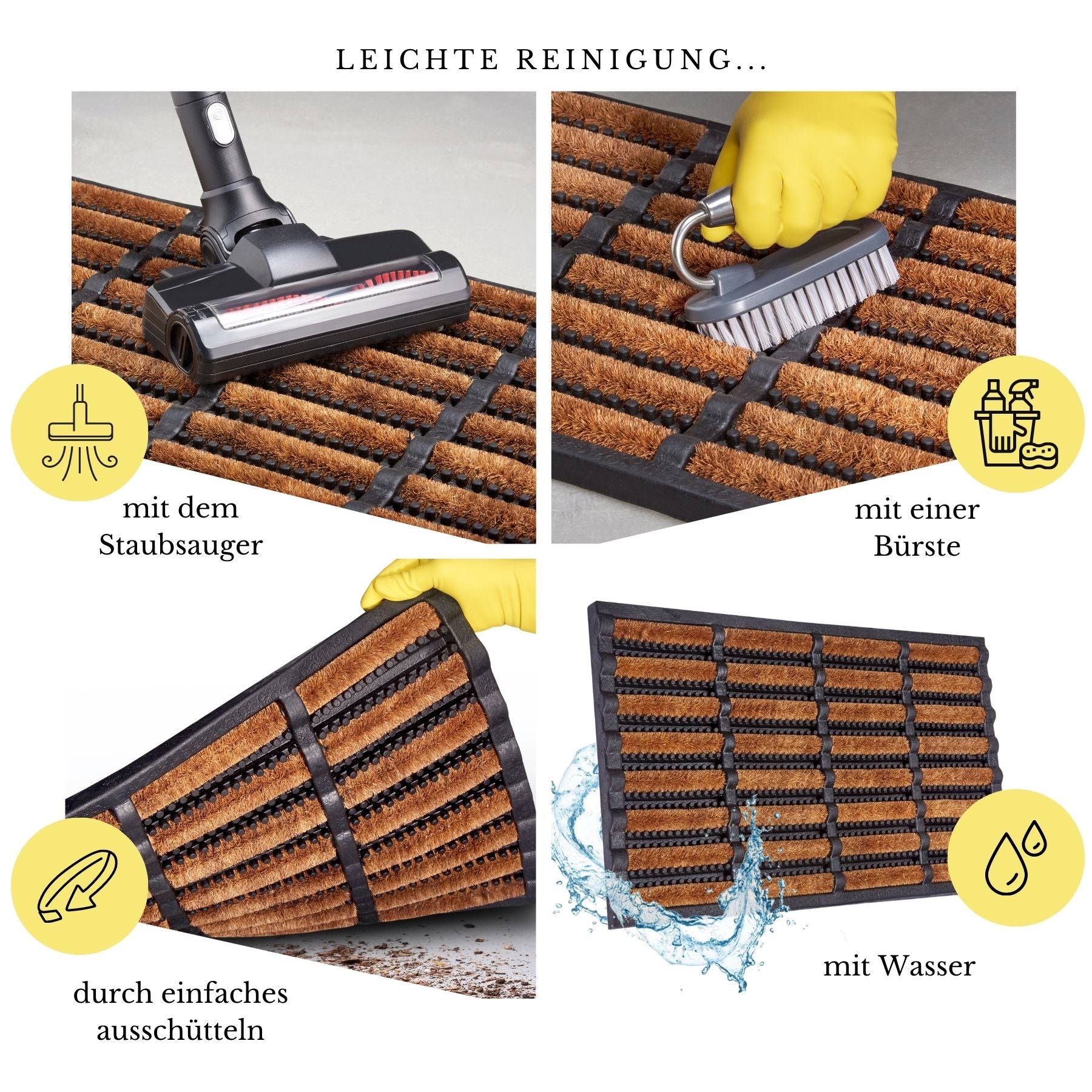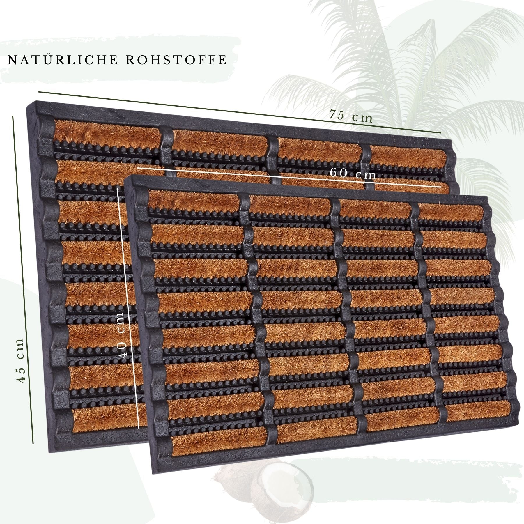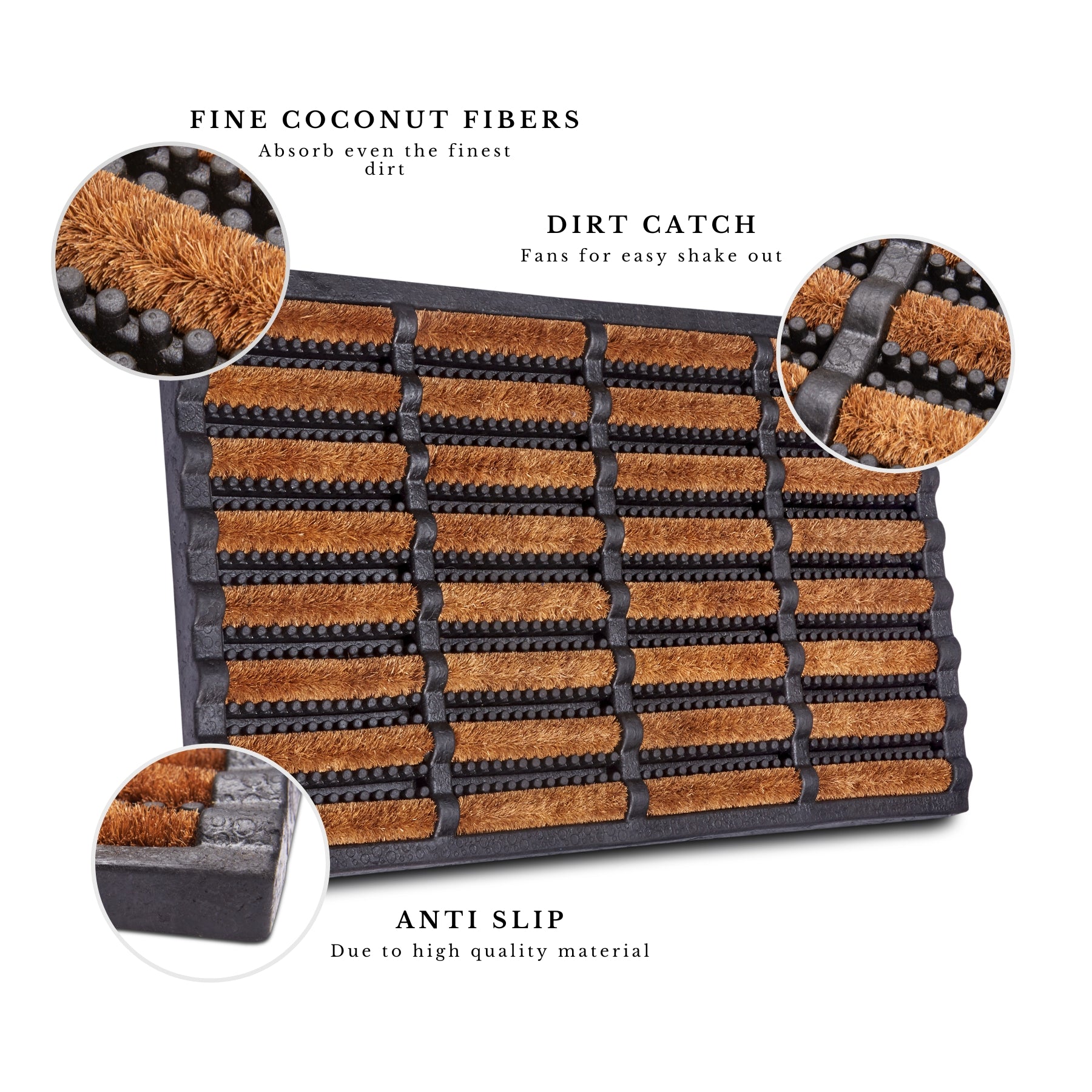 De robuste kokosfibre skraber effektivt snavs af dine sko, mens den skridsikre bagside af 100% gummi sørger for, at måtten ligger stabilt, selv på glatte gulve. Kokosfibrene er naturligt resistente overfor bakterier, så både snavs og bakterier bliver på måtten og transporteres ikke ind i din bolig. Det giver dig et renere og mere hygiejnisk hjem.