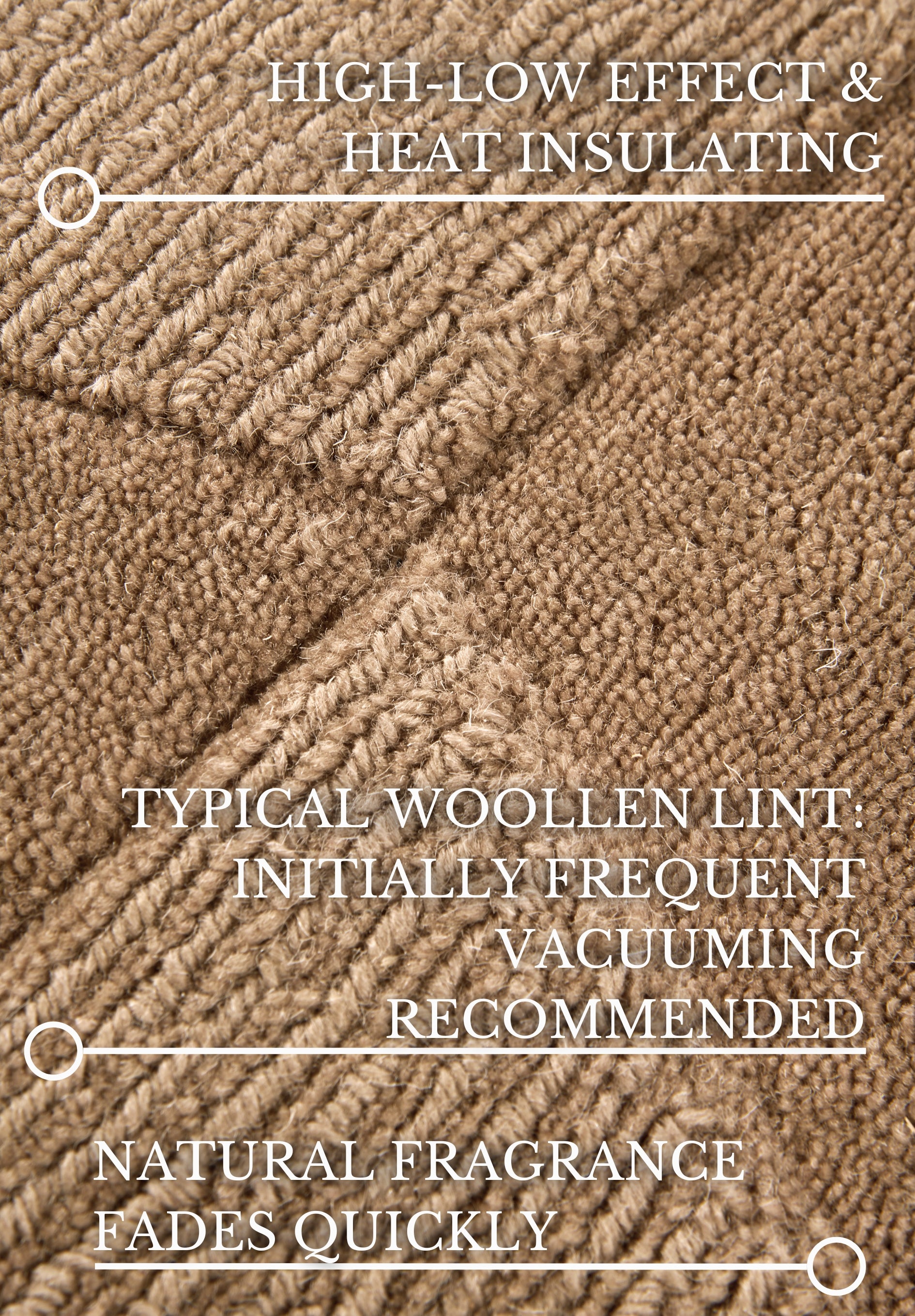 Dette håndvævede uldtæppe imponerer med sine klassiske farver og et tidløst design, der passer til enhver indretningsstil. Den lette high-low struktur giver tæppet et unikt og sofistikeret udtryk. Den høje kvalitet og de naturlige fibre gør tæppet slidstærkt og nemt at passe. Bagsiden i 100% bomuld giver ekstra stabilitet og beskytter dit gulv.