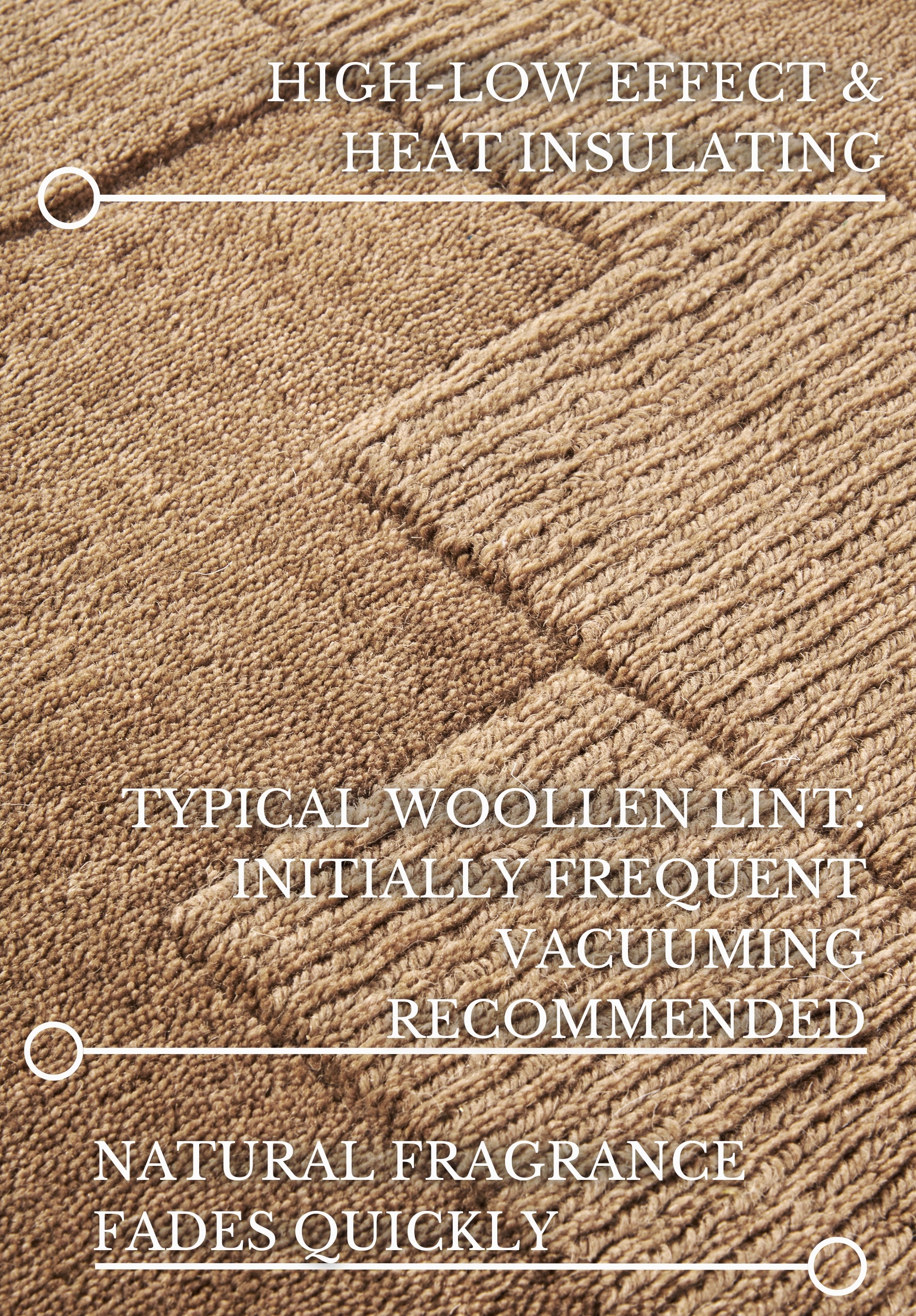 Dette håndvævede uldtæppe imponerer med sin klassiske farve og et tidløst design, der passer til enhver indretningsstil. Den lette high-low struktur giver tæppet et unikt og sofistikeret præg. Den høje kvalitet og de naturlige fibre gør tæppet slidstærkt og nemt at passe på. Bagsiden i 100% bomuld sikrer stabilitet og forhindrer tæppet i at glide på gulvet.