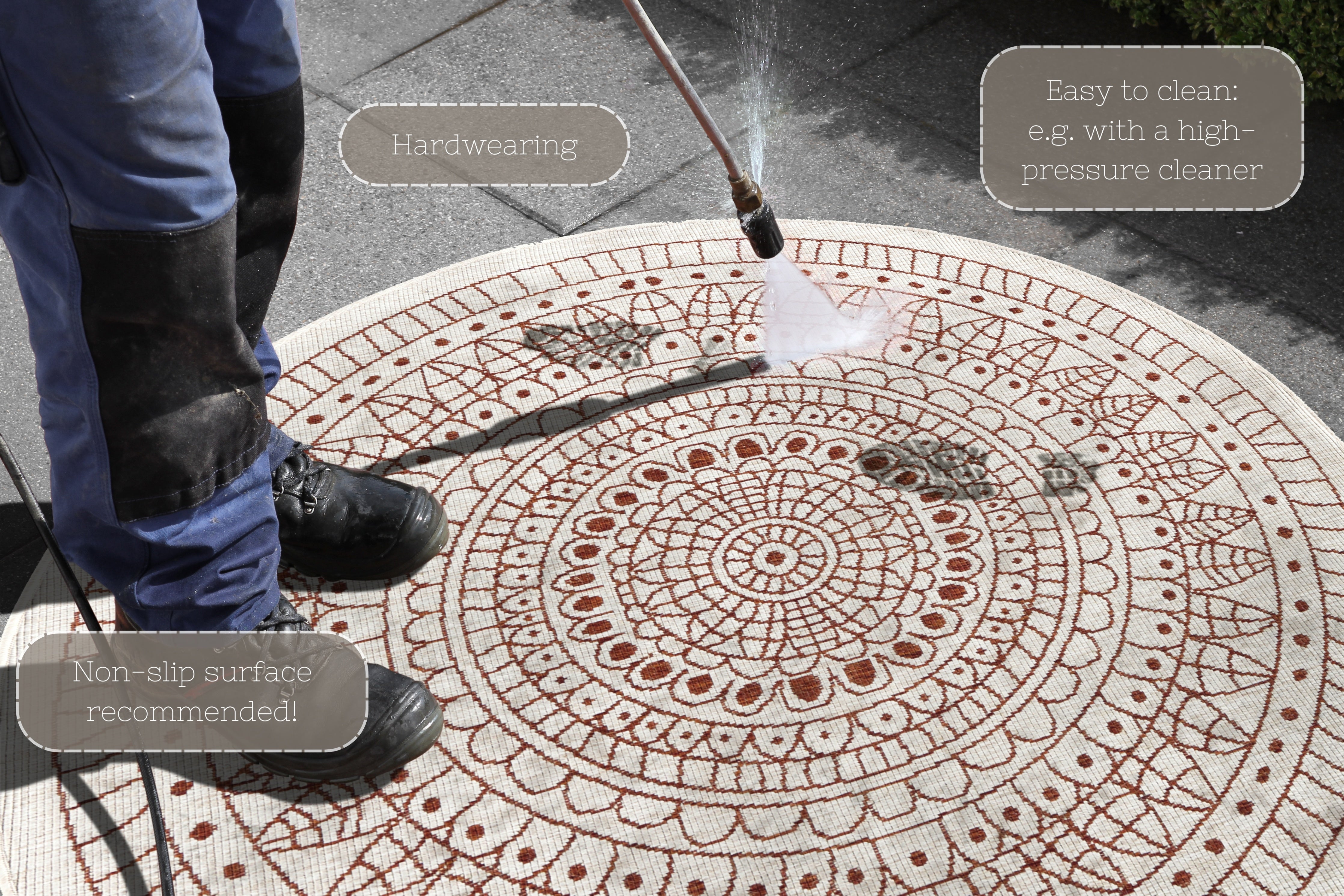 Twin tæppet er en sand all-rounder, der kan bruges både inde og ude takket være dets vejrbestandige design. Det moderne mandala-mønster i terra/creme farver tilføjer et strejf af elegance til din indretning, mens den slidstærke polypropylen bagside sikrer stabilitet og lang levetid. Tæppet er nemt at rengøre og passer til alle gulvtyper, inklusive gulvvarme, hvilket gør det til et praktisk og stilfuldt valg.