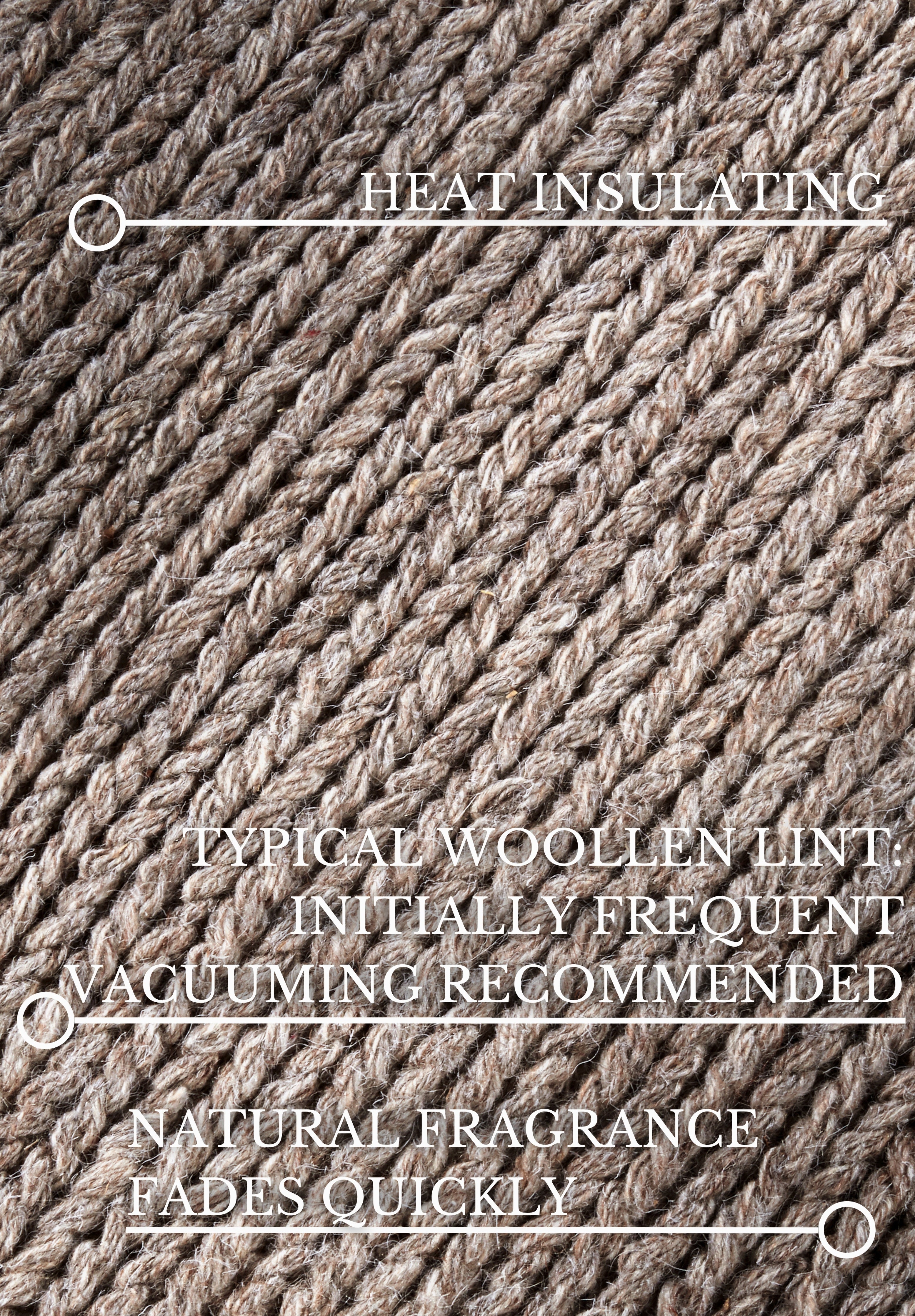 Tæppets naturlige uldfibre skaber ikke blot et behageligt underlag, men bidrager også til et sundt indeklima. Det er robust og nemt at vedligeholde, samtidig med at det er velegnet til gulvvarme, så du kan nyde komforten året rundt. Bagsiden i 100% bomuld giver tæppet stabilitet og forhindrer det i at glide. Den naturlige uld kan i starten have en karakteristisk duft og afgive nogle fibre – dette er helt normalt og forsvinder med tiden. Den tidløse stil passer smukt ind i enhver indretning.