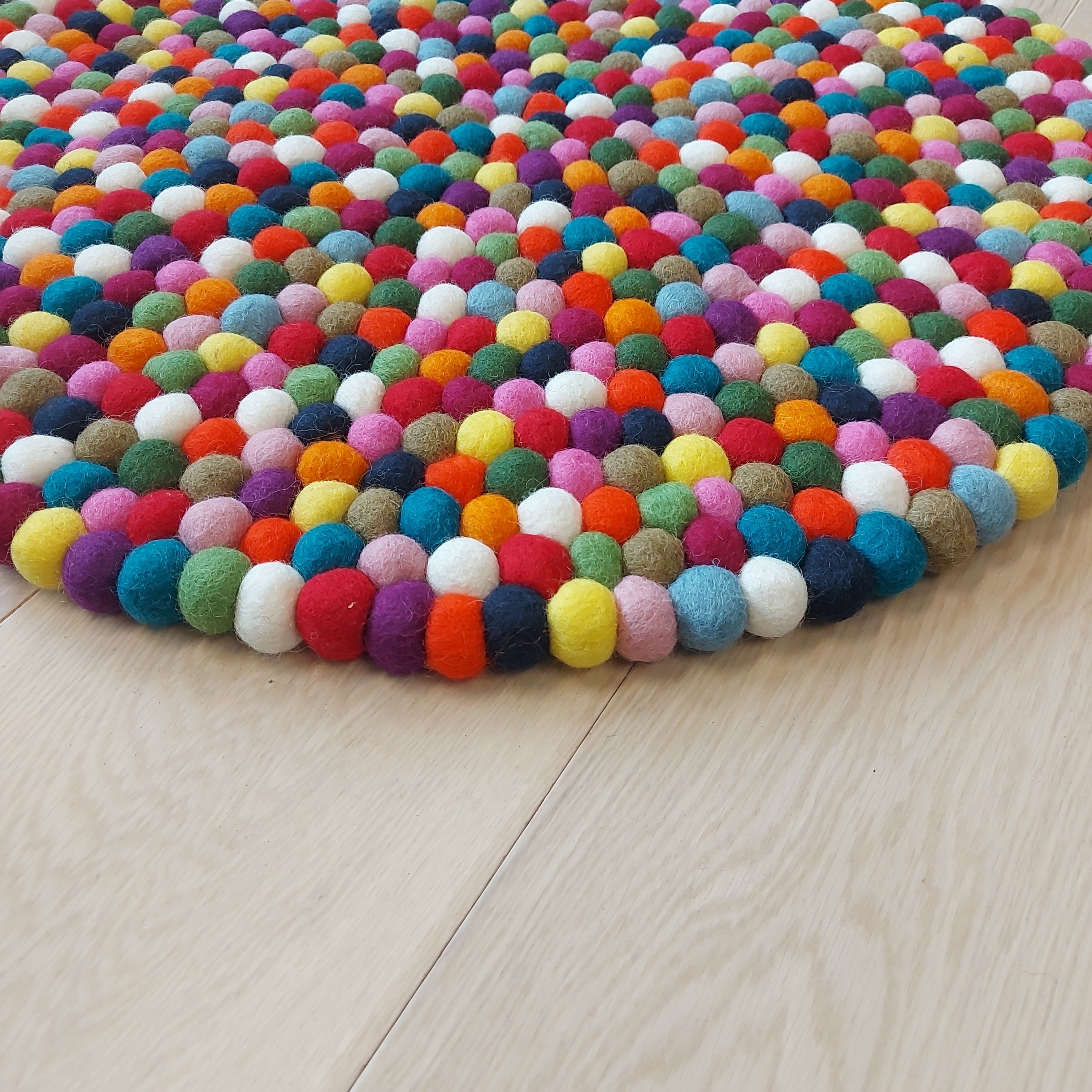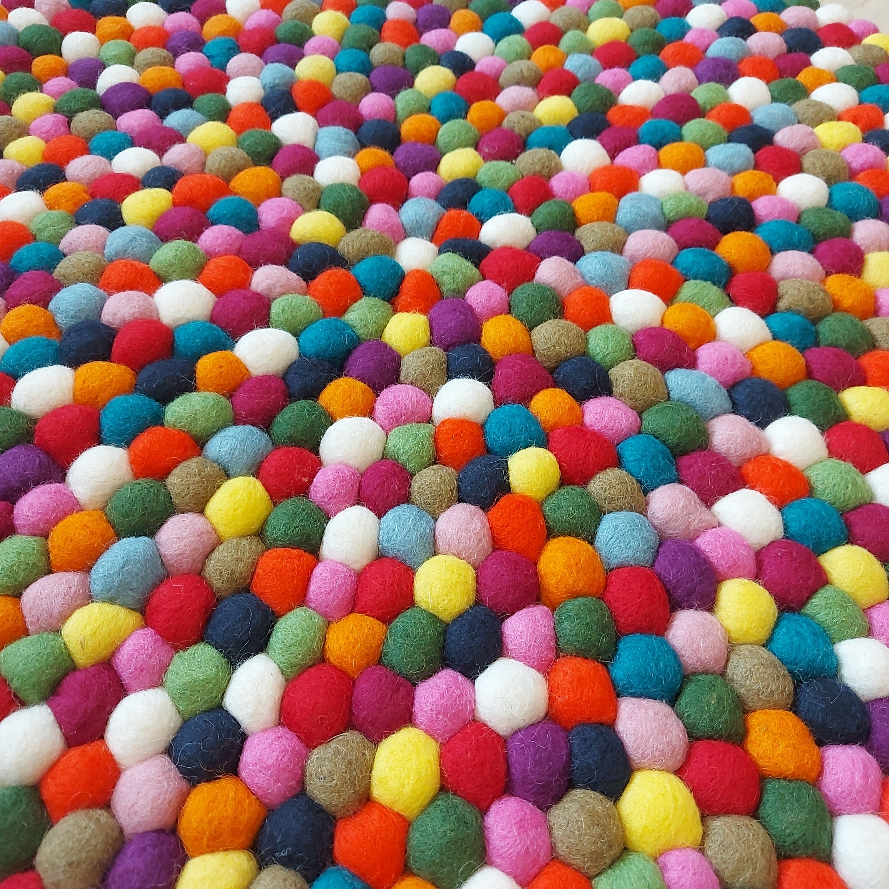 Alle vores smukke kugletæpper er i højeste kvalitet og består af små kulørte filtkugler, der bliver sammensat i hånden. På den måde er der ikke to tæpper der er ens, hvilket er en del af charmen, mindre variationer i størrelser kan forekomme.