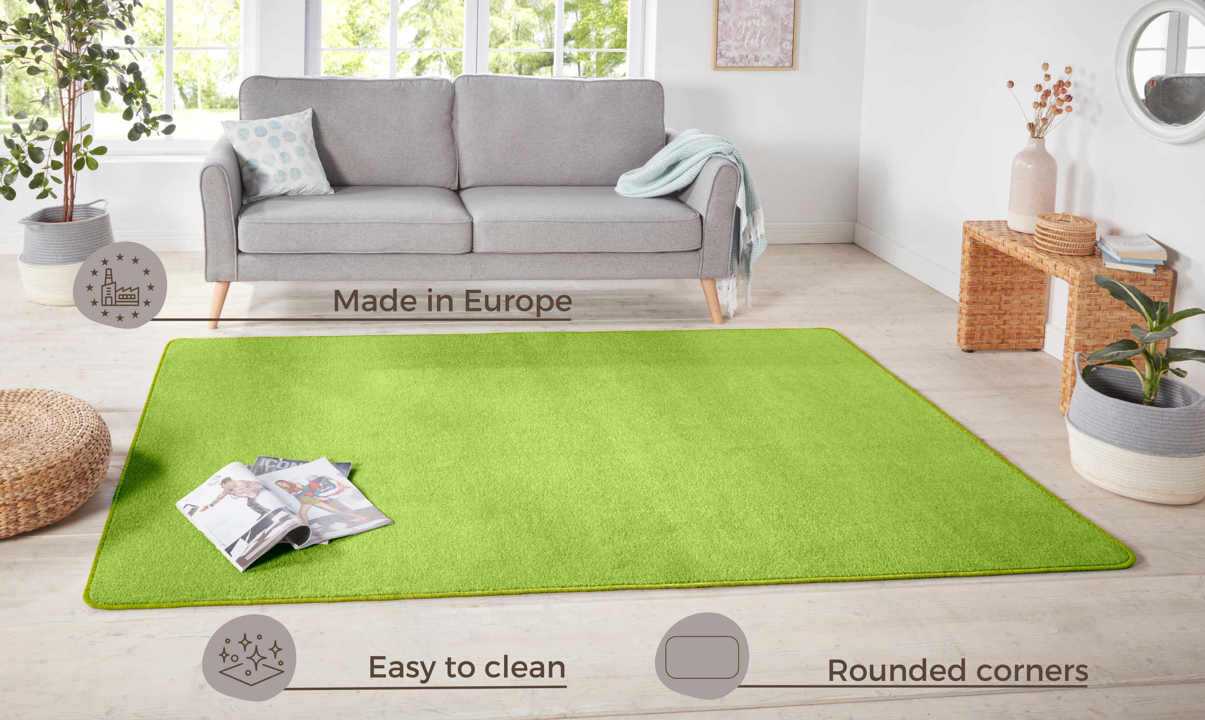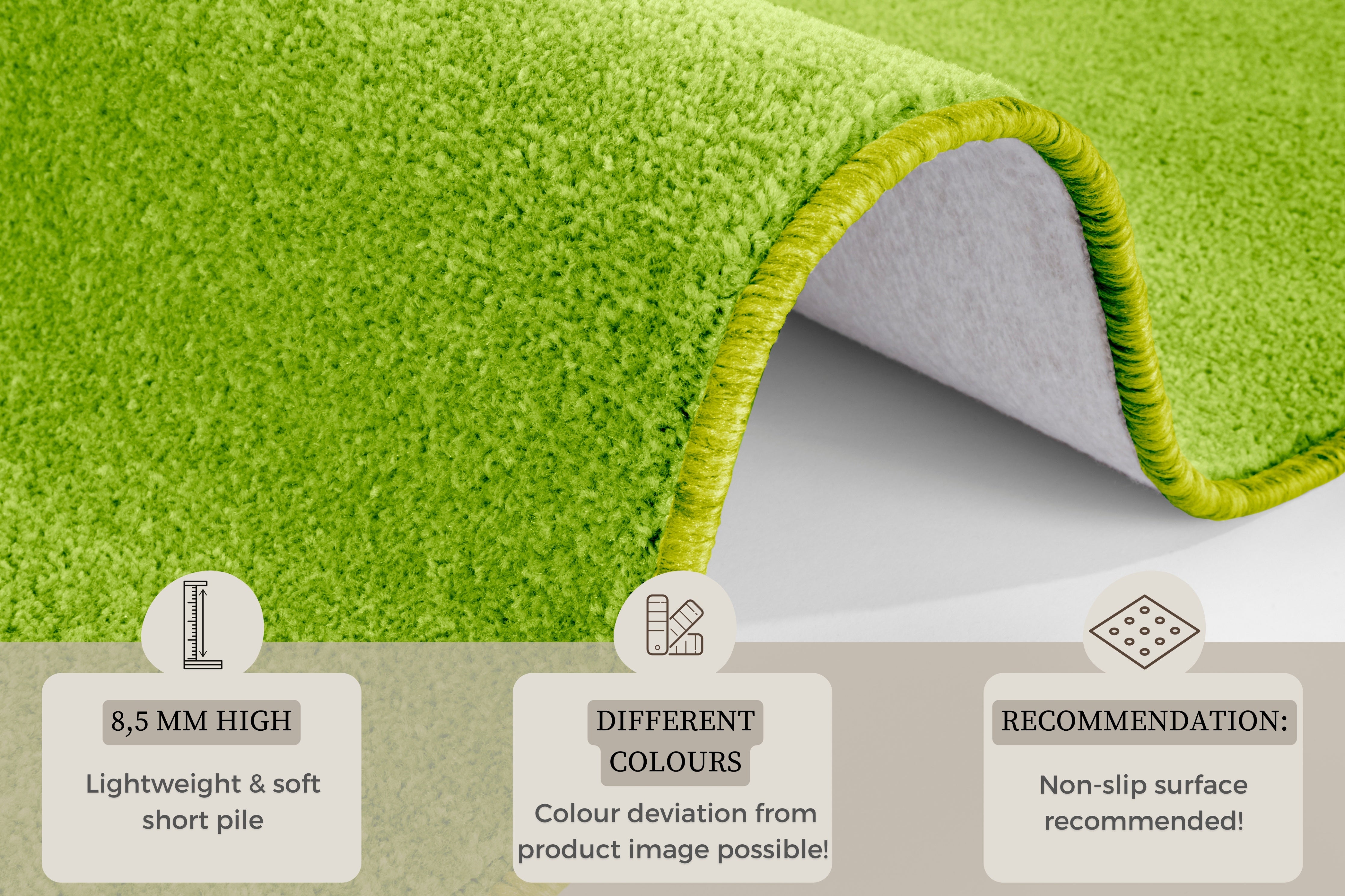 Nasty-tæppet er mere end bare et smukt element i din indretning. Den bløde fleecebagside sikrer ikke kun et stabilt greb på gulvet, men tilføjer også et ekstra lag af komfort under fødderne. Det er desuden velegnet til gulvvarme, så du kan nyde den bløde fornemmelse året rundt. Den lette rengøring gør det til et praktisk valg for en travl hverdag. Med et bredt udvalg af farver og former i Nasty-kollektionen, finder du nemt det perfekte match til din personlige stil og ethvert rum i dit hjem.