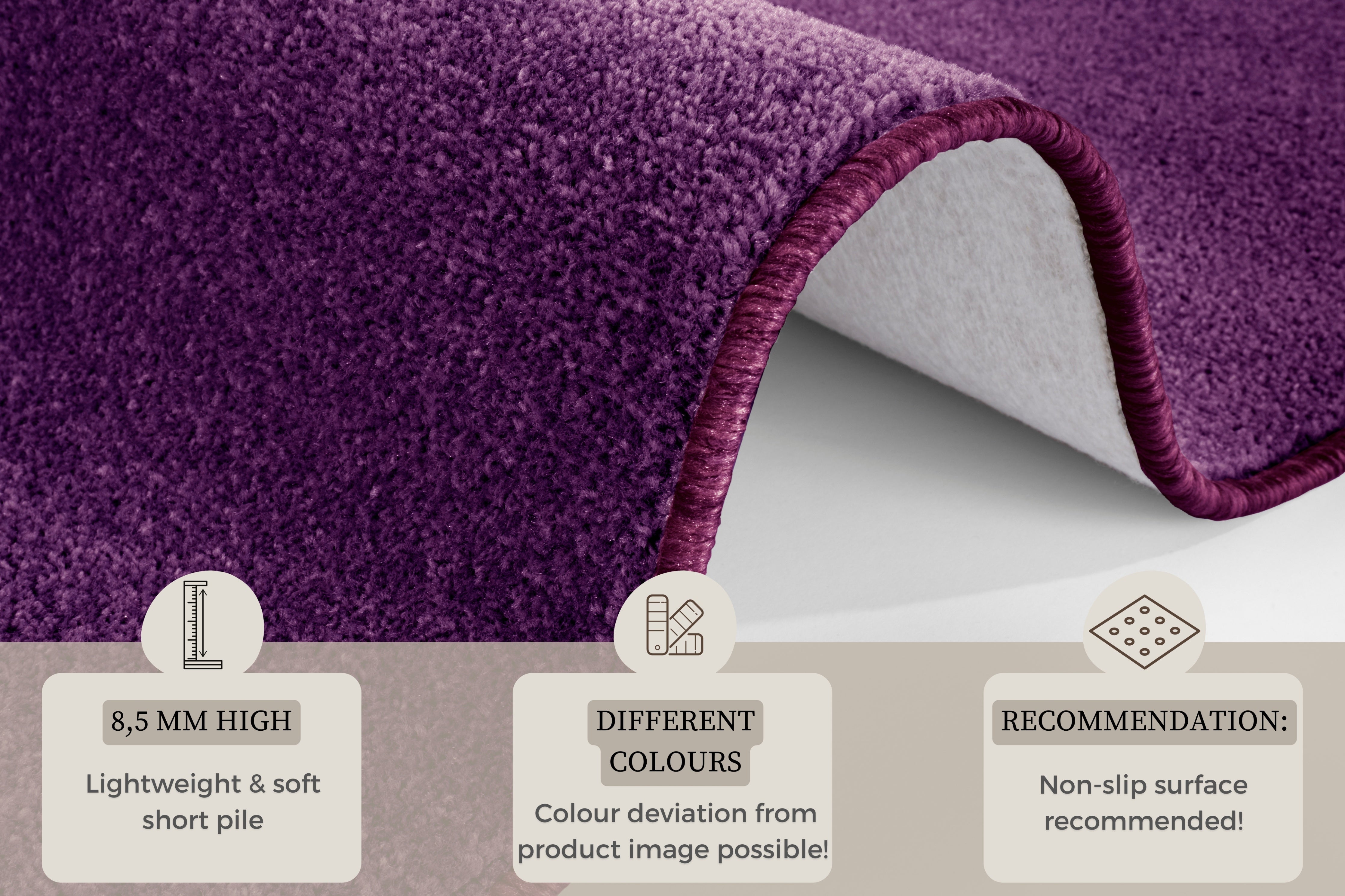 Med en luvhøjde på 0.85 mm tilbyder "Nasty - 101150 Lilla" tæppet en behagelig, blød fornemmelse under fødderne. For at holde tæppet rent og pænt anbefales det at rengøre det med tæpperens eller tæppeshampoo. Giv dit hjem et løft med dette stilfulde og funktionelle tæppe fra Hanse Home.