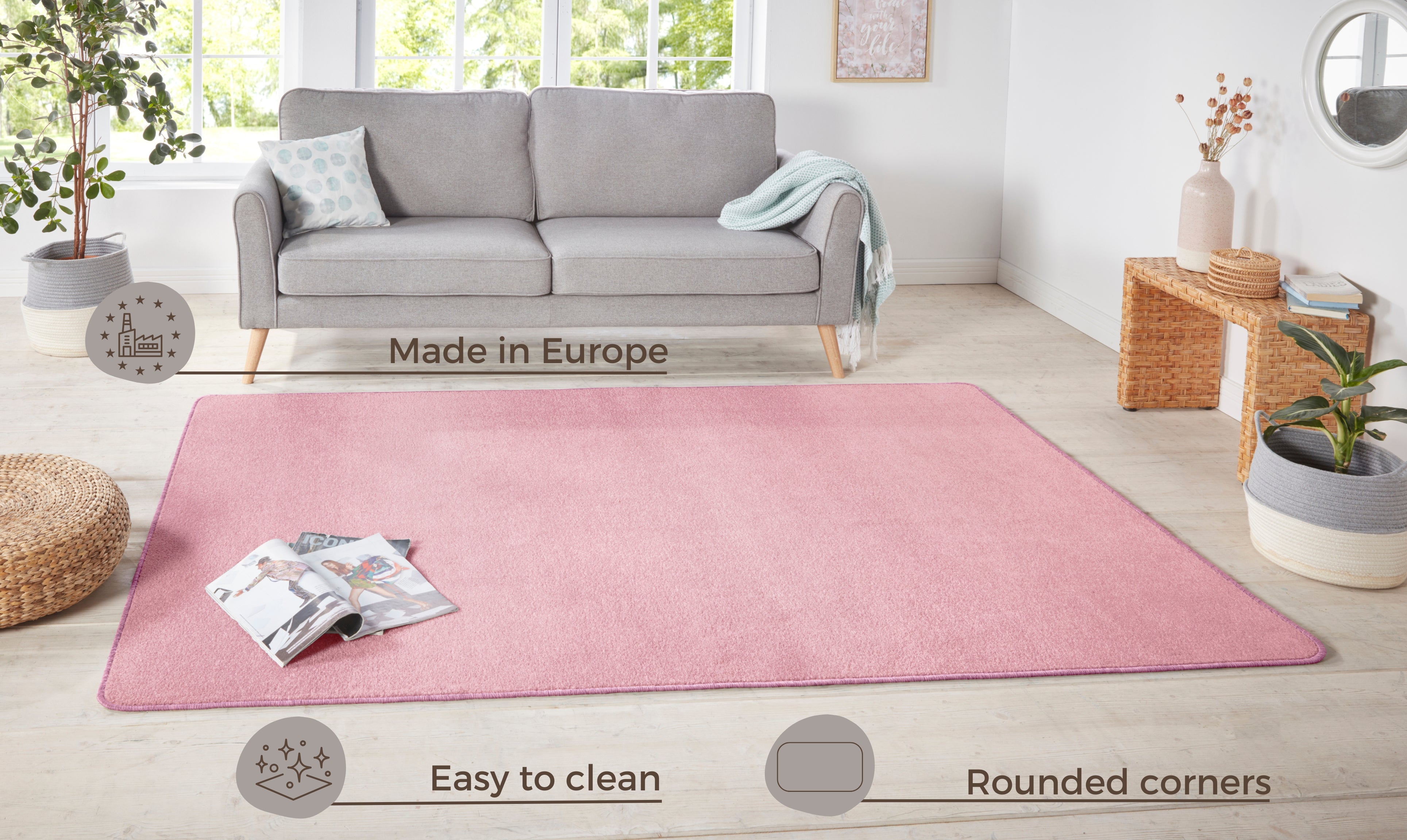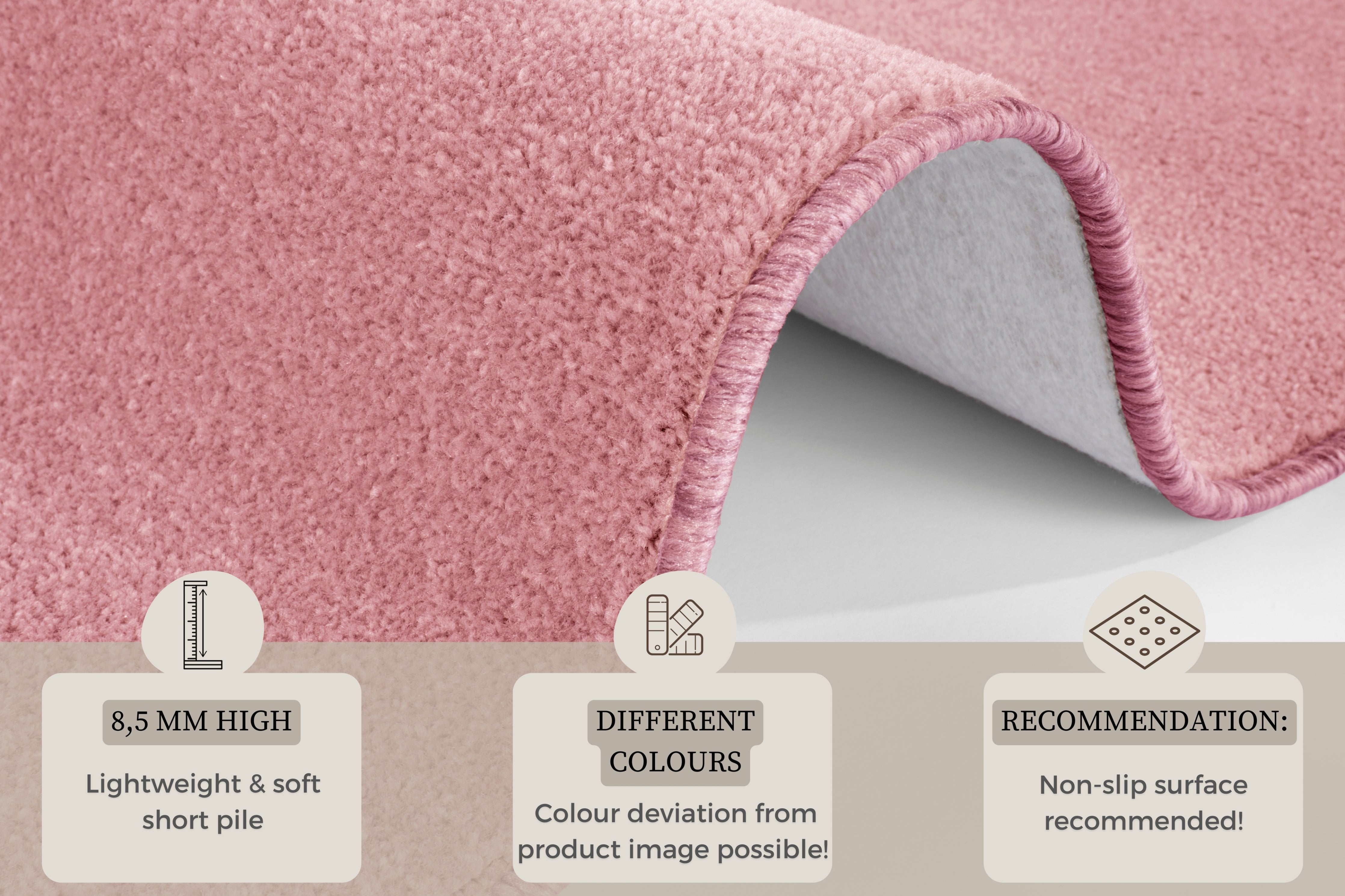 Med en luvhøjde på 0.85 mm tilbyder "Nasty - 104446 Rosa" en behagelig blødhed under fødderne. For at holde tæppet rent og pænt anbefales det at rengøre det med tæpperens eller tæppeshampoo.