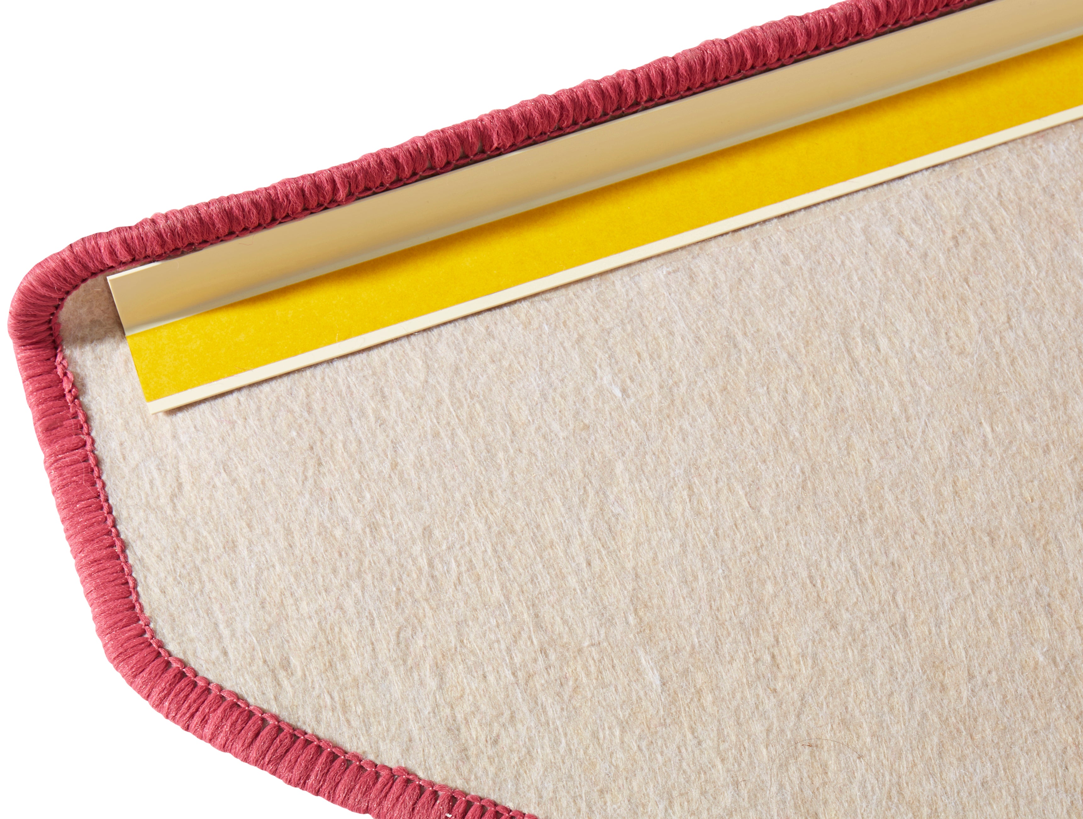 Monteringen er enkel, da hvert tæppe har en stabil kantliste og en klæbestribe på bagsiden, så de bliver liggende på trinnene.