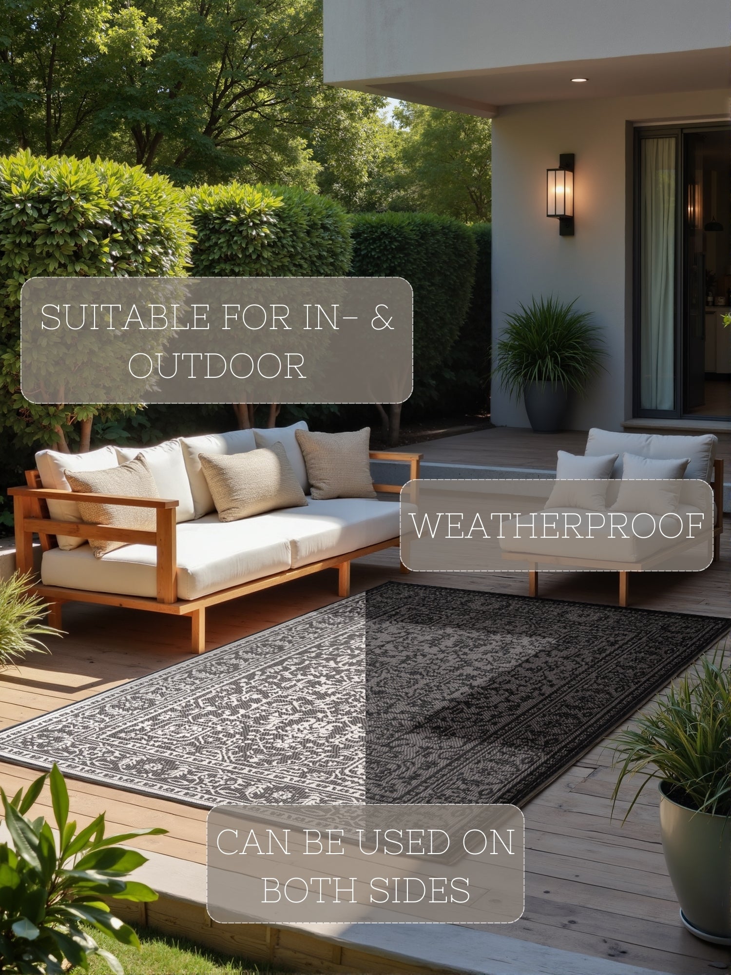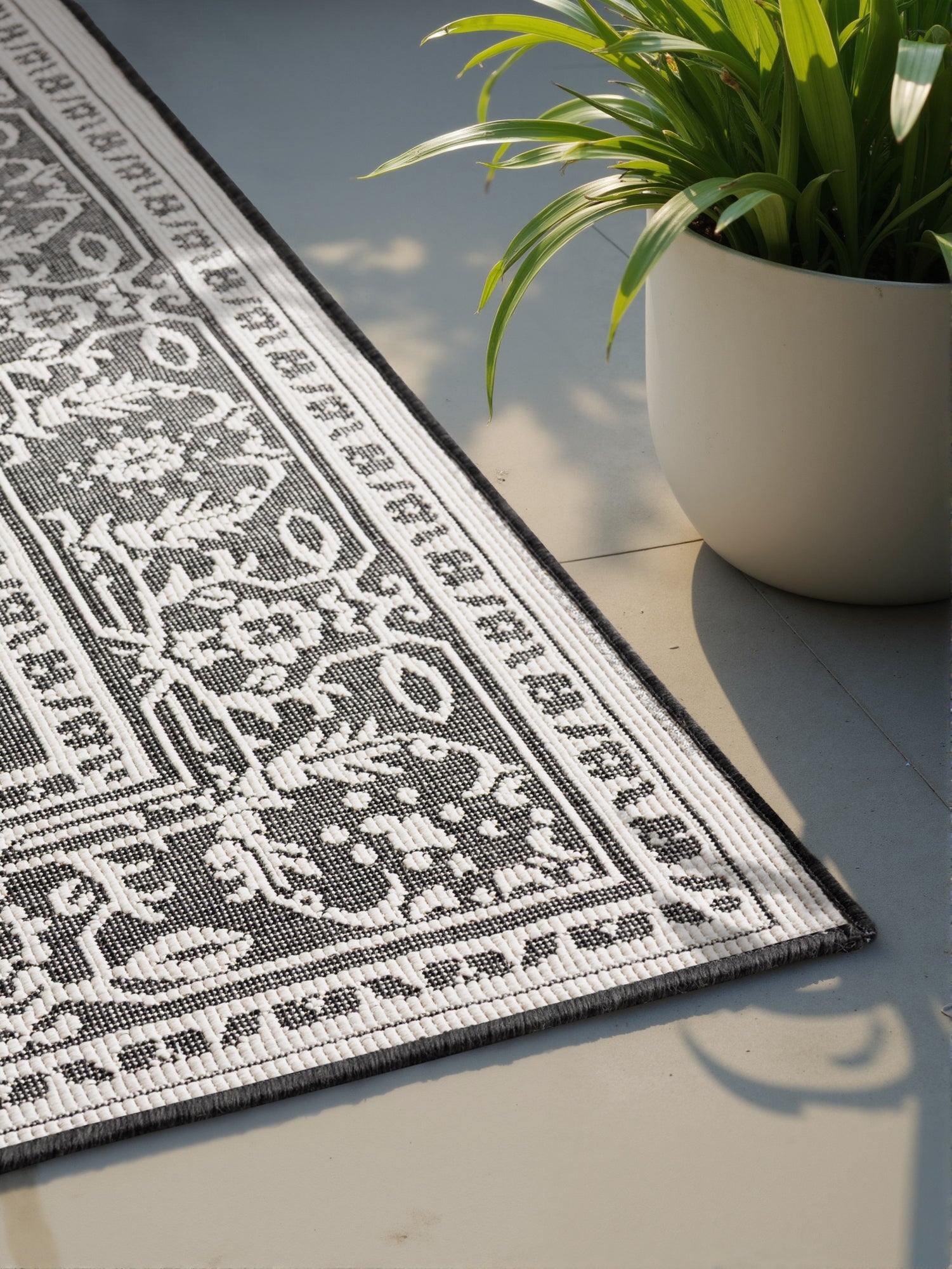 Skab et stilfuldt og funktionelt uderum med Inde&Udendørs Tæppe - Duet - 106248 i et moderne sort/hvidt design. Dette alsidige tæppe er fremstillet af 100% slidstærkt polypropylen, der giver et robust og let tæppe, perfekt til både indendørs hygge og udendørs afslapning.