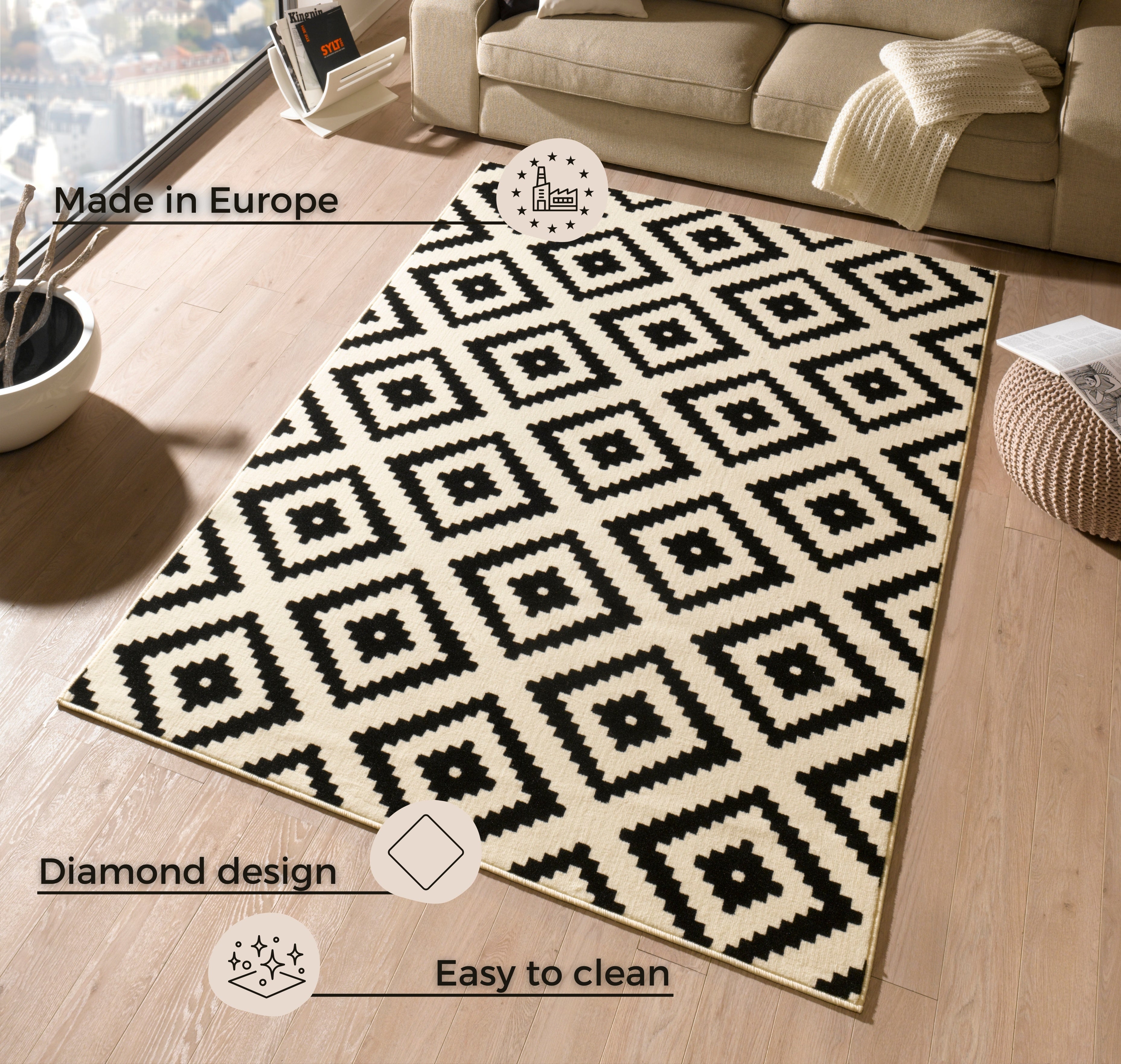 Et af vores billigste tæpper. Giv dit hjem et stilfuldt løft med Hamla - 102332 tæppet i en elegant sort/creme farvekombination. Det slidstærke polypropylen-materiale skaber en behagelig overflade, der er nem at vedligeholde og samtidig tilføjer et strejf af moderne elegance til ethvert rum.