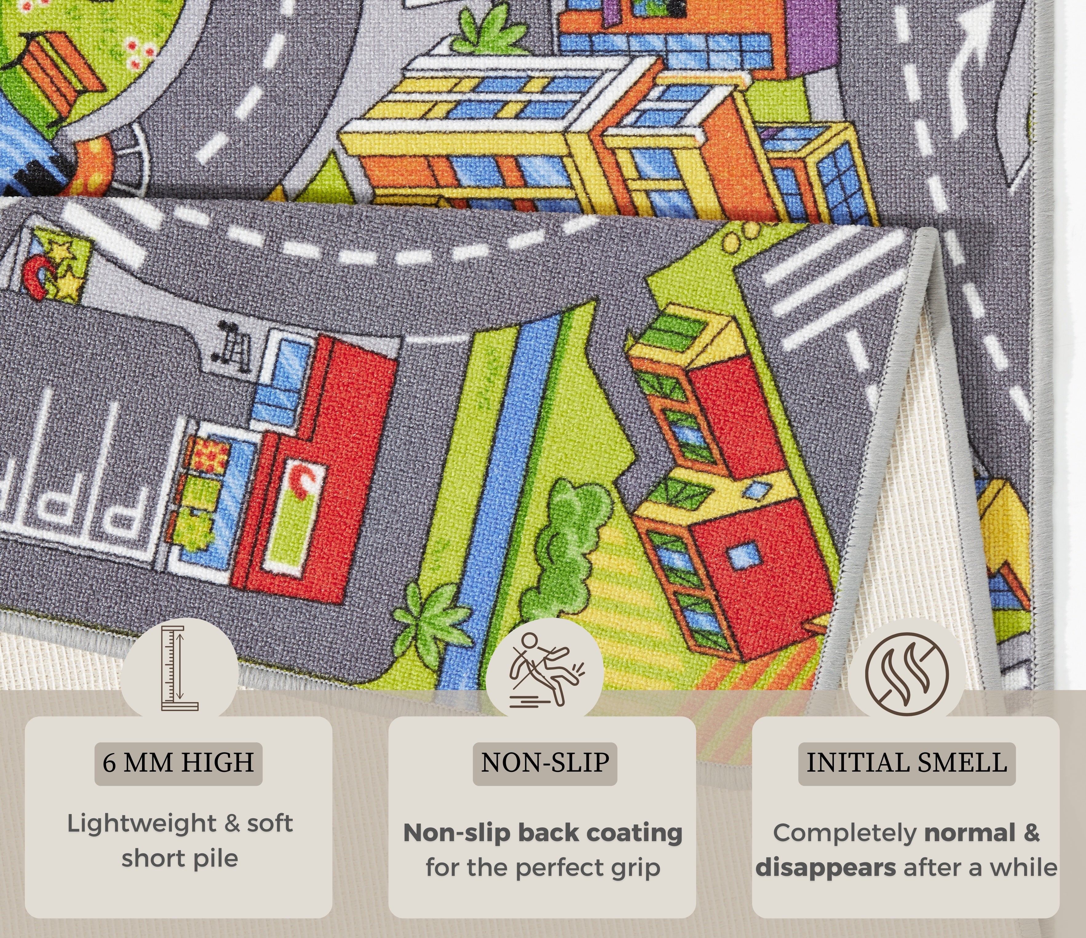 Den korte luv på 0,65 mm giver en behagelig overflade, der er både blød at røre ved og nem at rengøre. Den robuste polyamidkonstruktion gør tæppet særdeles holdbart og modstandsdygtigt over for slid, perfekt til et livligt børneværelse. Tæppets underside er af filt, hvilket giver et godt greb på gulvet og forhindrer det i at skride. "Play" børnetæppet kombinerer et moderne design med kvalitetsmaterialer og lyse farver for at give dit barn en unik oplevelse.