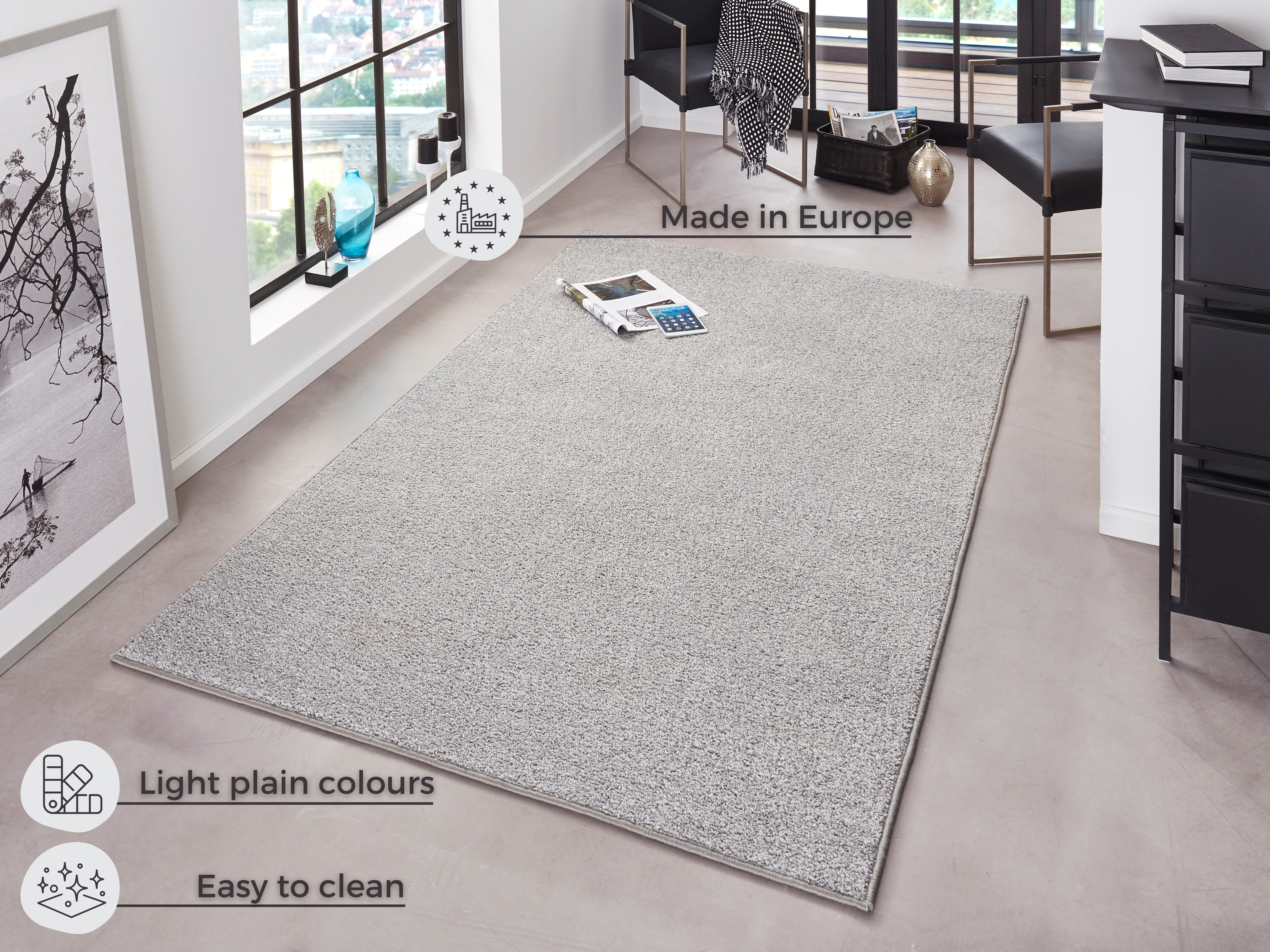 Skab en elegant og rolig atmosfære i dit hjem med det stilrene Pure-tæppe i en sofistikeret grå nuance. Det ensfarvede design er skabt til at integrere sig perfekt i moderne boligindretninger og tilføje et strejf af tidløs klasse til ethvert rum. Tæppet er produceret i Europa, hvilket sikrer både høj kvalitet og kortere transportveje.