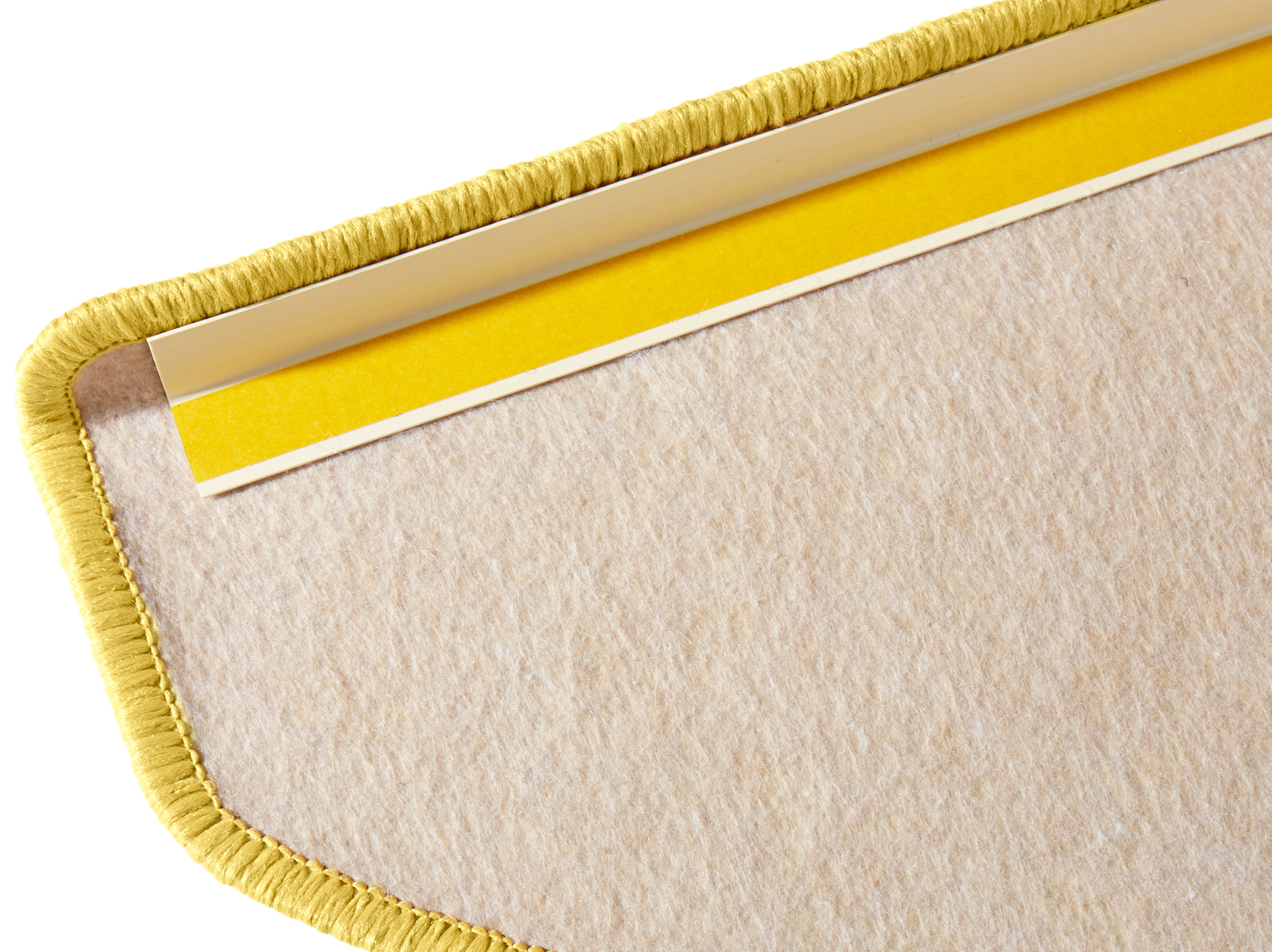 Monteringen er enkel, da hvert tæppe har en stabil kantliste og en klæbestribe på bagsiden, så de bliver liggende på trinnene.