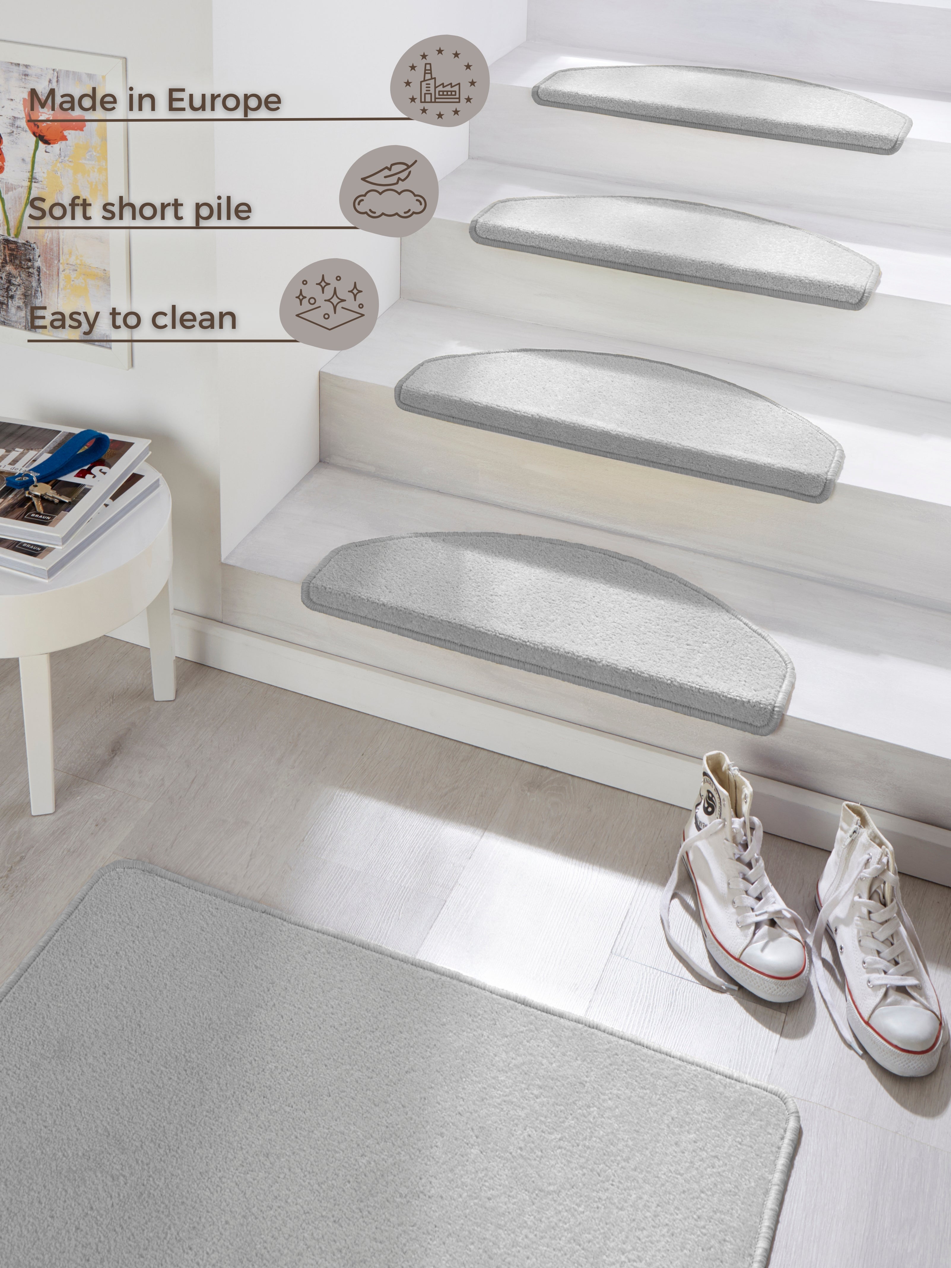 Hvert tæppe måler 23 x 65 cm og kommer i en pakke med i alt 15 stk., hvilket gør det nemt at beklæde en hel trappe.