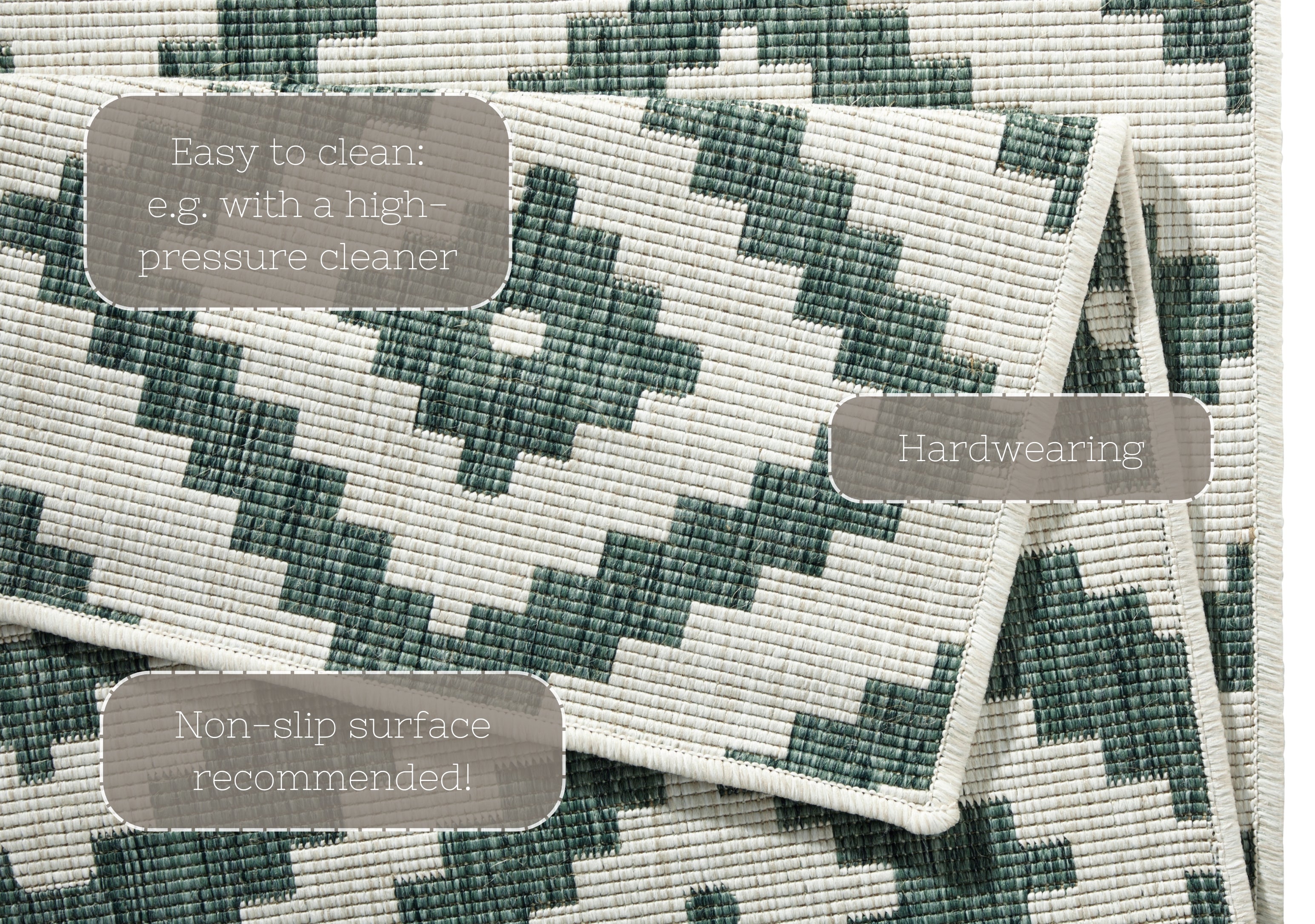 Twin tæppets geometriske design er ikke kun smukt, det er også utroligt praktisk. Det vendbare design giver dig to forskellige looks i ét tæppe, så du nemt kan forny din indretning. Polypropylenmaterialet, både i luv og bagside, gør tæppet vejrbestandigt og nemt at rengøre – perfekt til travle hverdage. Tæppet er desuden egnet til alle gulvtyper, inklusive gulvvarme, hvilket gør det til et sandt all-round valg til det moderne hjem.