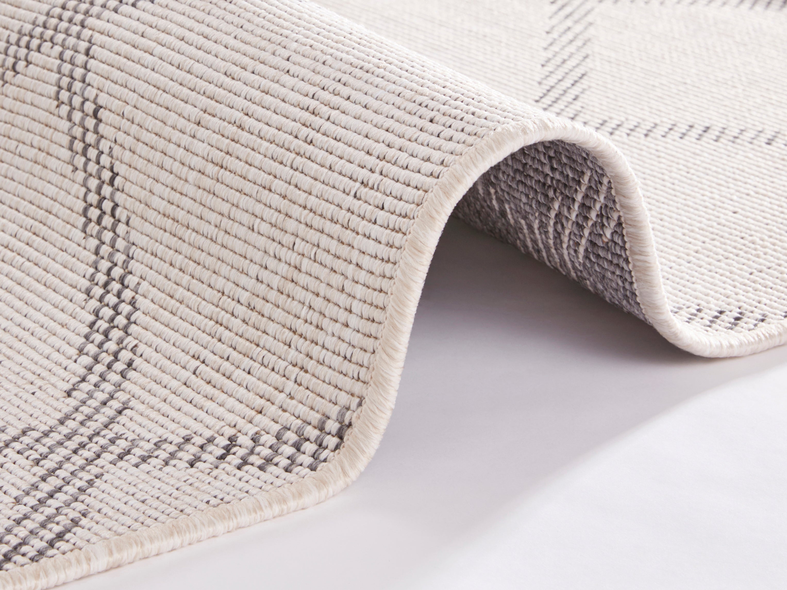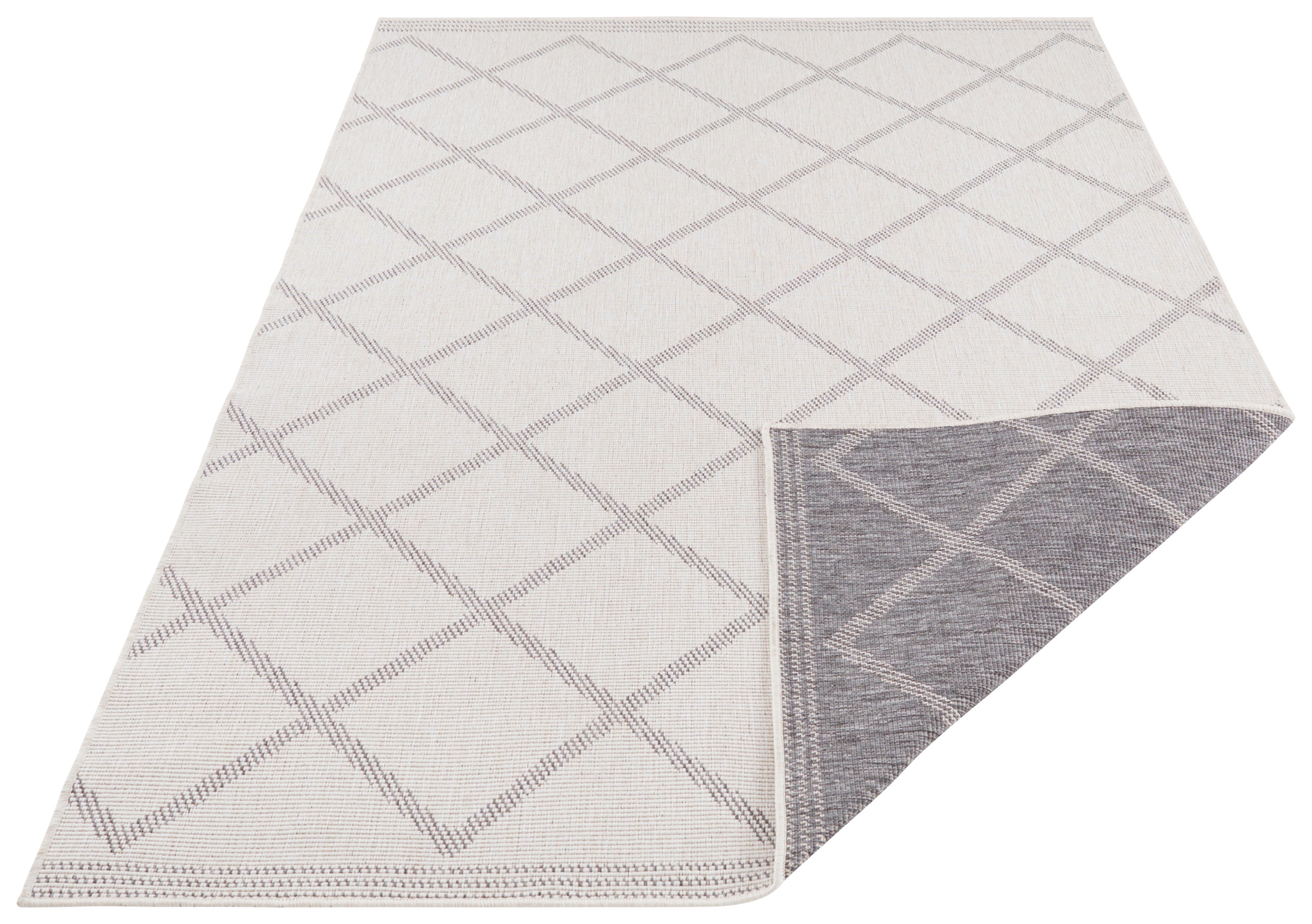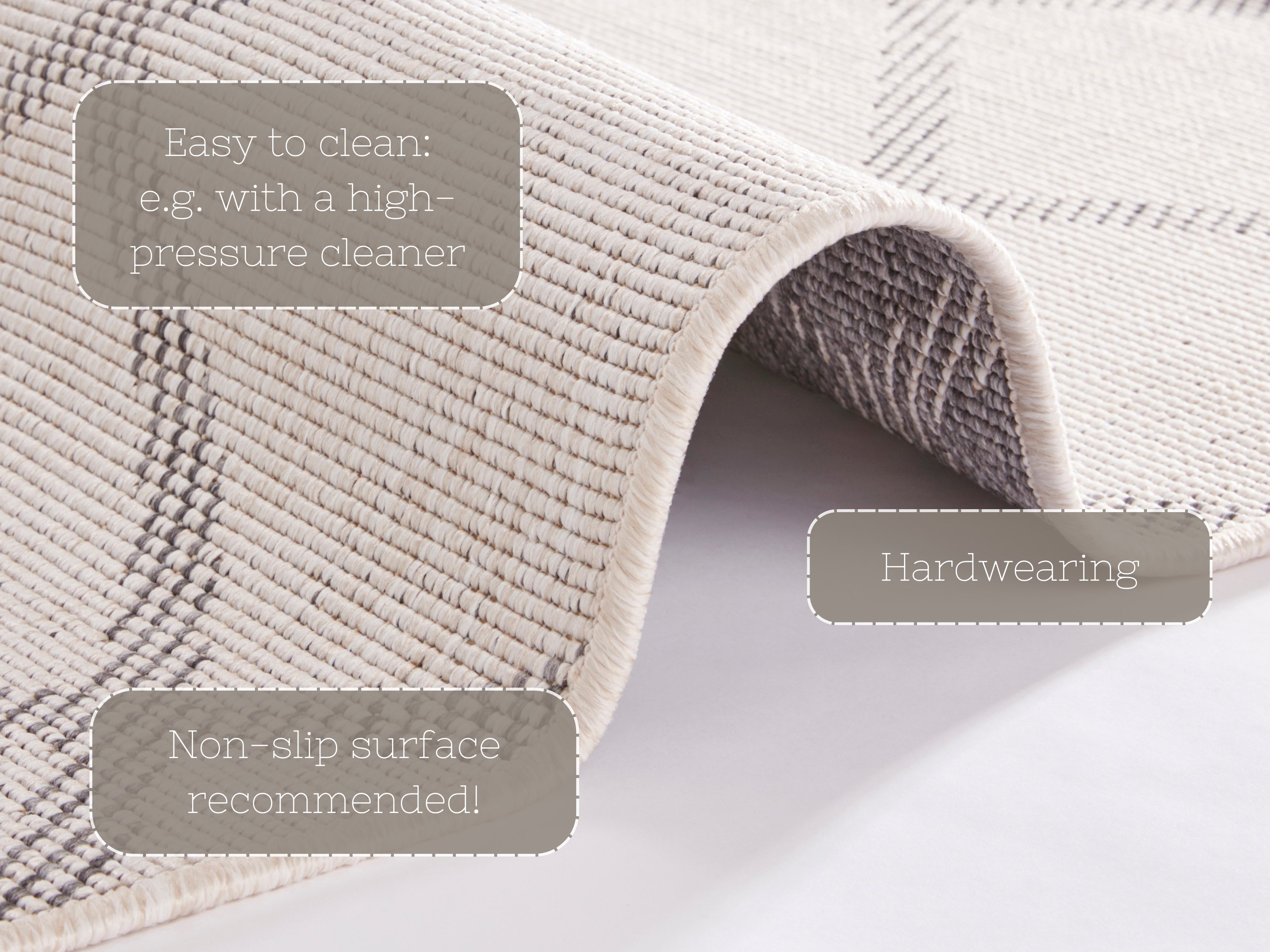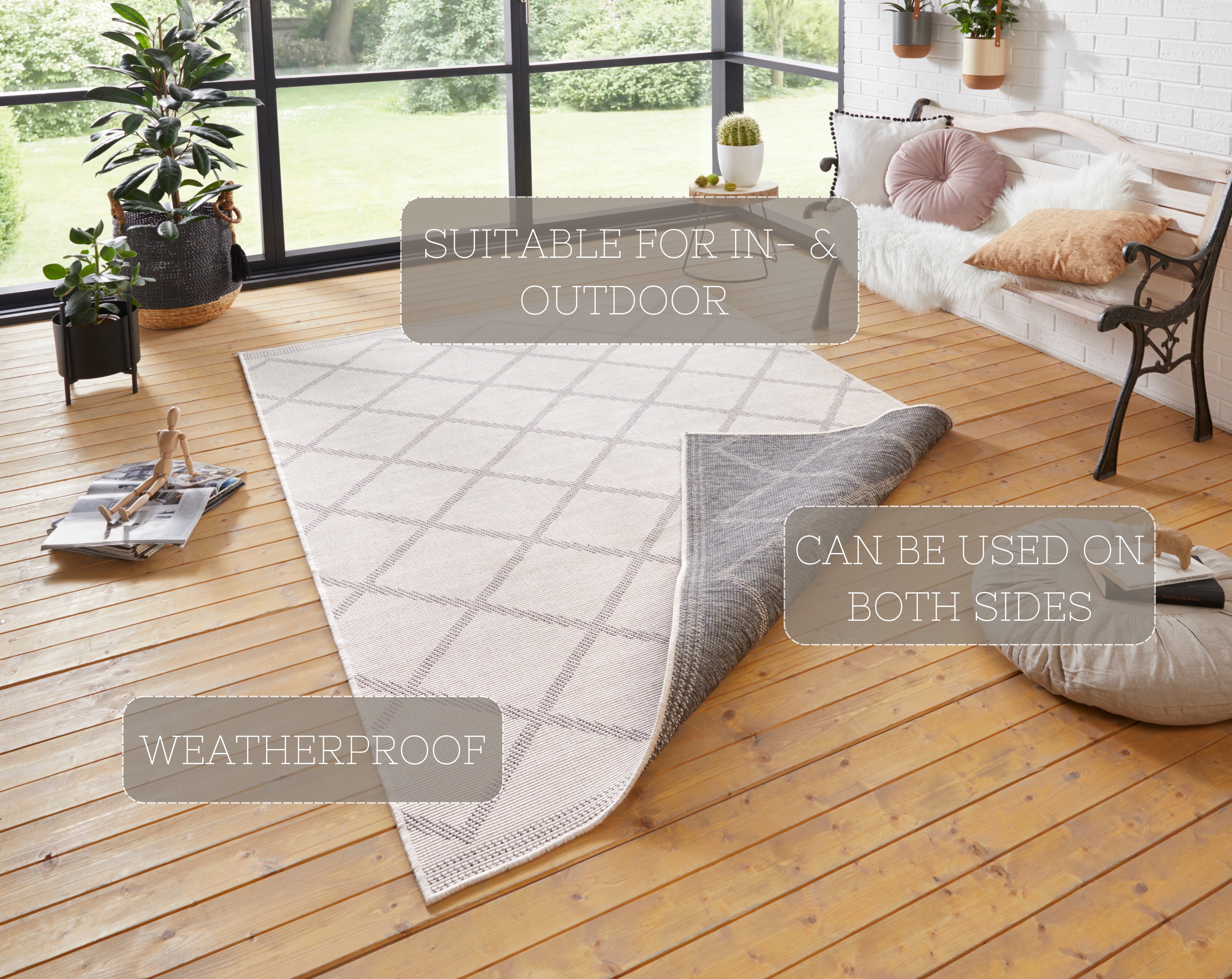 Dette alsidige tæppe er en sand all-rounder. Det vendbare design giver dig to forskellige looks i ét, mens det geometriske mønster skaber et moderne udtryk. Tæppet er vejrbestandigt og nemt at rengøre, hvilket gør det ideelt til terrassen, altanen eller i hjemmet med børn og kæledyr. Den robuste polypropylen bagside sikrer stabilitet og forhindrer tæppet i at glide, samtidig med at det er egnet til gulvvarme.