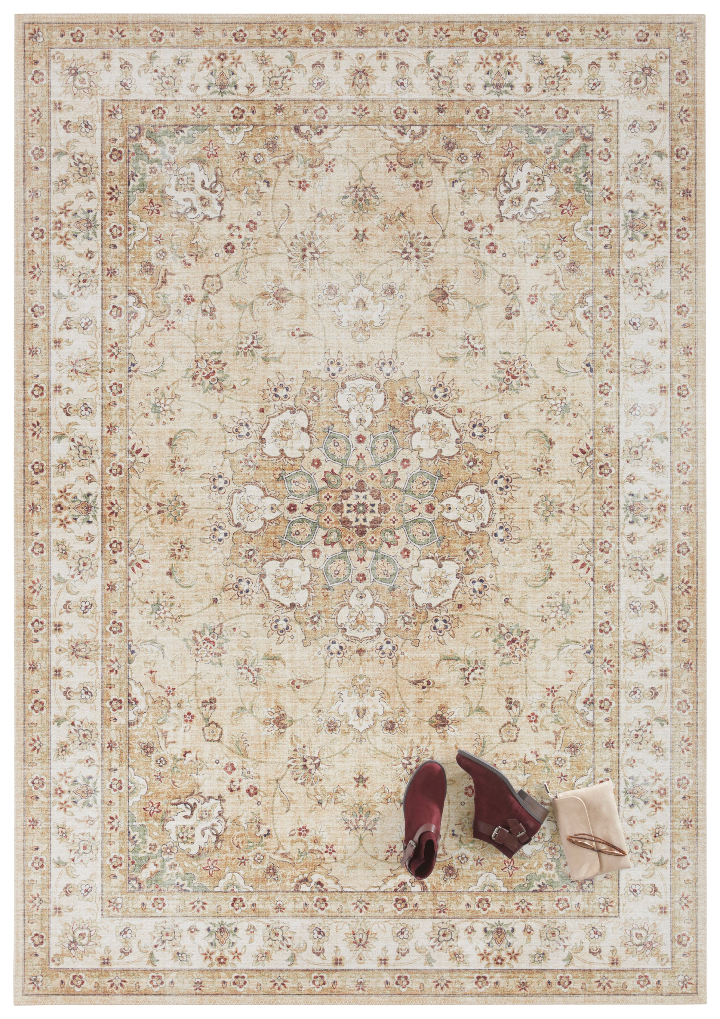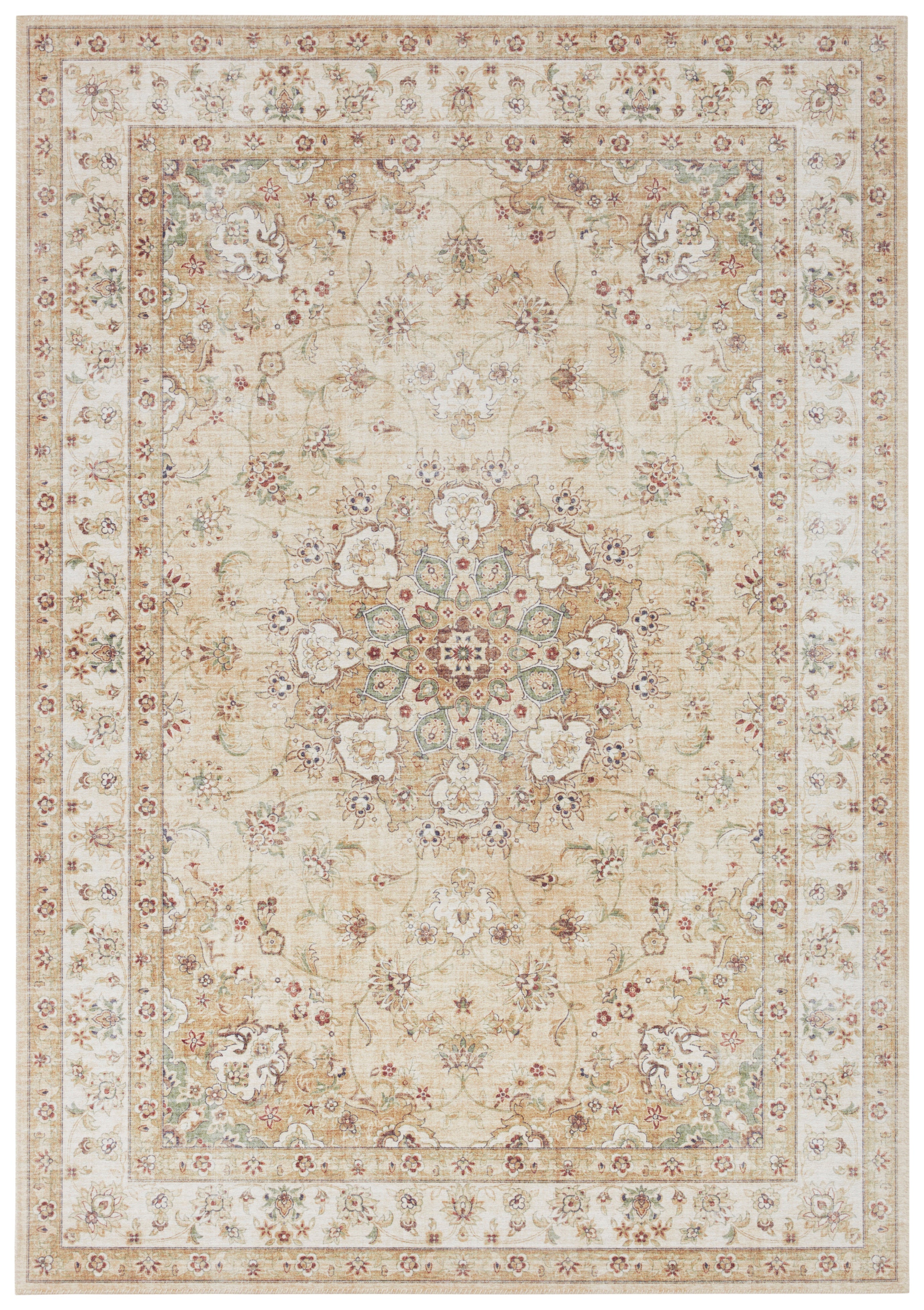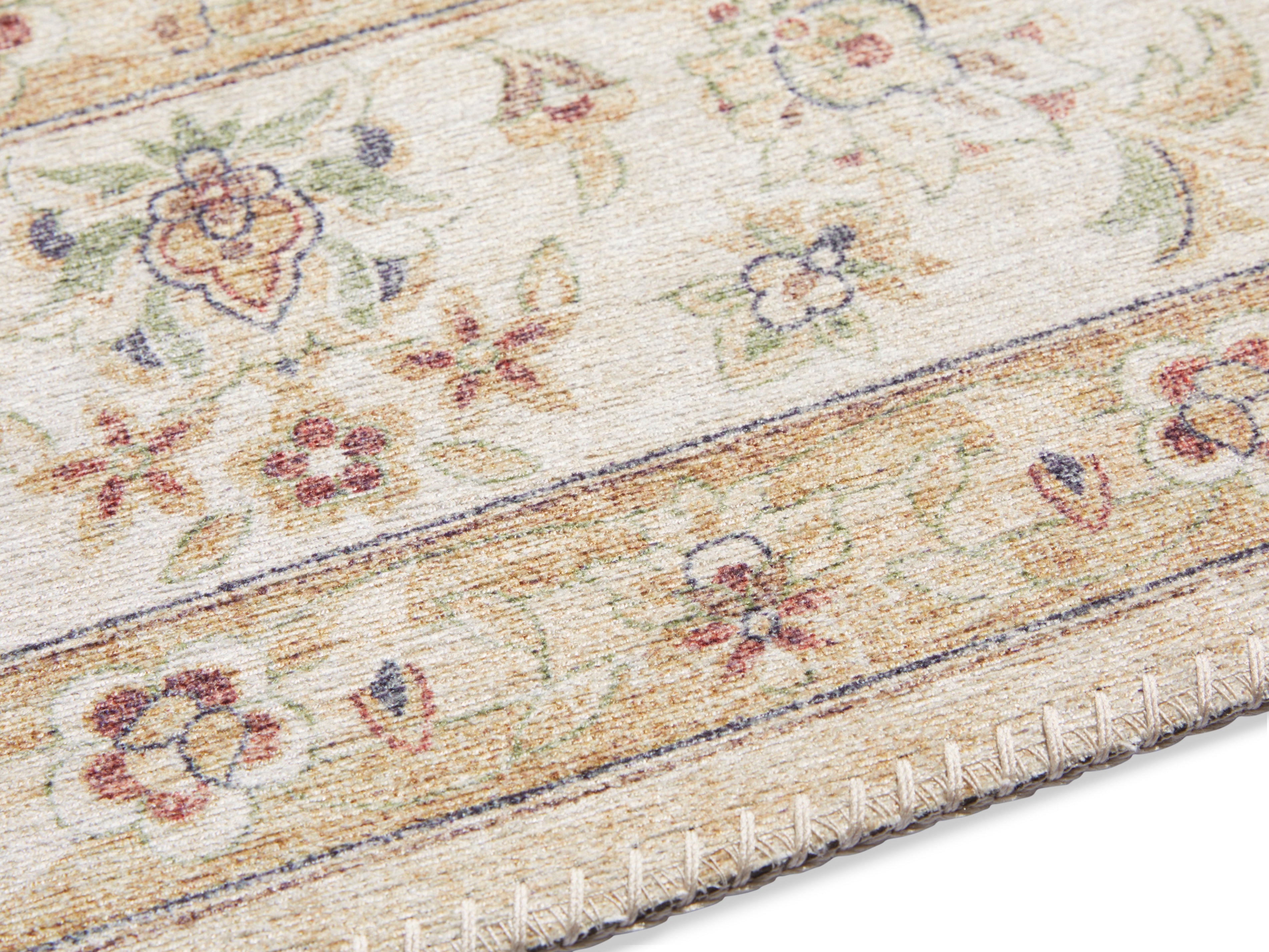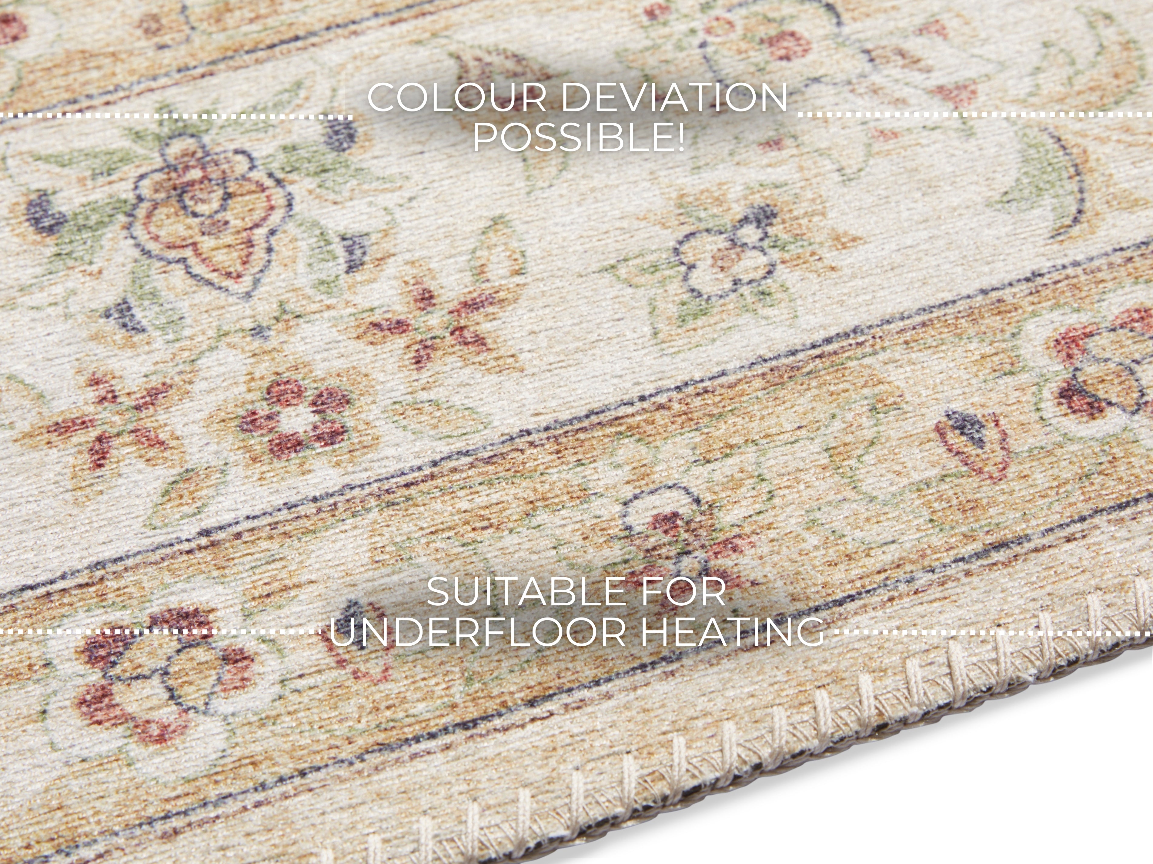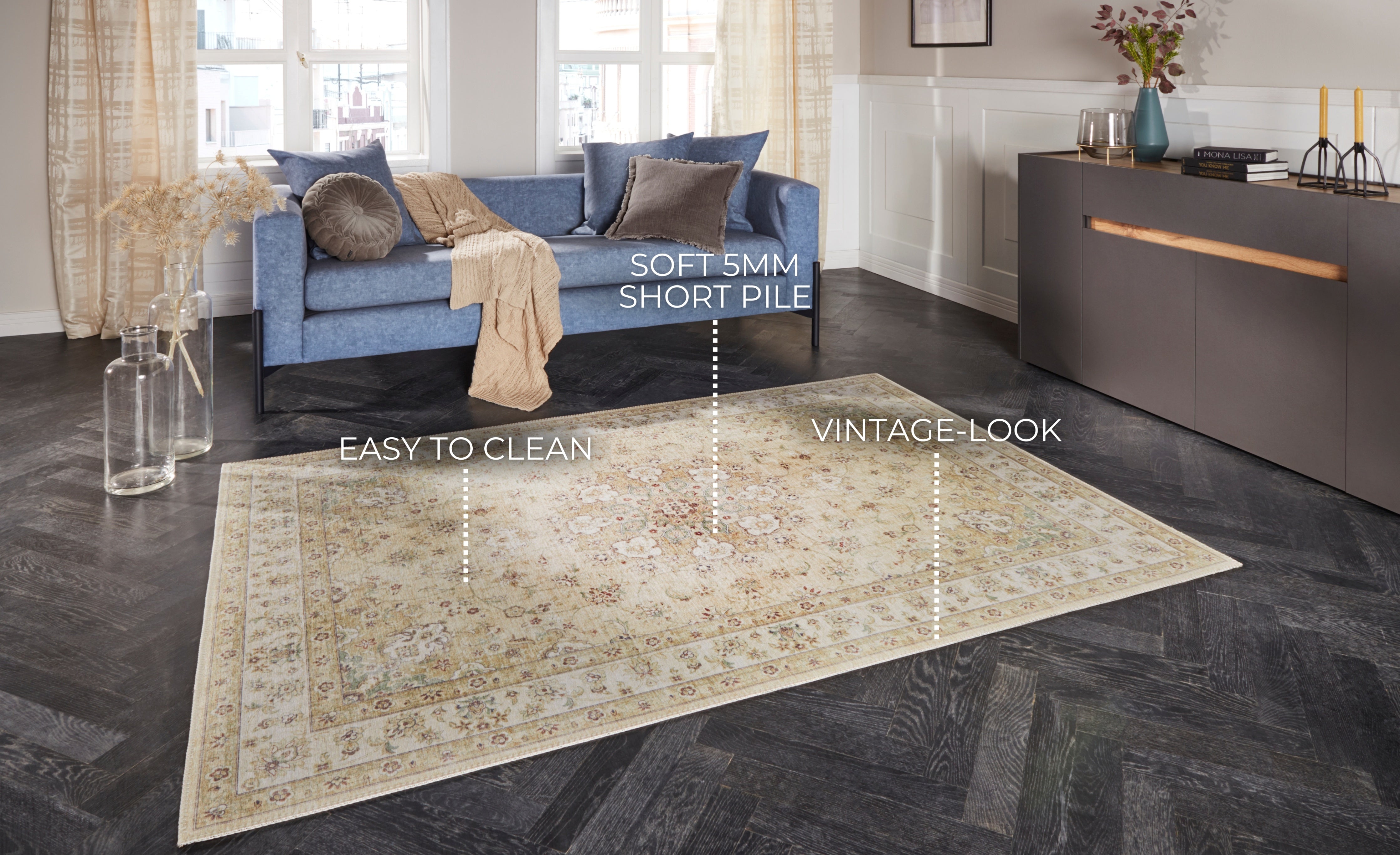 Den livlige gule farve kombineret med det smukke, orientalske mønster vil komplementere enhver moderne indretning. Den robuste overlock-kantafslutning, der matcher tæppets farve, sikrer lang holdbarhed og et elegant finish. Bagsiden i blødt bomuld giver ekstra komfort og beskytter dit gulv. Tæppet er desuden velegnet til gulvvarme, så du kan nyde dets blødhed året rundt.