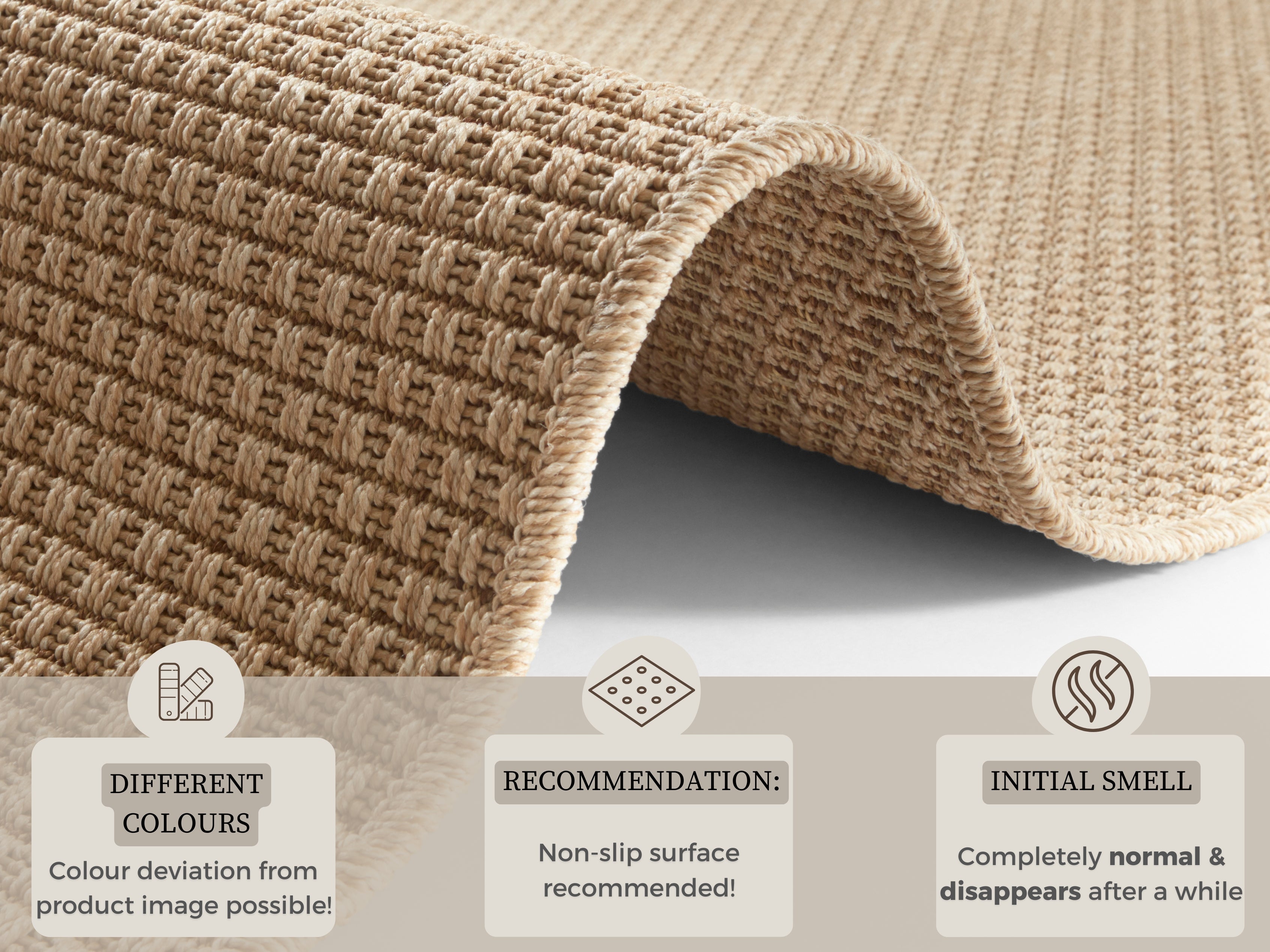 Skab en naturlig og indbydende atmosfære i dit hjem eller på din terrasse med dette smukke Nature-tæppe i en elegant beige farve. Det tidløse sisal-look tilføjer et stilfuldt og roligt præg til enhver indretning, uanset om det placeres i stuen, køkkenet eller i dit uderum. Dette tæppe er den ideelle løsning til dig, der ønsker at forene moderne æstetik med praktisk funktionalitet.