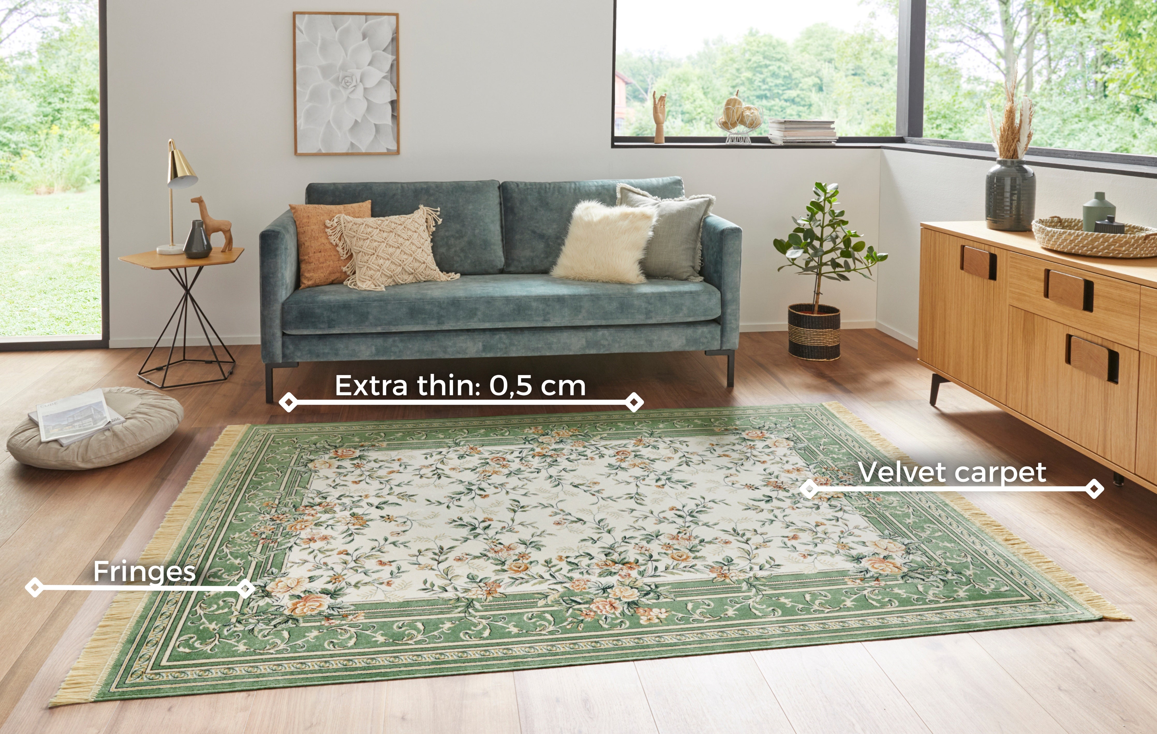 Naveh-tæppet er ikke kun smukt, men også praktisk. Den bløde, korte luv på kun 0.5 mm er let at rengøre og gør tæppet velegnet til alle gulvtyper, inklusive gulvvarme. Bagsiden i ren bomuld giver tæppet stabilitet og forhindrer det i at glide. Nyd den ekstra tynde profil, der gør tæppet nemt at placere under møbler uden at skabe ujævnheder. Med dette tæppe får du et kvalitetsprodukt, der er designet til at holde.
