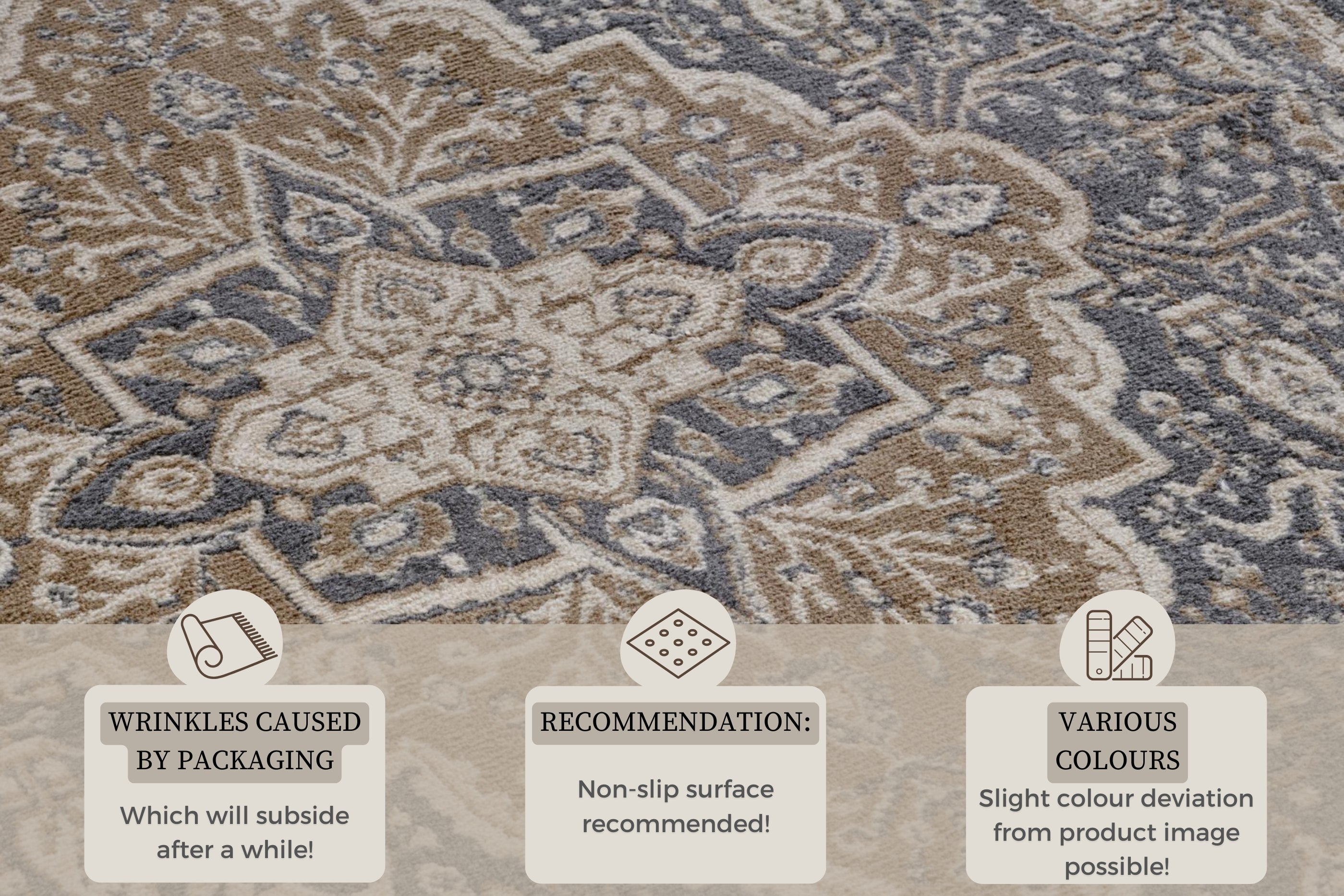 Tæppet er kendetegnet ved sin høje kvalitet og de slidstærke syntetiske fibre, der gør det ekstremt holdbart og let at holde pænt i hverdagen. Det er skabt til at modstå daglig brug, samtidig med at det bevarer sit smukke udtryk. Derudover er tæppet velegnet til alle typer gulve, herunder rum med undergulvsvarme.