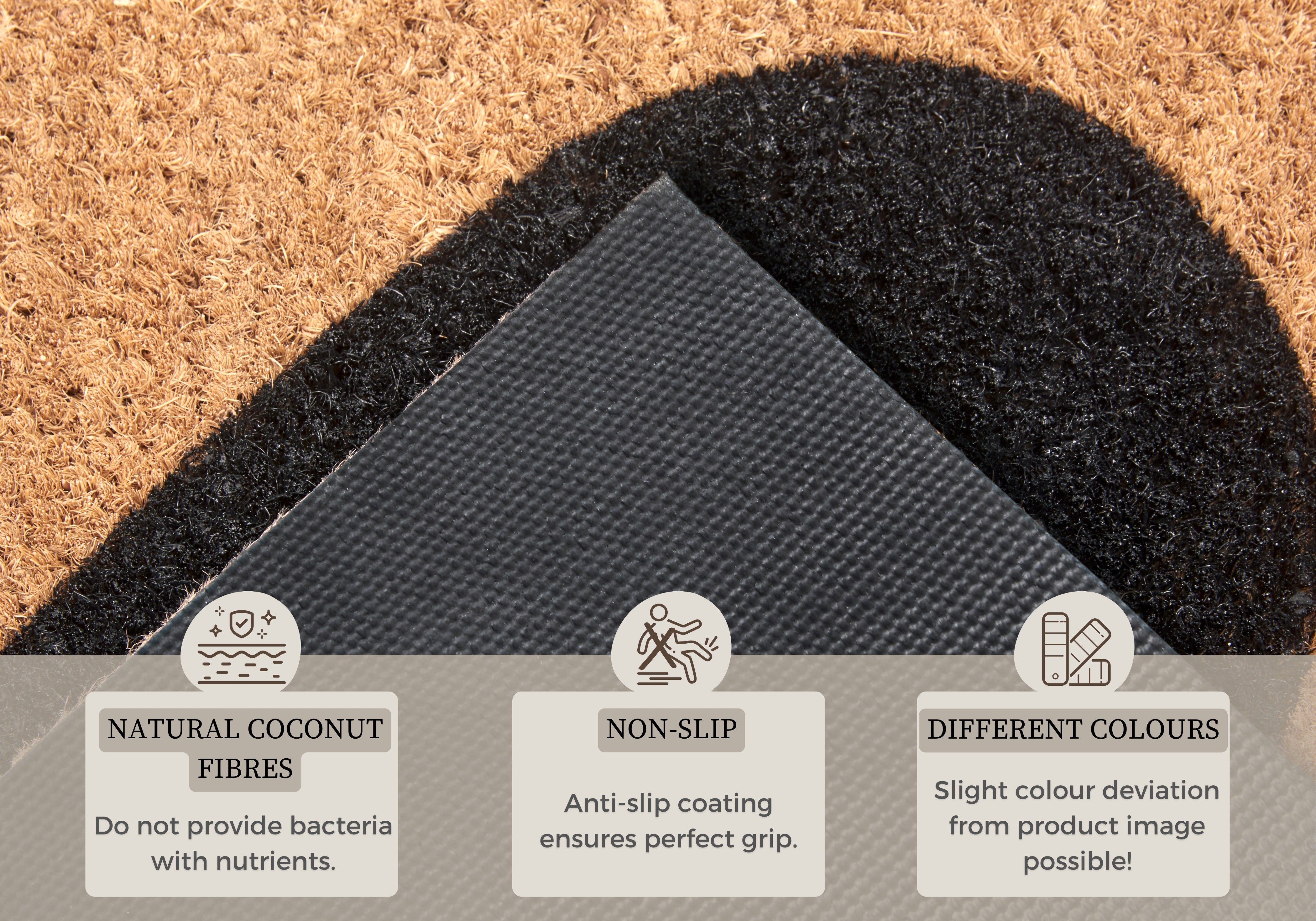 Kokosfibrene er ikke blot æstetisk tiltalende, de er også utroligt effektive til at fange snavs og bakterier. Den skridsikre latexbagside (100% latex) holder måtten sikkert på plads og forhindrer uheld, mens den samtidig beskytter dit gulv. Måtten er velegnet til både indendørs og beskyttet udendørs brug, hvilket gør den til en alsidig løsning til ethvert hjem. De naturlige kokosfibre giver ikke næring til bakterier, så snavs og bakterier forbliver på måtten og transporteres ikke ind i boligen. Den er nem at rengøre og vedligeholde.
