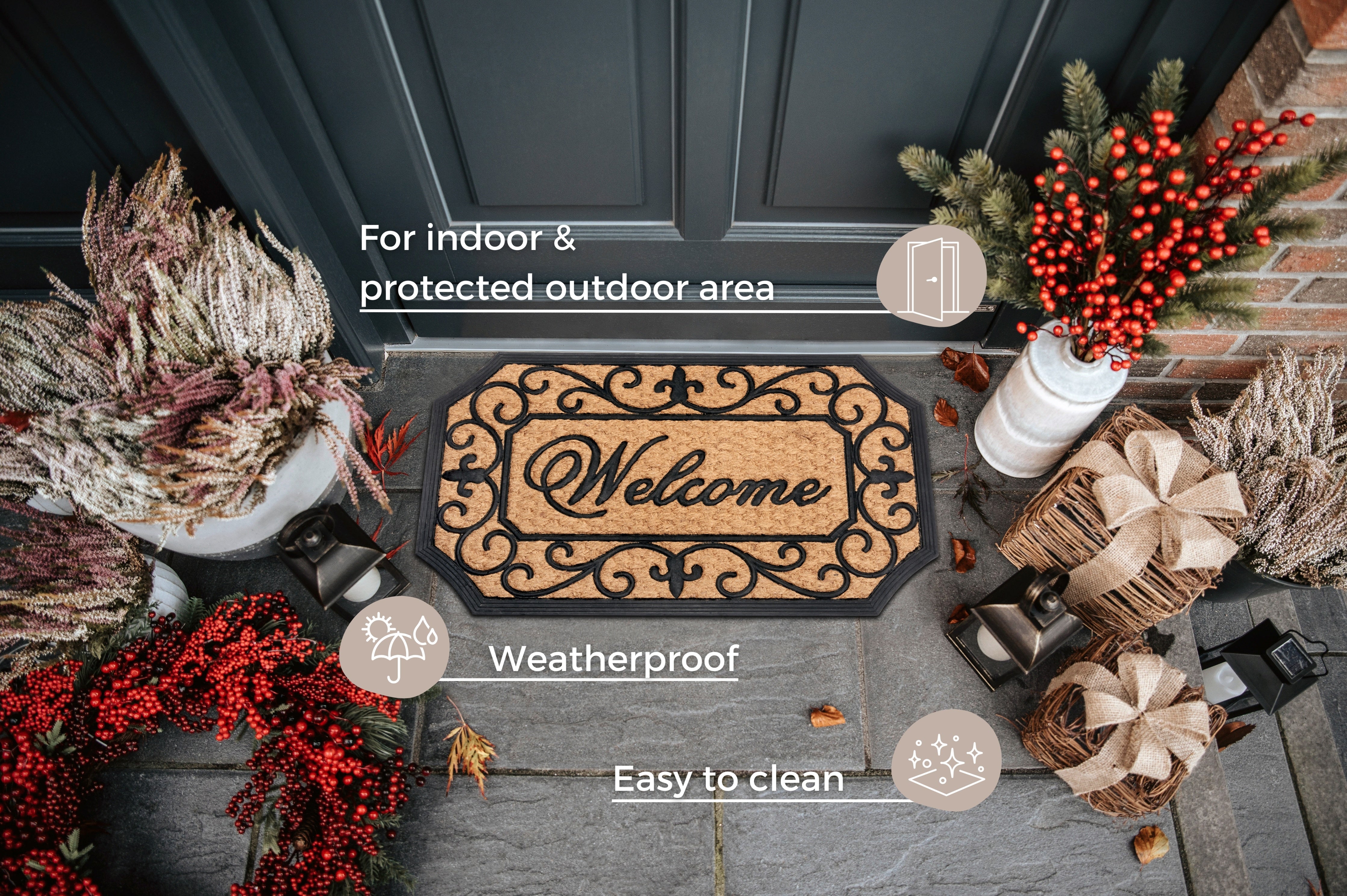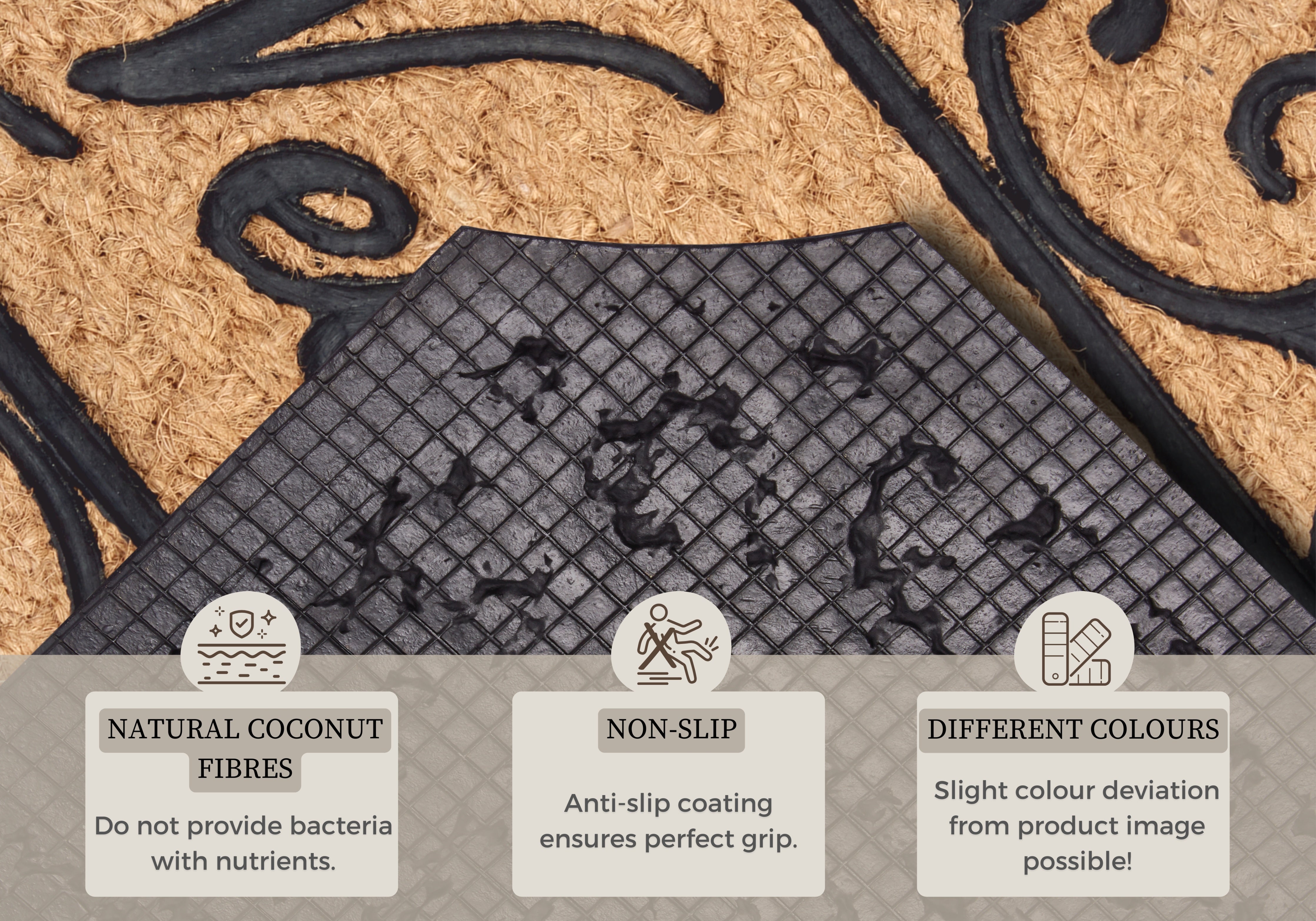 Kokosfibrene er naturligt bakteriehæmmende, da de ikke giver næring til bakterier. Snavs og bakterier forbliver på måtten og bliver ikke transporteret ind i boligen. Den skridsikre bagside af 100% gummi sørger for, at måtten ligger stabilt på gulvet og forhindrer uheld. Den slidstærke kombination af 50% kokos og 50% gummi garanterer lang holdbarhed, så du kan nyde din måtte i mange år. Den lette rengøring gør den praktisk i en travl hverdag – blot støvsug regelmæssigt.