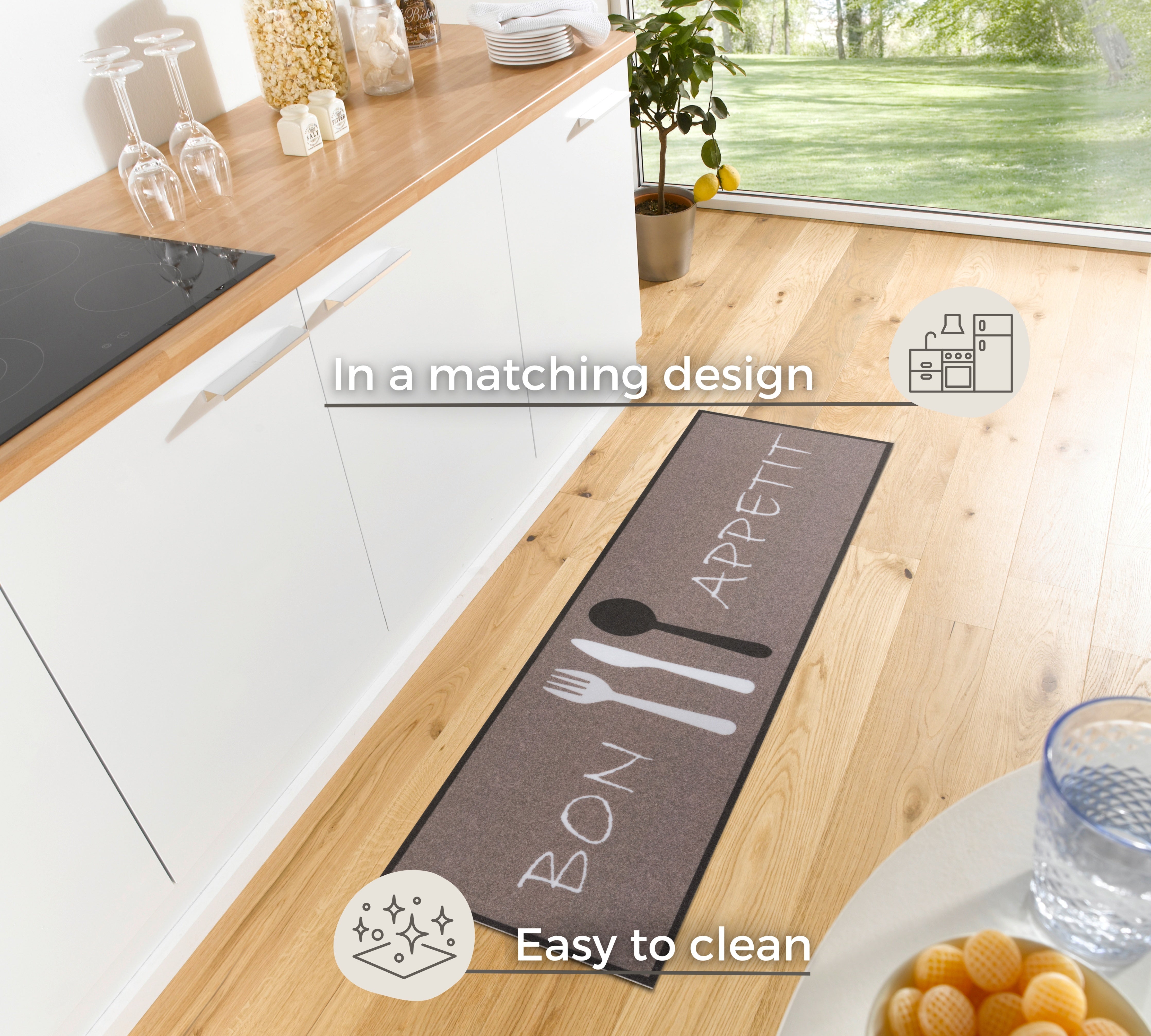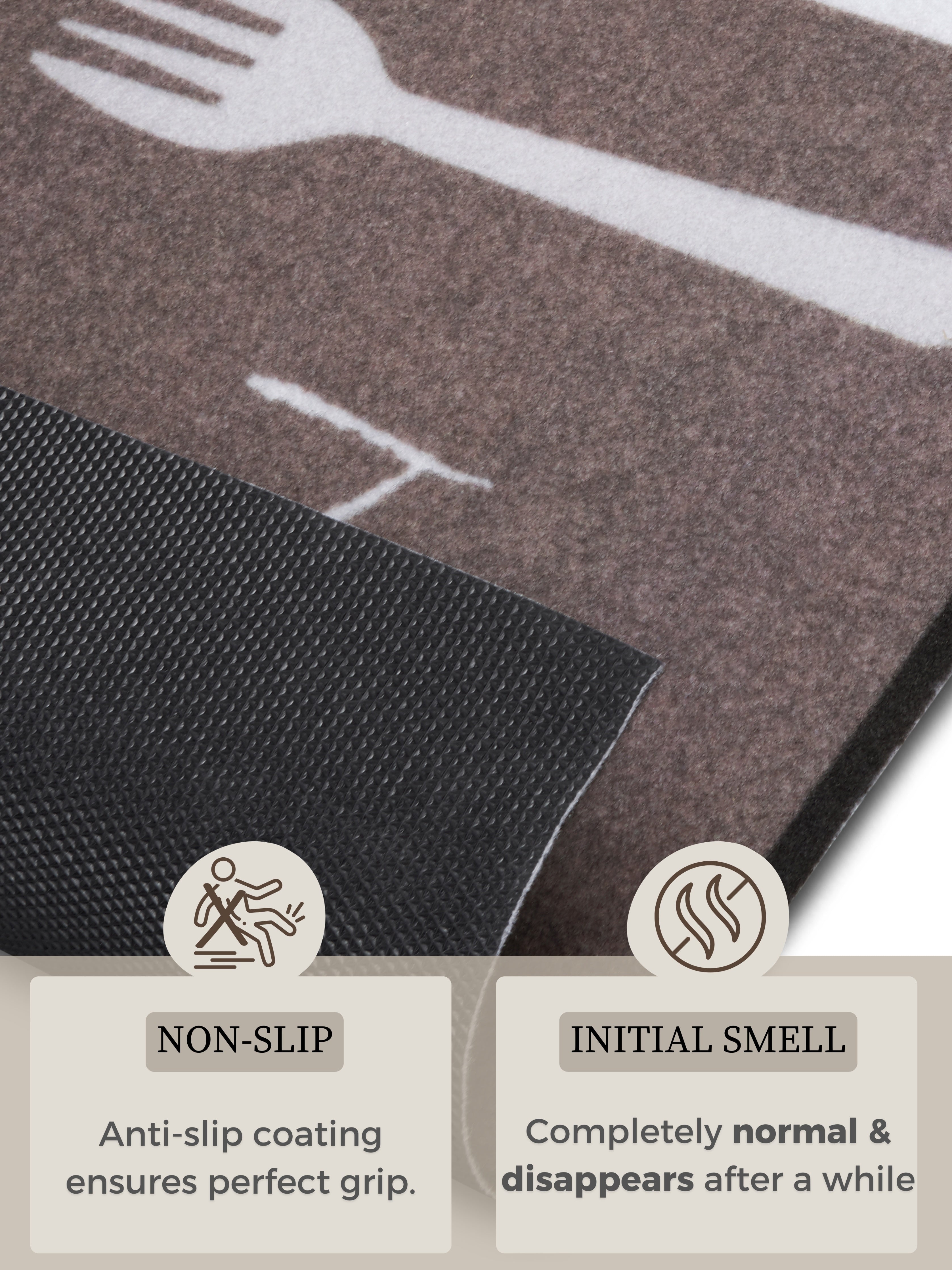 Cook&Clean tæppet er ikke kun smukt, men også praktisk. Den skridsikre bagside, bestående af 80% gummi og 20% latex, giver et sikkert fodfæste og forhindrer tæppet i at glide. Den solide konstruktion og de syntetiske fibre gør tæppet utroligt slidstærkt og nemt at rengøre, perfekt til travle hverdage. Det moderne design passer smukt ind i enhver indretning og er kompatibelt med gulvvarme, så du kan nyde komfort og stil året rundt.