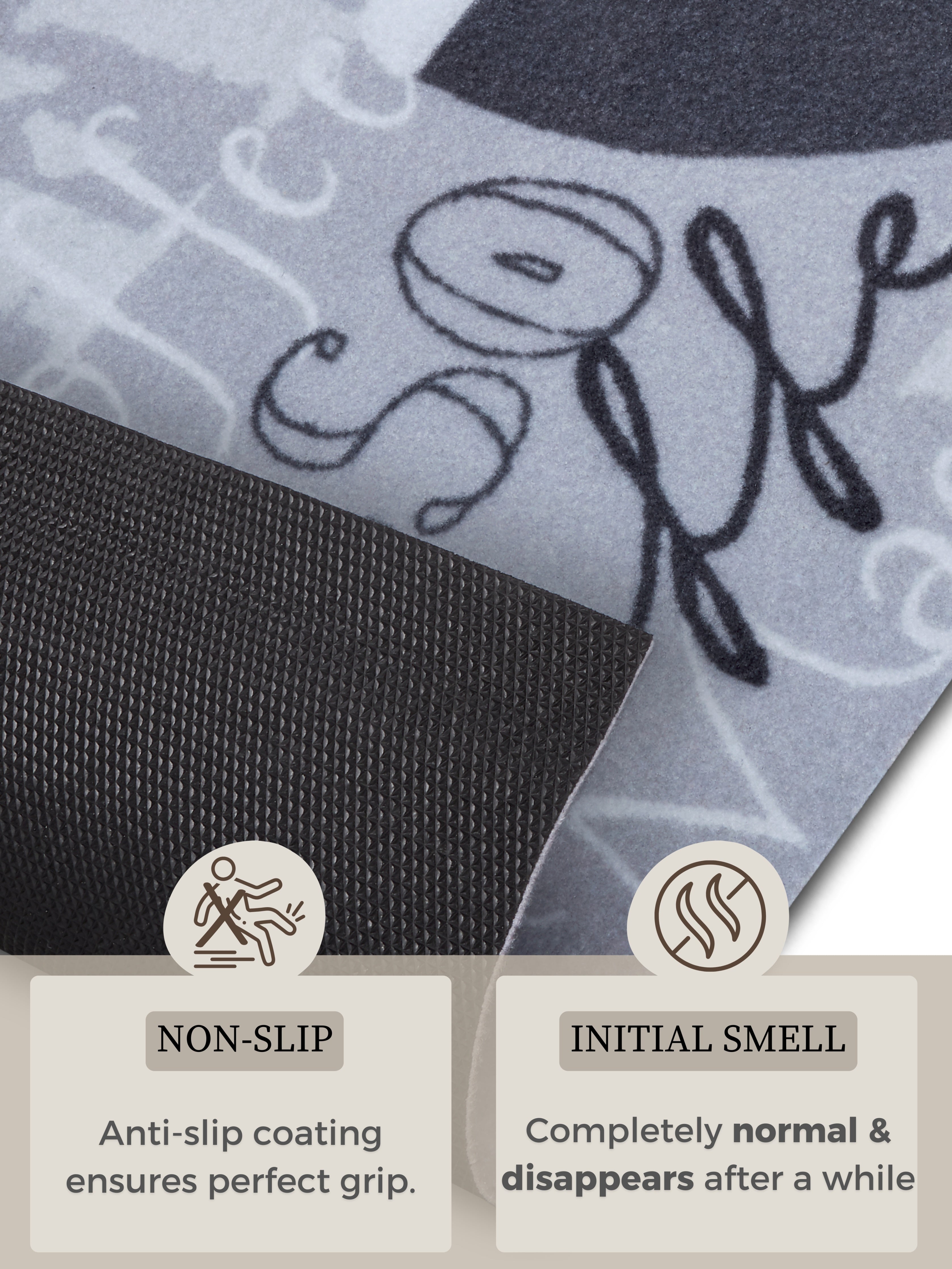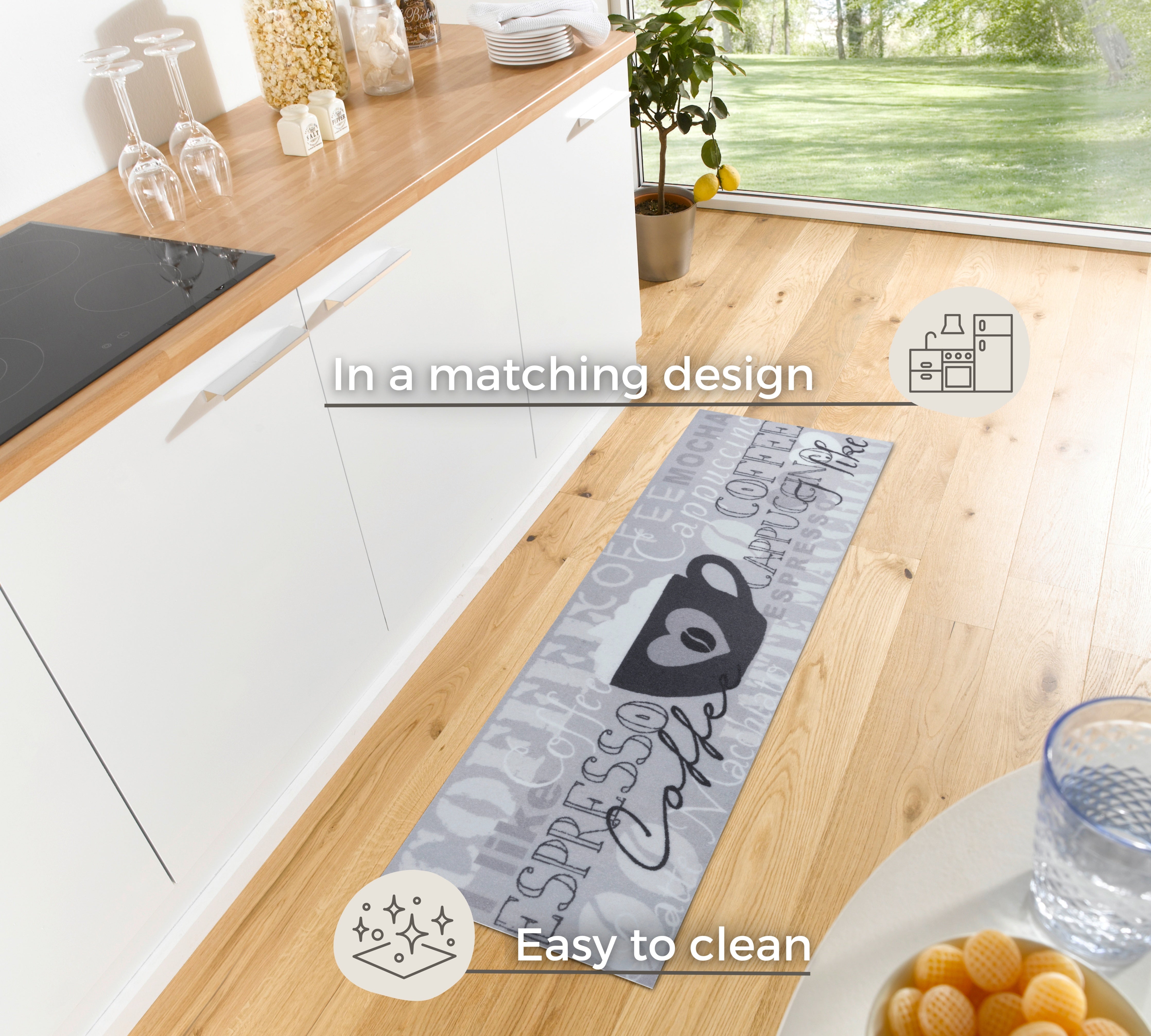 Cook&Clean tæppet er ikke bare smukt, det er også praktisk. Den skridsikre bagside, bestående af 80% gummi og 20% latex, sikrer et fast greb på gulvet og giver tryghed i hverdagen. Det slidstærke polyestermateriale er utrolig nemt at rengøre og vedligeholde, hvilket gør det ideelt til alle rum i hjemmet, også dem med gulvvarme. Den høje kvalitet og de syntetiske fibre sikrer et tæppe, der holder sig pænt i lang tid.