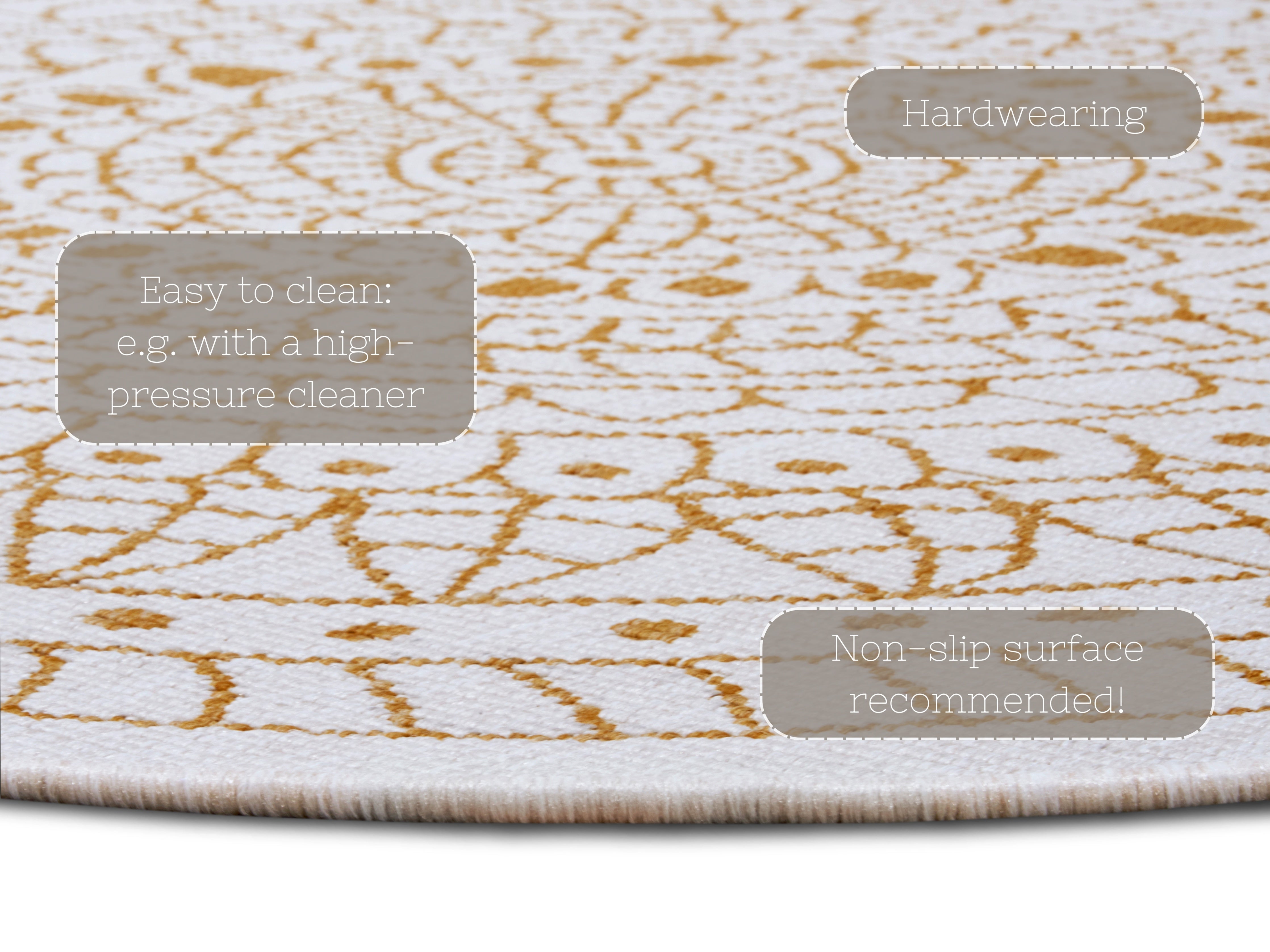 Med en luvhøjde på blot 0.5 mm tilbyder dette tæppe en behagelig og flad overflade, der er let at gå på. Rengøring er ligeledes enkel og kræver blot almindelig tæpperens. Skab et hyggeligt og stilfuldt uderum, eller giv din stue et strejf af boho-chic med dette praktiske og smukke tæppe.