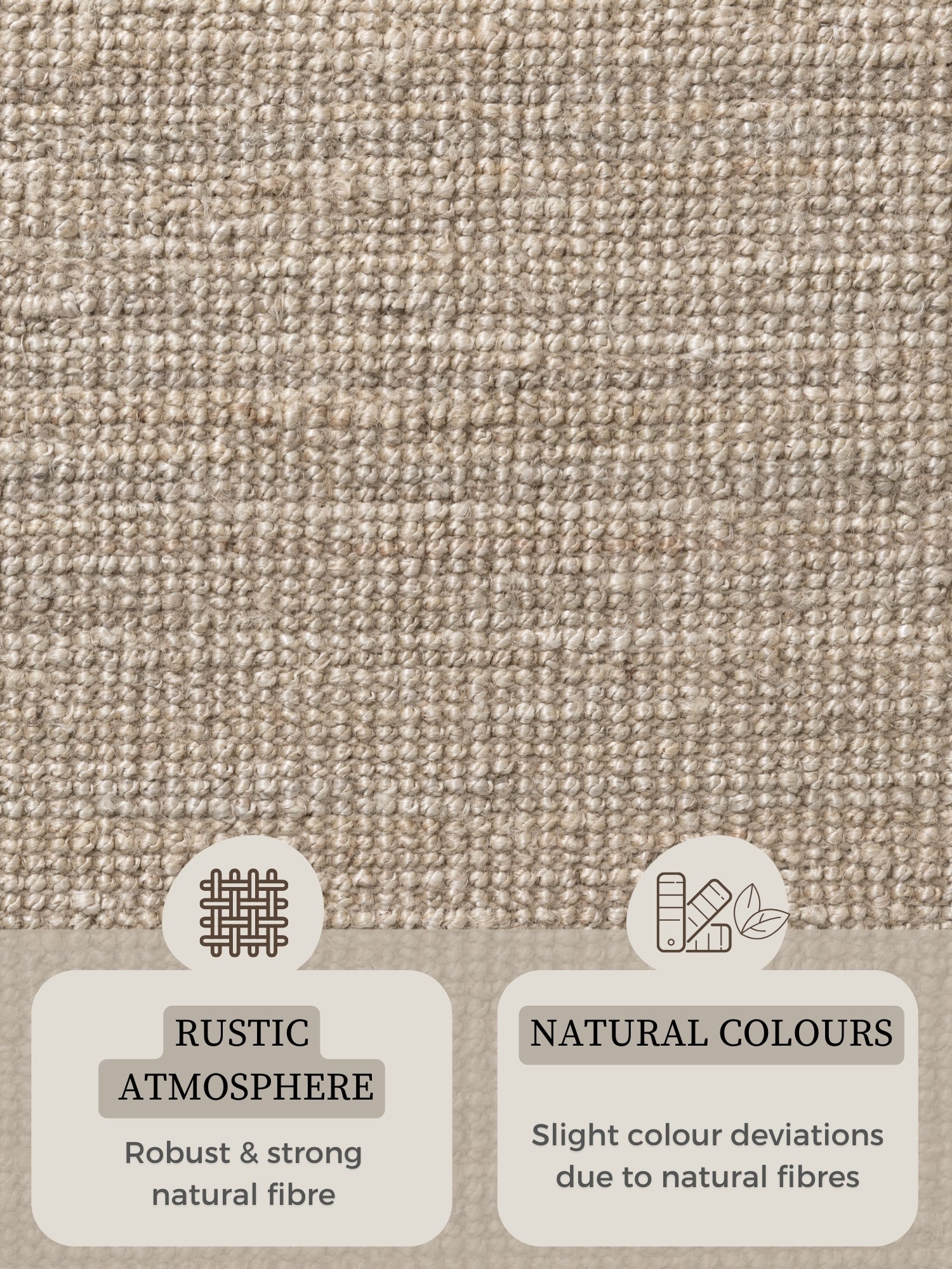 Bouclé-tæppets naturlige jutefibre gør det både robust og smudsafvisende, hvilket er perfekt til travle hjem. Det er også velegnet til gulvvarme, så du kan nyde dets bløde tekstur året rundt. Den tidløse jute giver tæppet et naturligt udseende, der passer ind i enhver indretning. Hvert tæppe er unikt i sin farvekonstellation på grund af de naturlige materialer, så små variationer i farven kan forekomme i forhold til billederne, hvilket kun tilføjer til tæppets charme og individualitet.