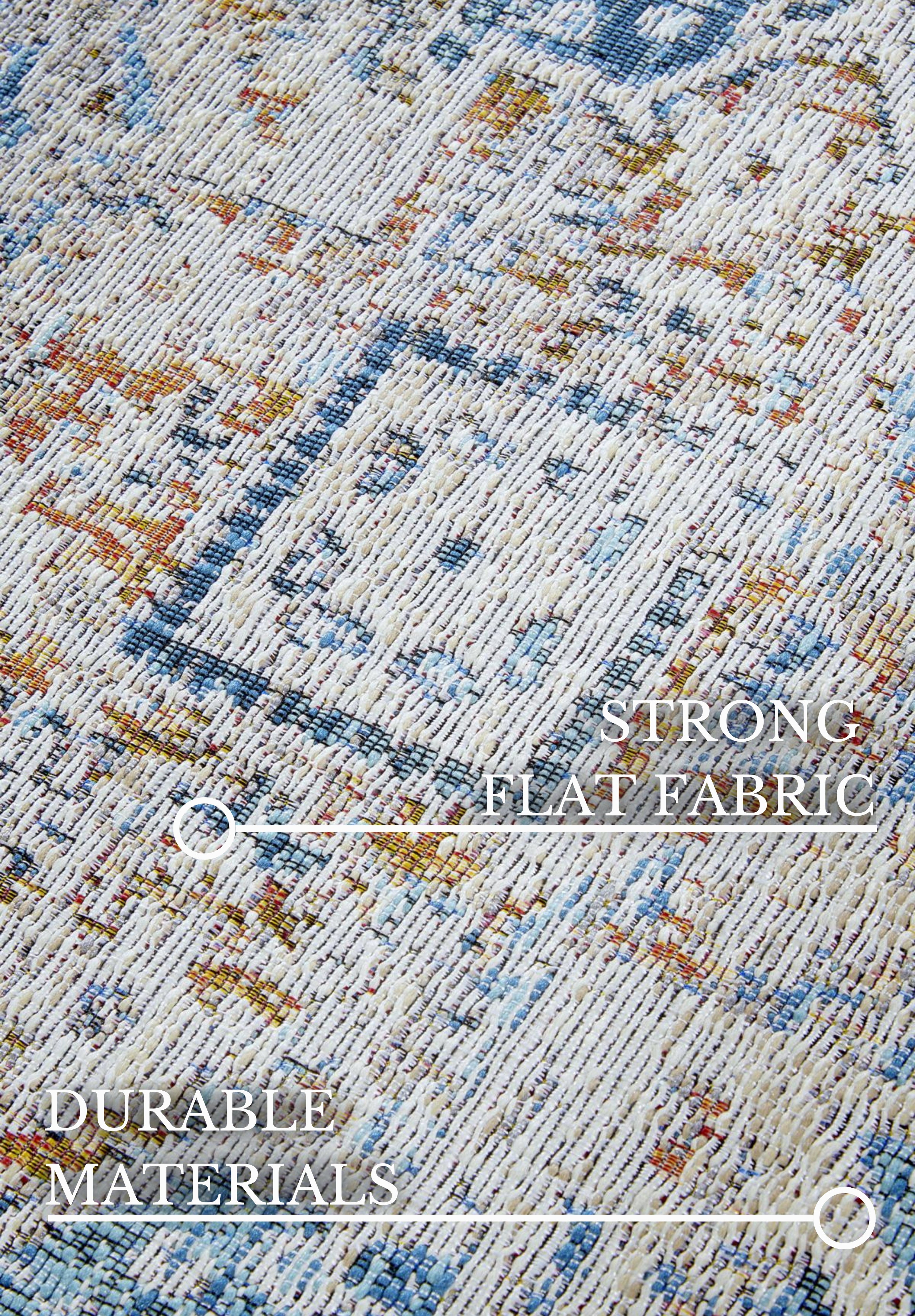Dette alsidige tæppe er designet til at klare både indendørs hygge og udendørs elementer. Den fladvævede konstruktion er robust, smudsafvisende, UV-bestandig og vejrbestandig, hvilket gør det perfekt til terrassen eller altanen. Den holdbare latexbagside (100%) giver stabilitet og forhindrer tæppet i at glide. Den 'chained' kantafslutning sikrer en elegant finish og bidrager til tæppets lange levetid. Tæppet er desuden egnet til gulvvarme, så du kan nyde komforten året rundt. De klare farver og robuste materialer gør det nemt at rengøre, så du kan bevare tæppets skønhed i mange år.