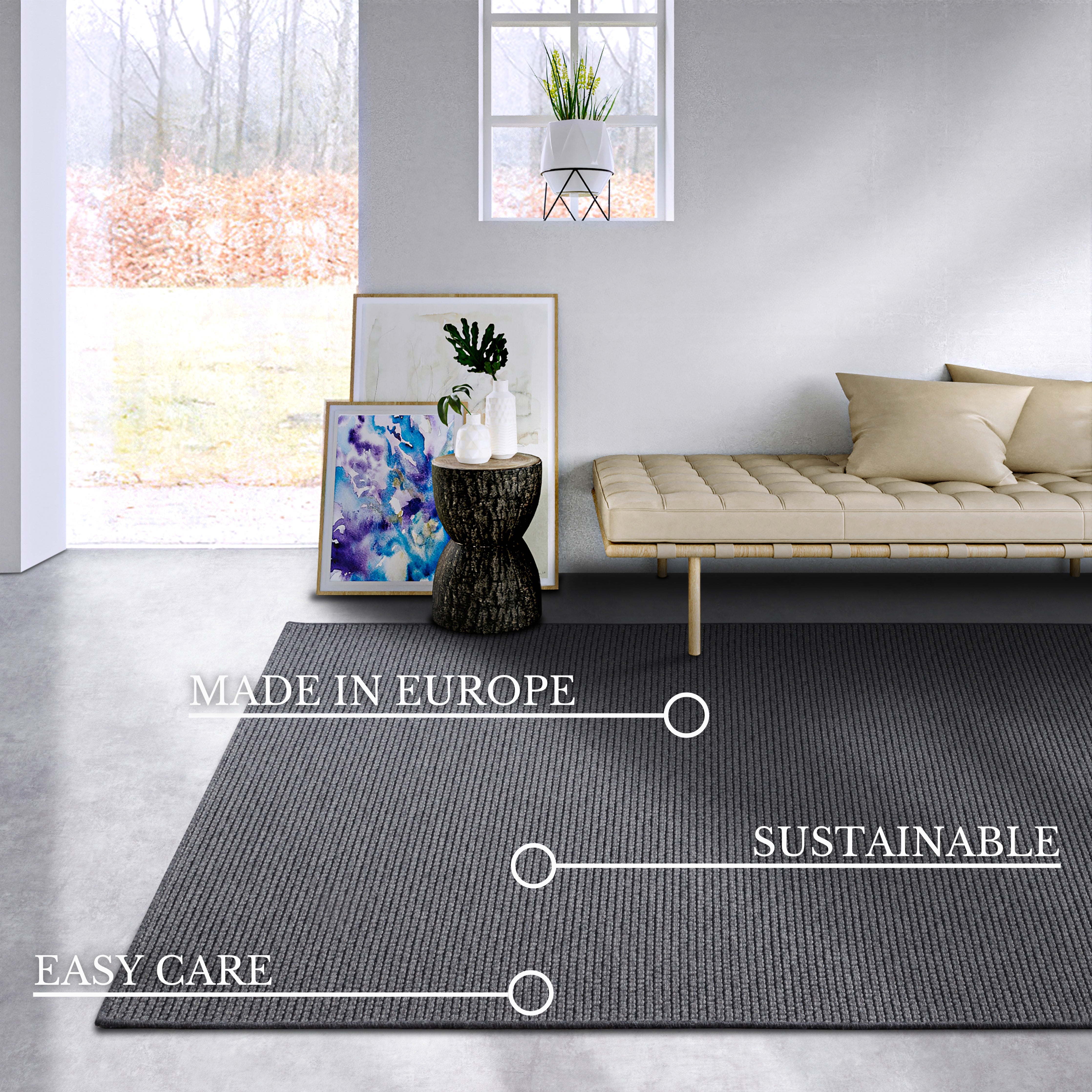 Dette tæppe er mere end bare smukt; det er også designet til at holde. Den slidstærke bagside, bestående af 51.4% polyester og 48.6% polypropylen (PP), giver tæppet stabilitet og forlænger dets levetid. Den naturlige uld er robust og nem at vedligeholde, samtidig med at den føles blød og behagelig under fødderne. Tæppet er også velegnet til gulvvarme, så du kan nyde den luksuriøse fornemmelse af uld året rundt. Hvert tæppe er unikt i sin farvesammensætning takket være de naturlige materialer, hvilket giver dit hjem et personligt præg af eksklusivitet. Det er fremstillet i Europa med fokus på bæredygtighed og naturlige farver, der passer til enhver indretningsstil.