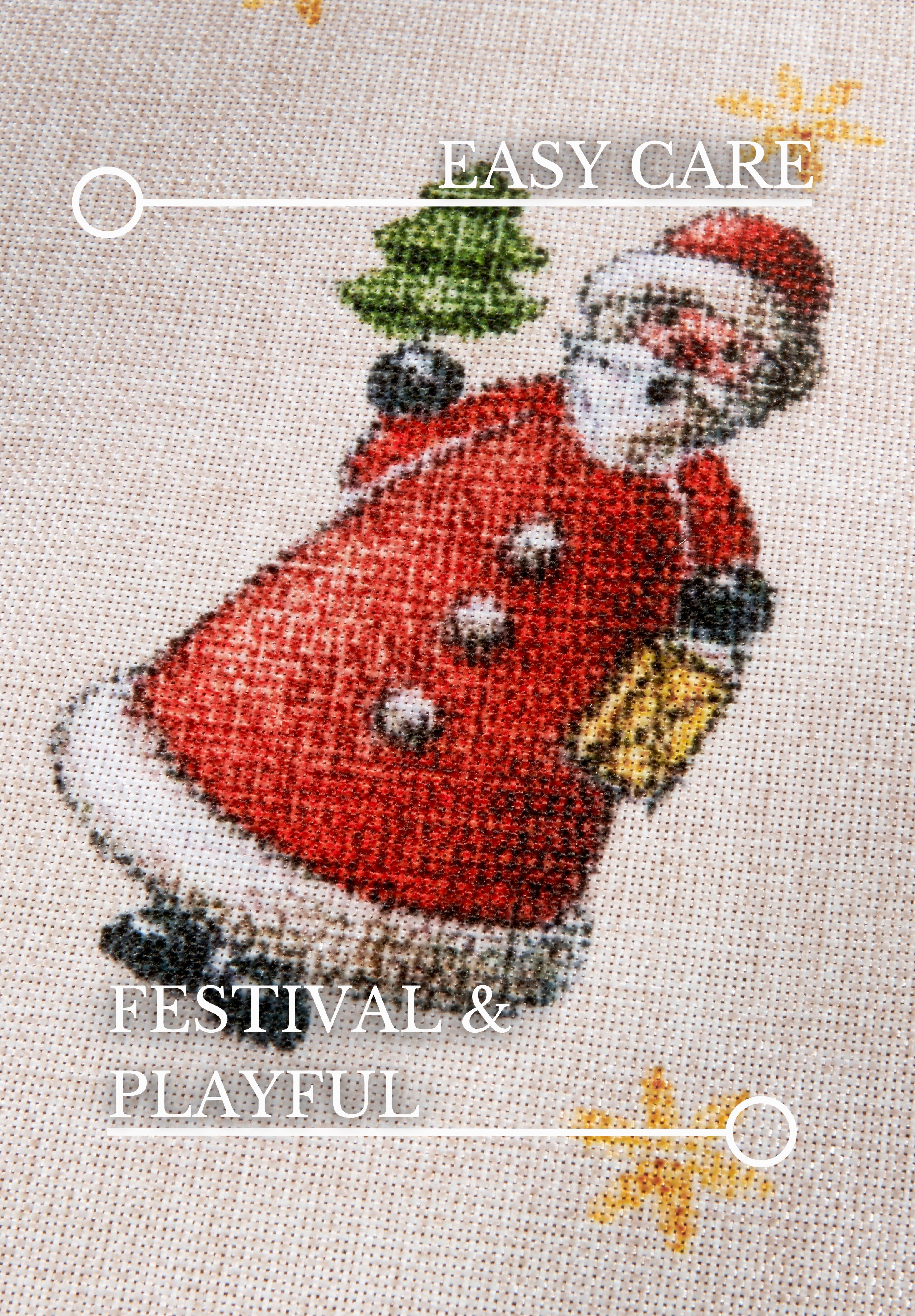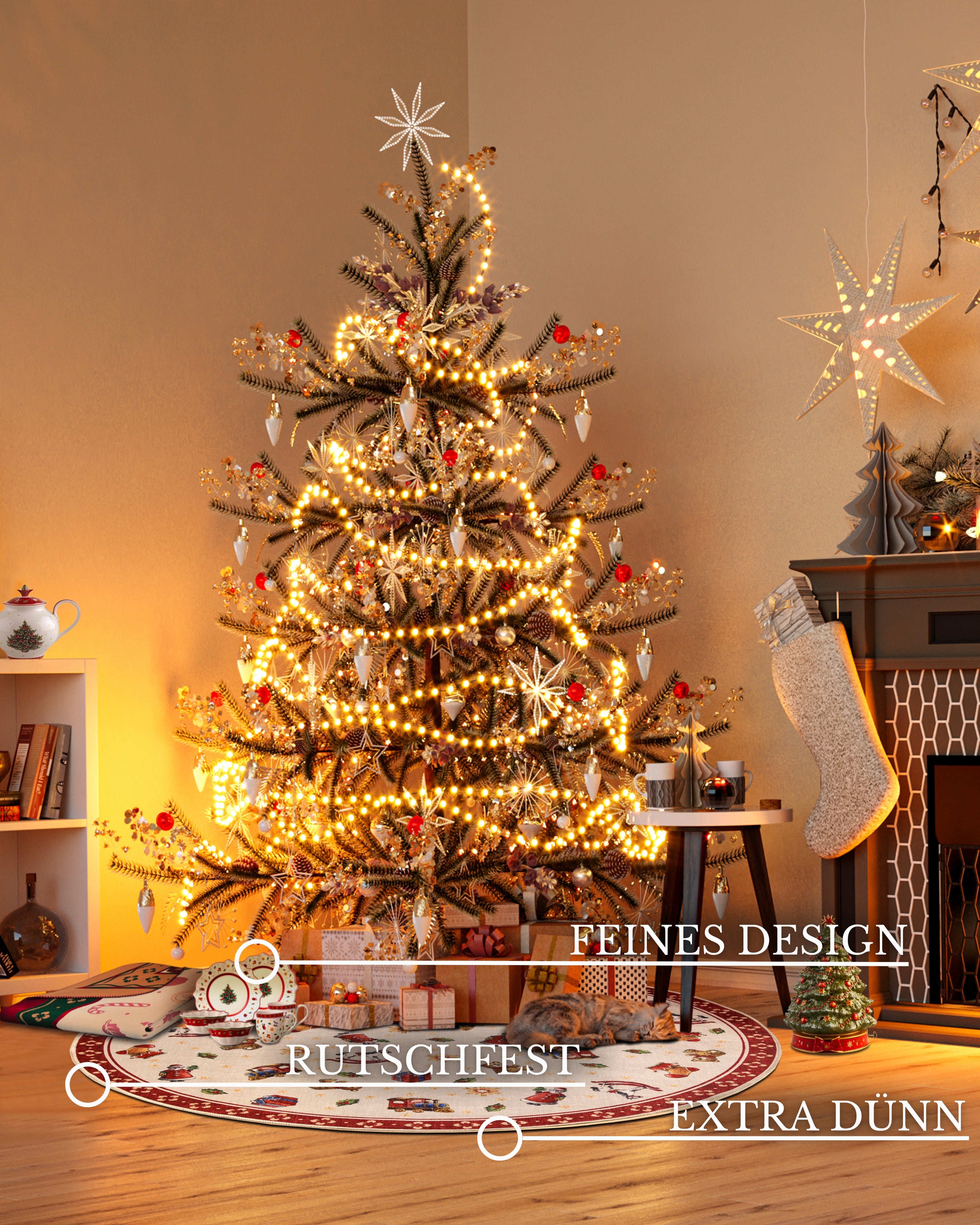 Udover det smukke design byder tæppet på praktiske fordele. Bagsiden i 100% TPR giver et skridsikkert underlag, der sikrer tryghed for de små, ikke kun omkring juletræet. Den robuste "chained" kantning bidrager til tæppets holdbarhed og forhindrer, at det flosser. Det slidstærke materiale af syntetiske fibre gør tæppet nemt at rengøre, så du kan bevare dets smukke udseende i mange år.