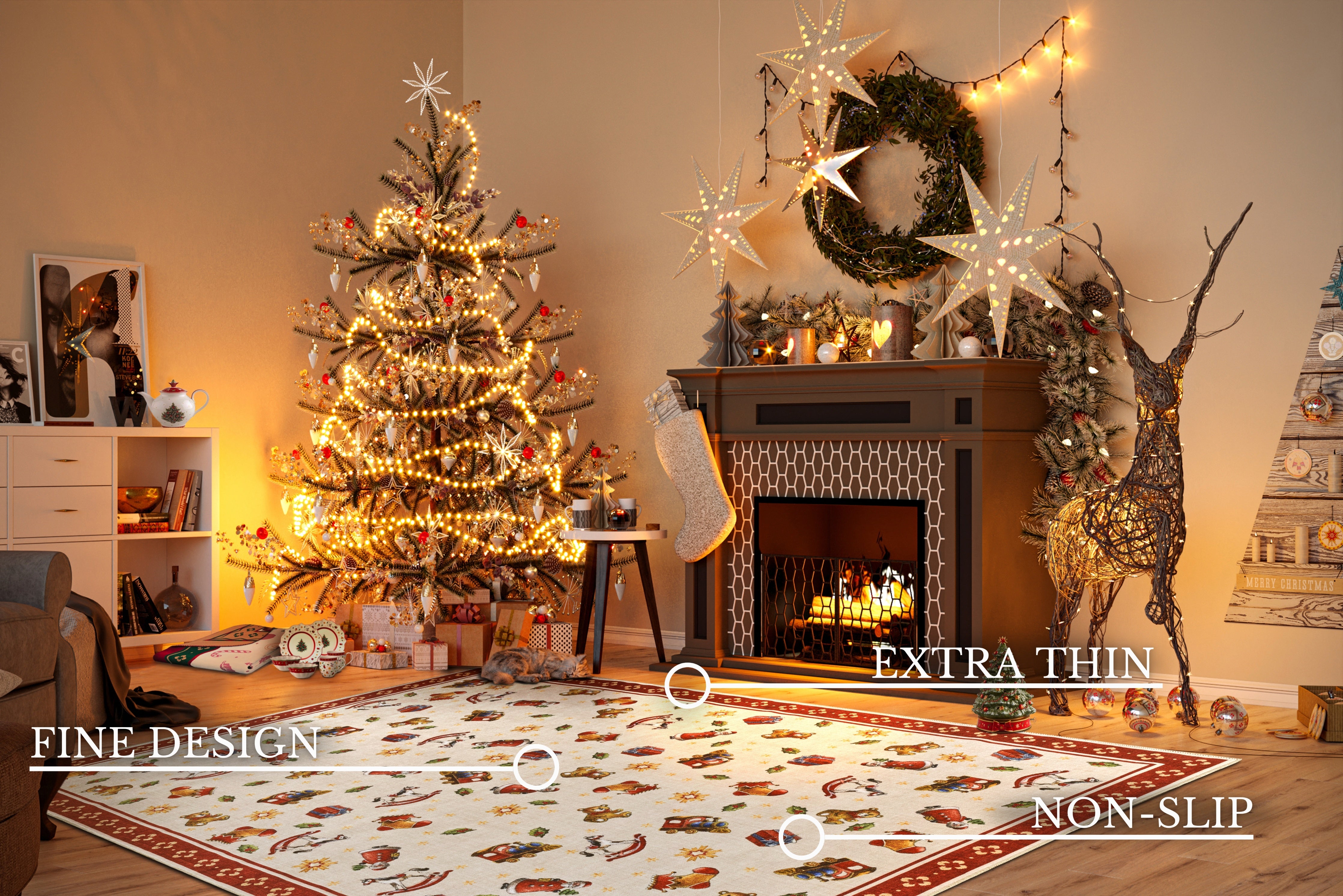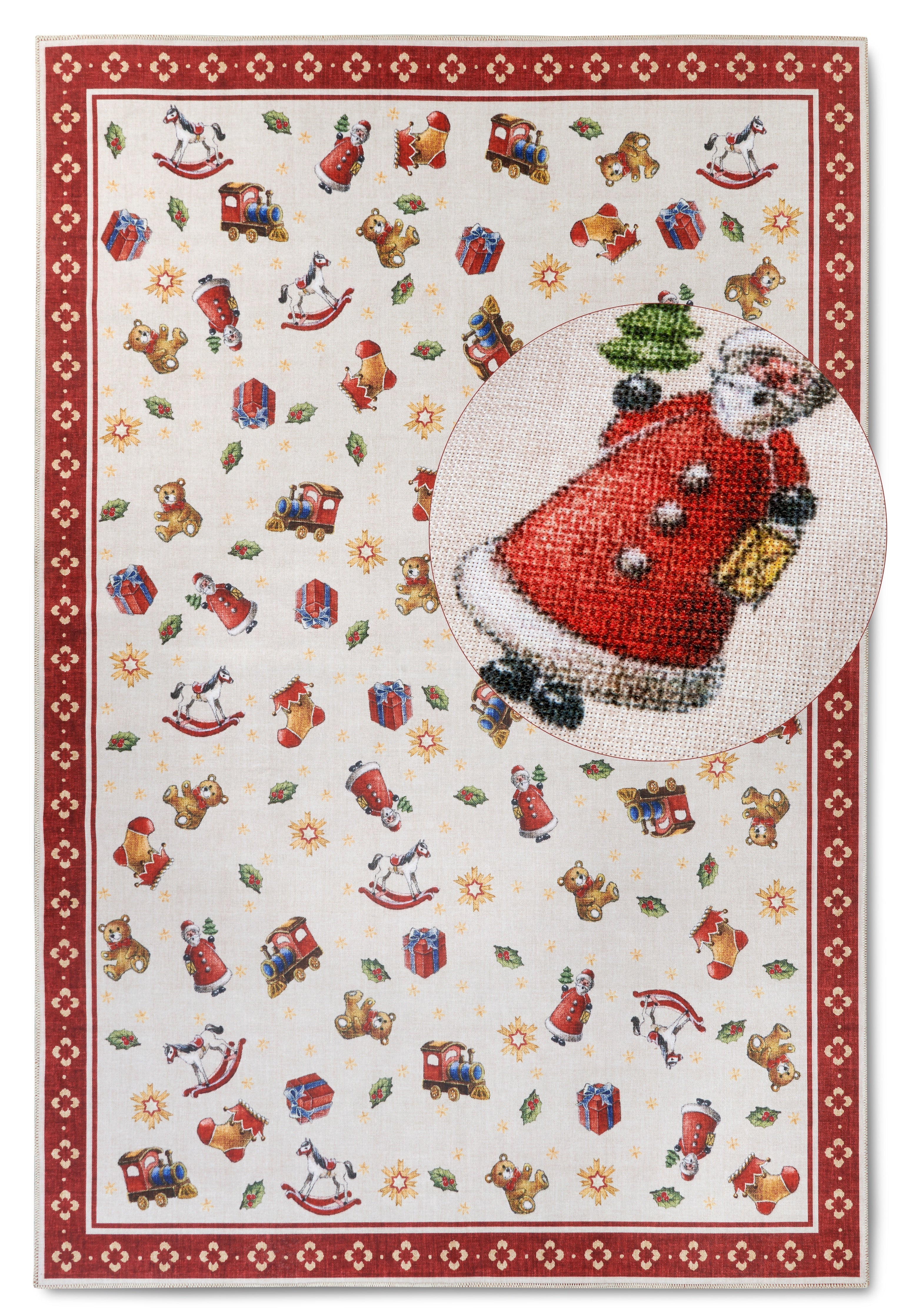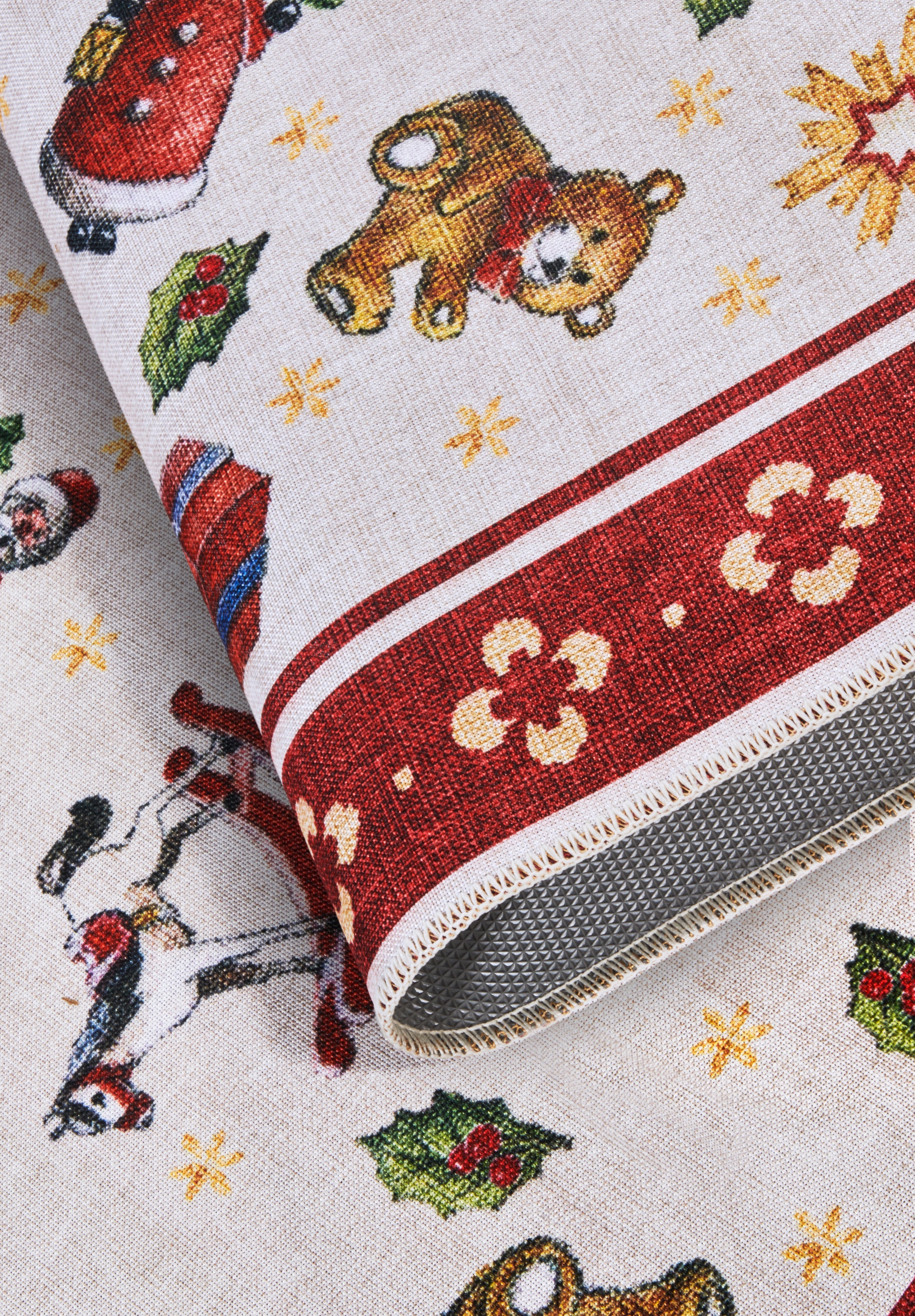 Det skridsikre TPR-bagside giver tryghed og stabilitet, så de små kan lege frit uden bekymringer. Den robuste, "chained" kantafslutning sikrer tæppets holdbarhed og forhindrer, at det trevler op. Tæppets slidstærke syntetiske fibre gør det nemt at rengøre, hvilket er en stor fordel i en travl hverdag. Nyd den festlige stemning uden bekymringer!
